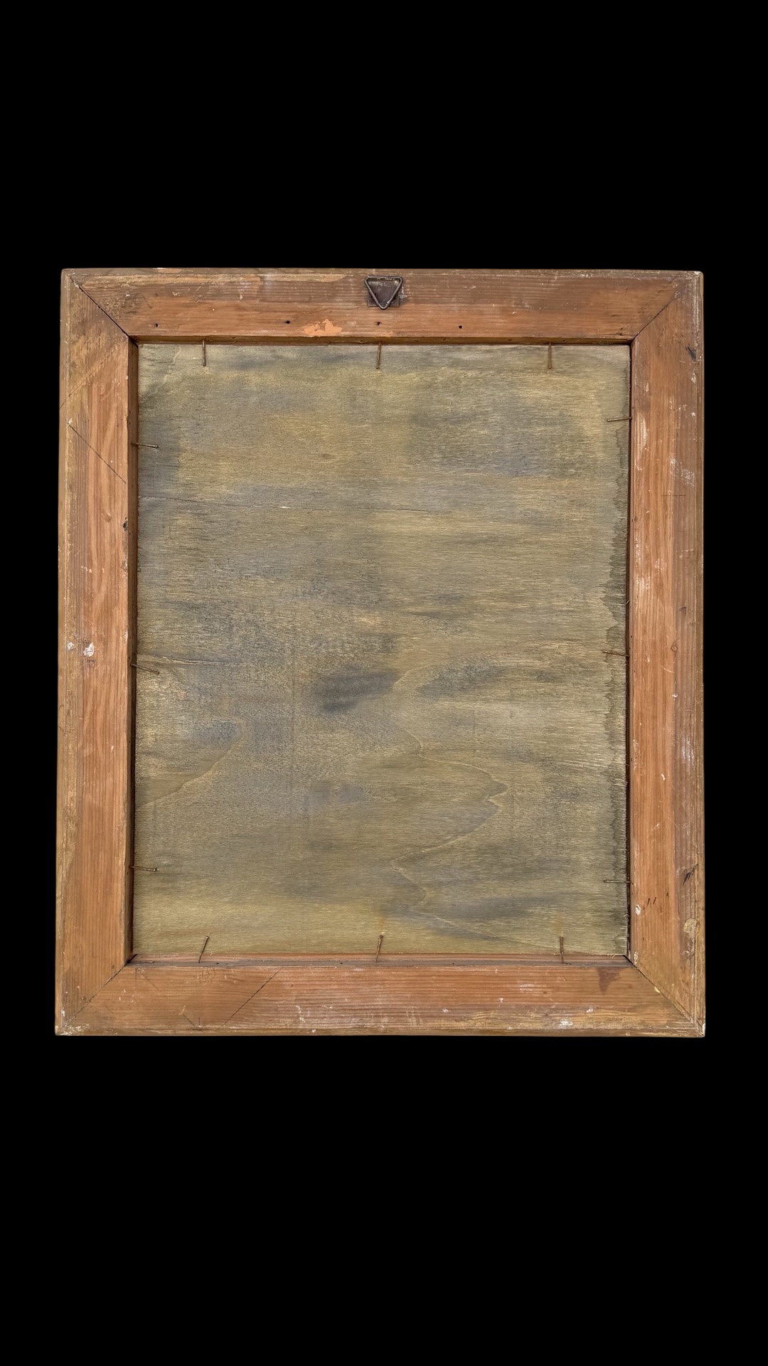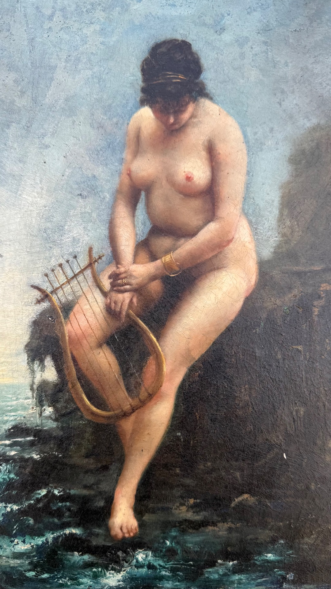 Dipinto olio su cartoncino raffigurante figura femminile nuda con lira.Cm 42,5x35,5. Dipinto:cm 31x24.