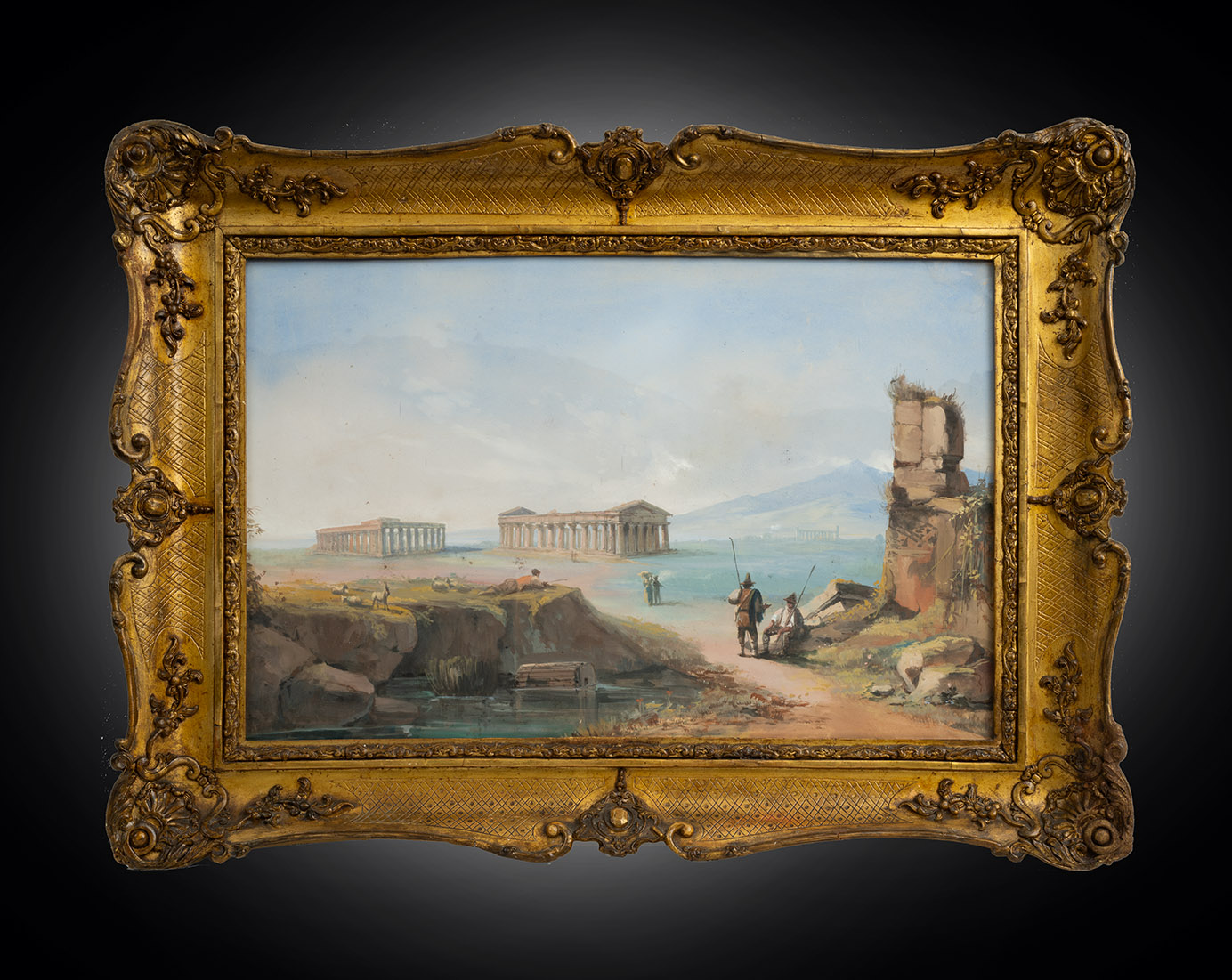 Il dipinto raffigurante i templi di Paestum mostra in primo piano delle figure in prossimità di un piccolo laghetto affiancato da rovine.