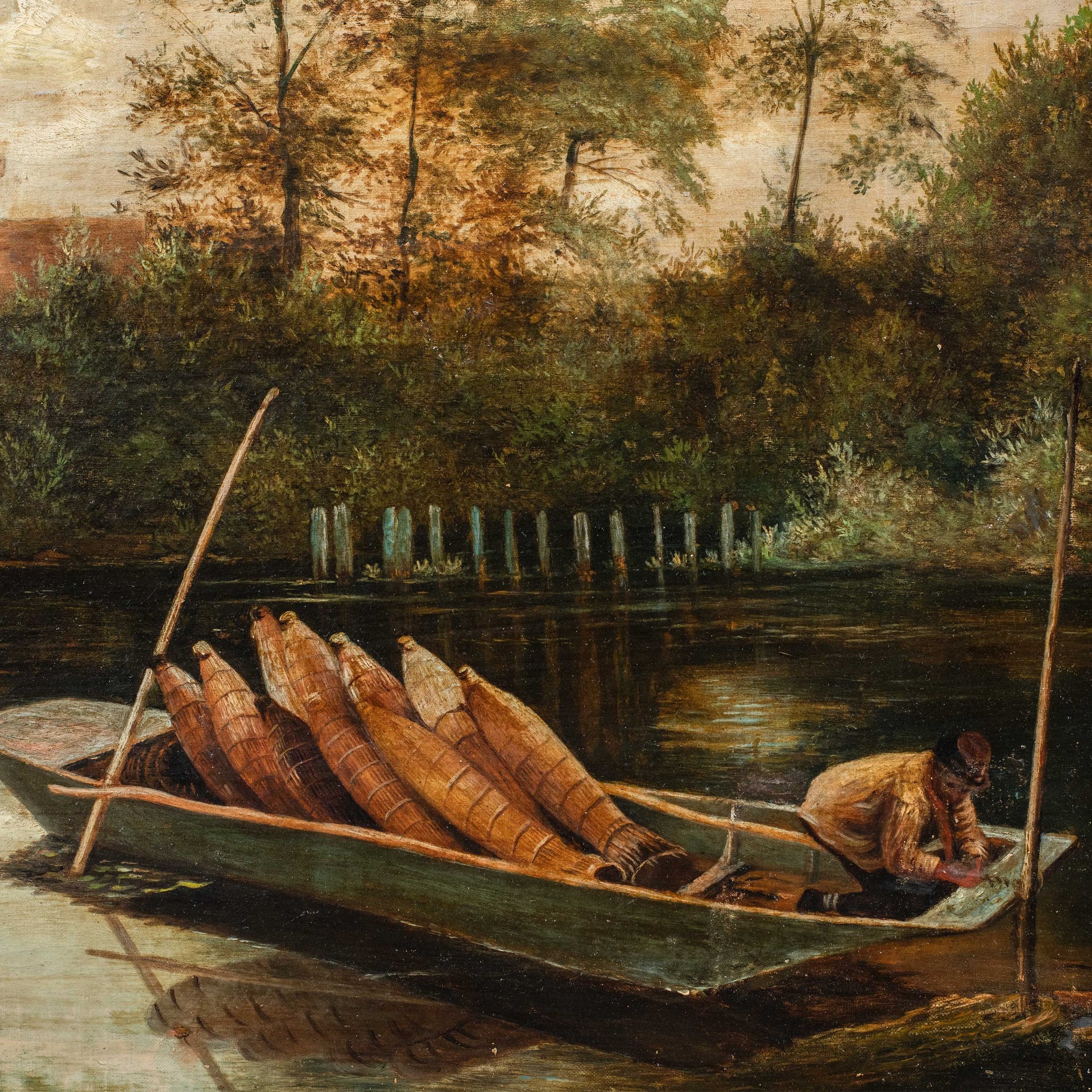 Pittore inglese (fine XIX sec.) - Paesaggio fluviale con barca. 41 x 61 cm senza cornice, 49 x 70 cm con cornice. Dipinto antico ad olio su tela, in cornice in legno dorato. Condition report: Tela originale. Buono stato di conservazione della superficie pittorica, sono presenti segni di...