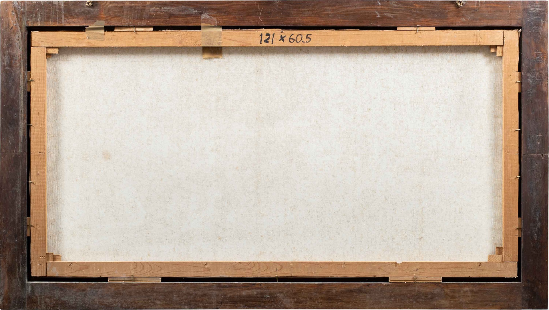 Pittore italiano (XIX-XX sec.) - Paesaggio fluviale con bosco e cittadina. 60.5 x 120 cm senza cornice, 76 x 135.5 cm con cornice. Dipinto antico ad olio su tela, in cornice in legno intagliato e dorato. Condition report: Buono stato di conservazione della superficie pittorica. - Tutte le...