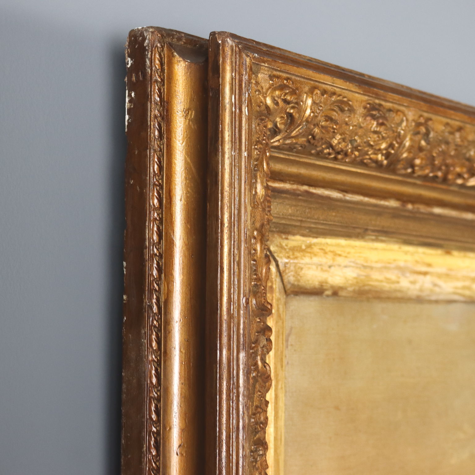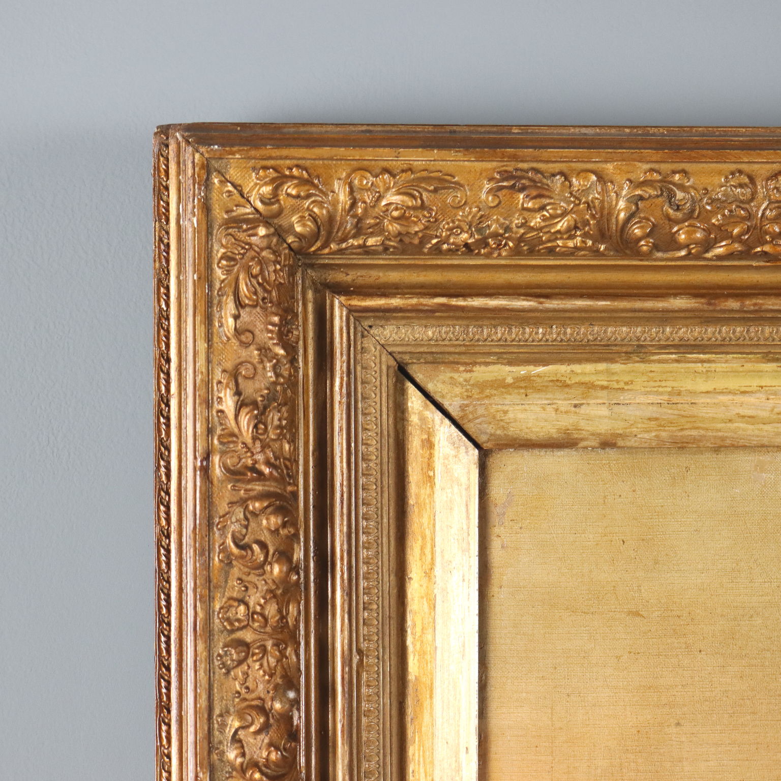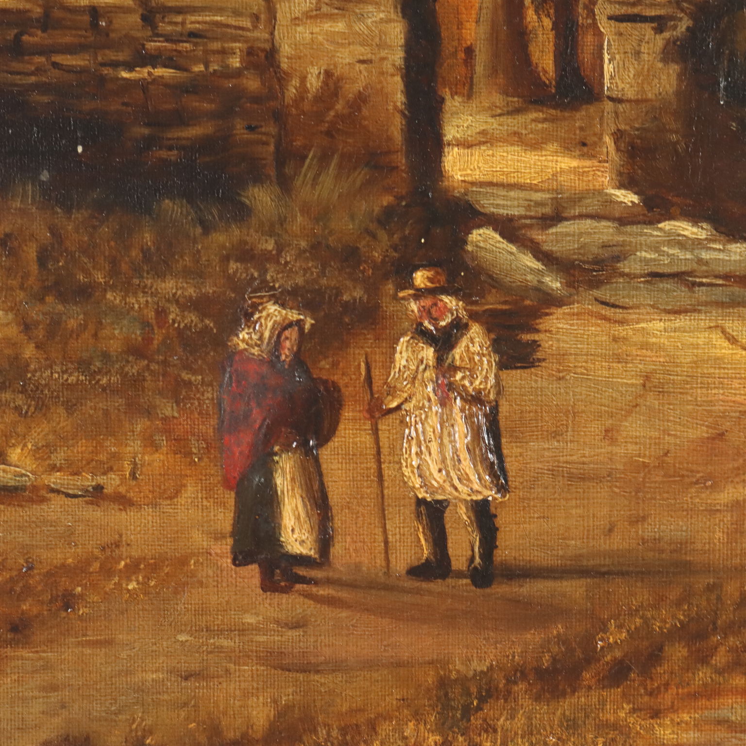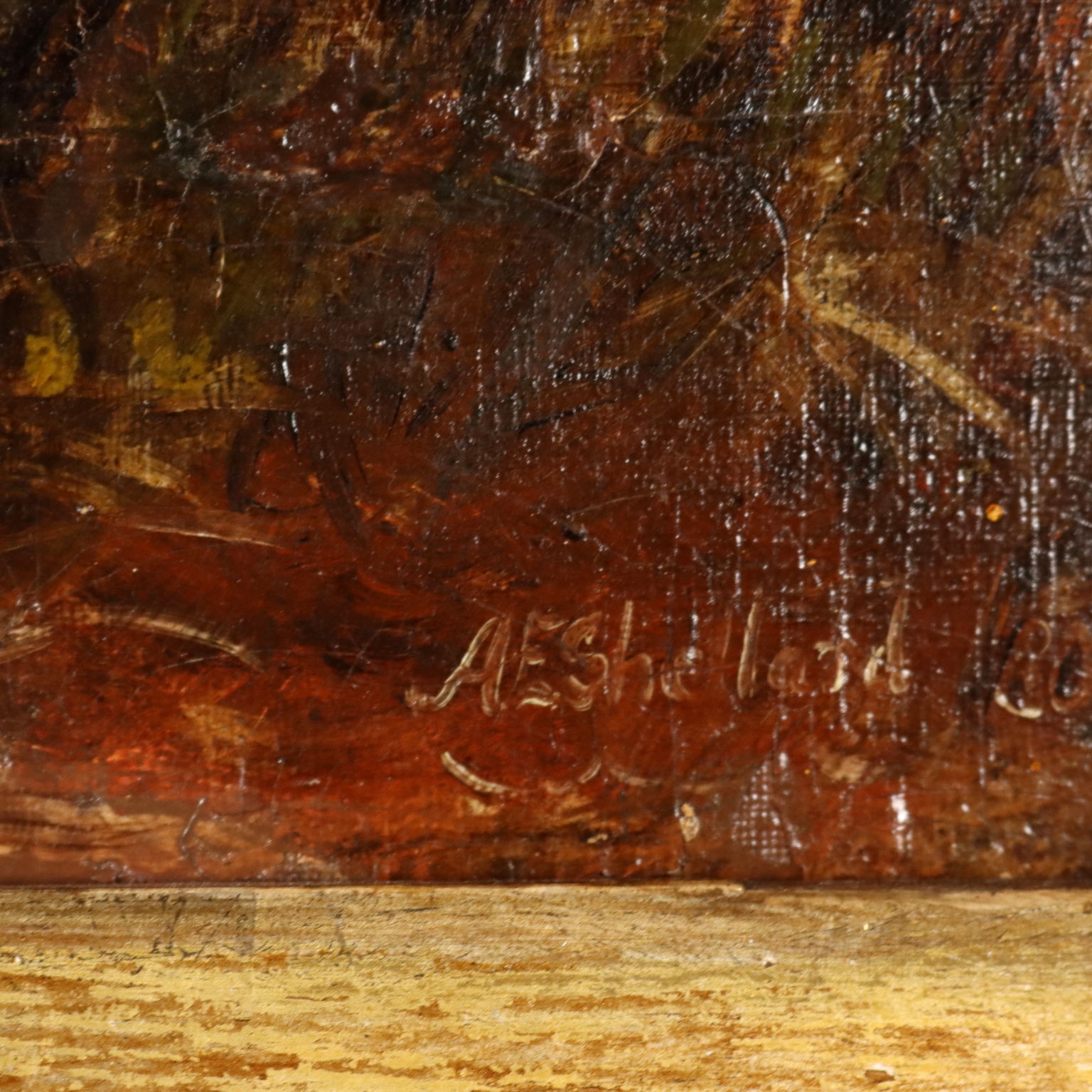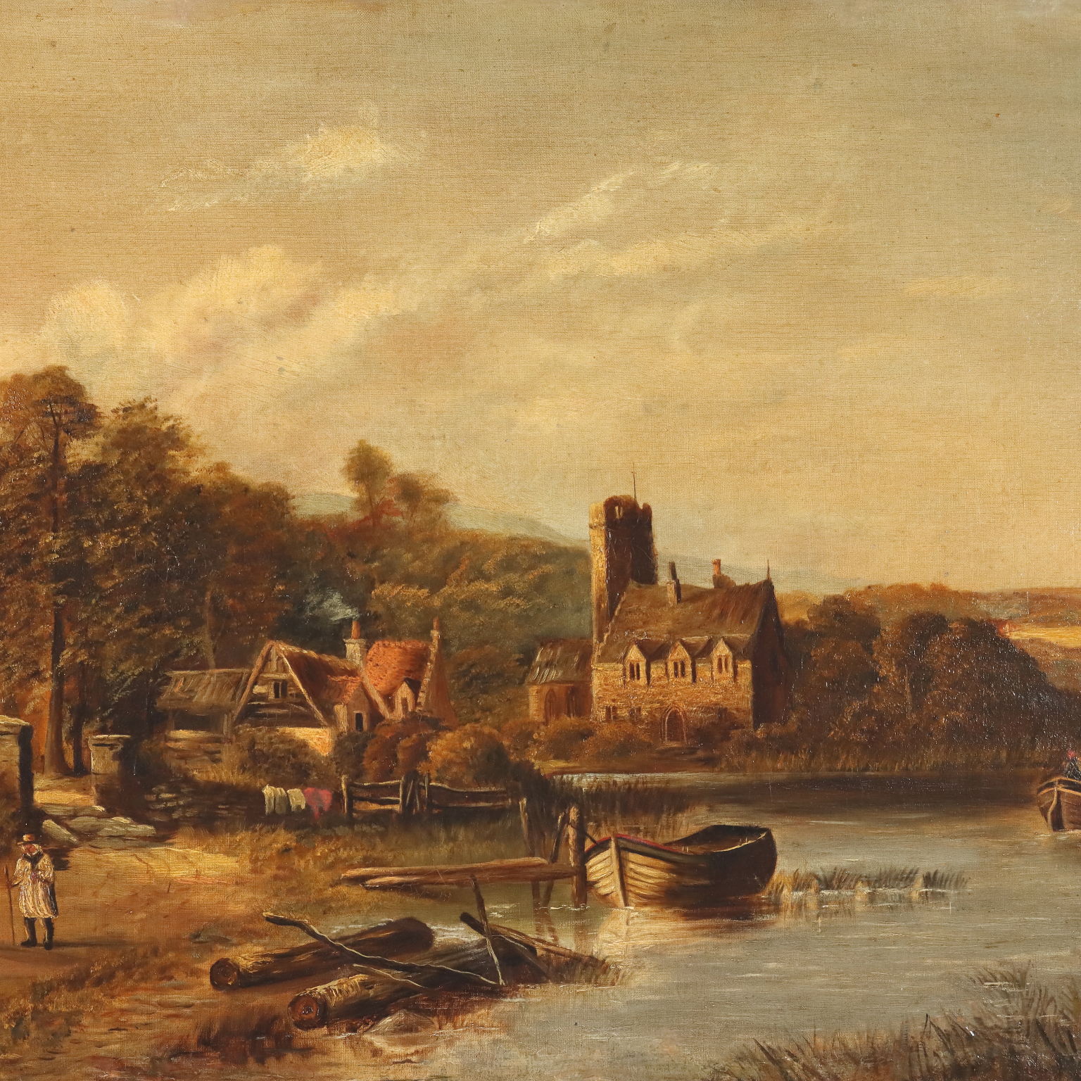 Olio su tela. Scuola olandese della fine del XIX secolo. In basso a sinistra è presente firma non identificata e la data '80. Sulla cornice placchetta metallica con indicato "Ashelard Holland 1880". Lo scorcio paesaggistico, una vasta campagna coltivata con lievi pendii, è traversato da un corso d'acqua, navigato da alcune barche; sulla riva a sinistra, un piccolo aggregato di case, con la chiesetta; alcuni viandanti si incrociano sul sentiero. Ancora in prima tela, il dipinto è presentato in cornice ridorata di inizio '900.