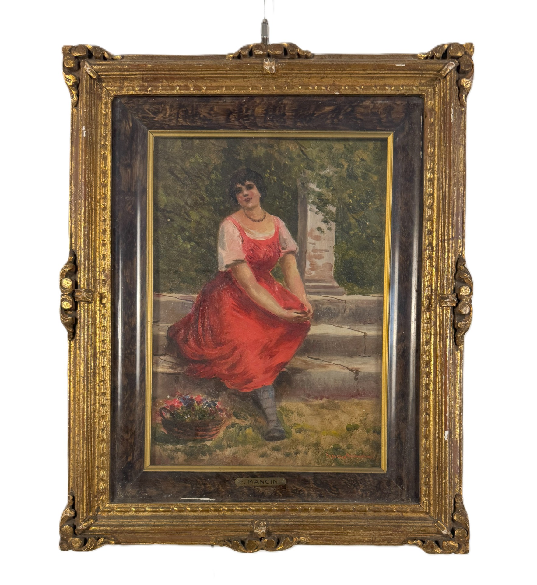 Anonimo del XIX secolo "Ritratto di donna sotto il pergolato", olio su cartone, cm 35x25, firma non leggibile in basso a destra