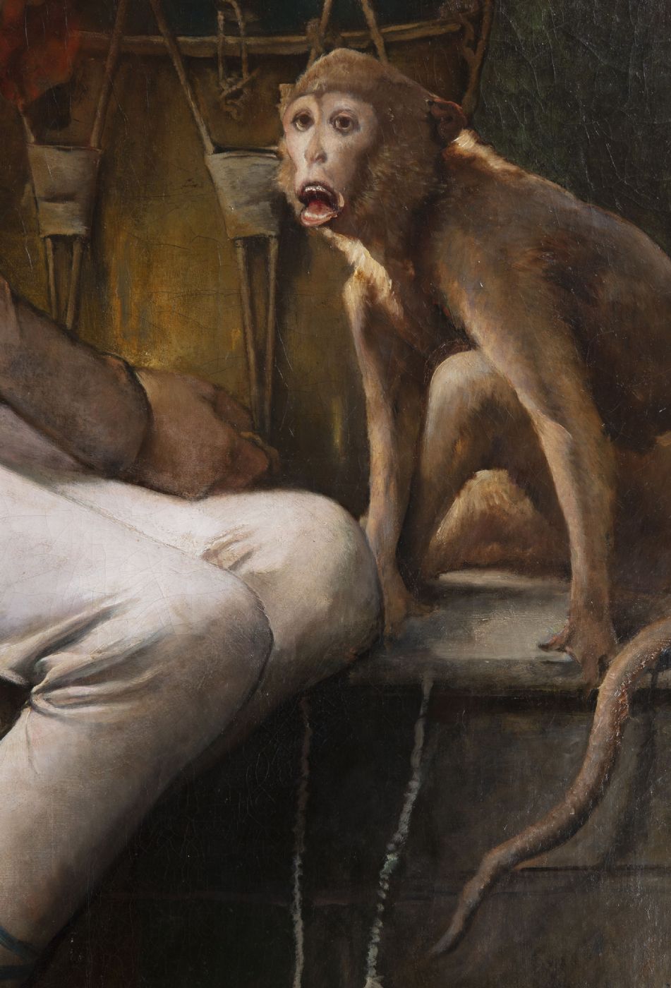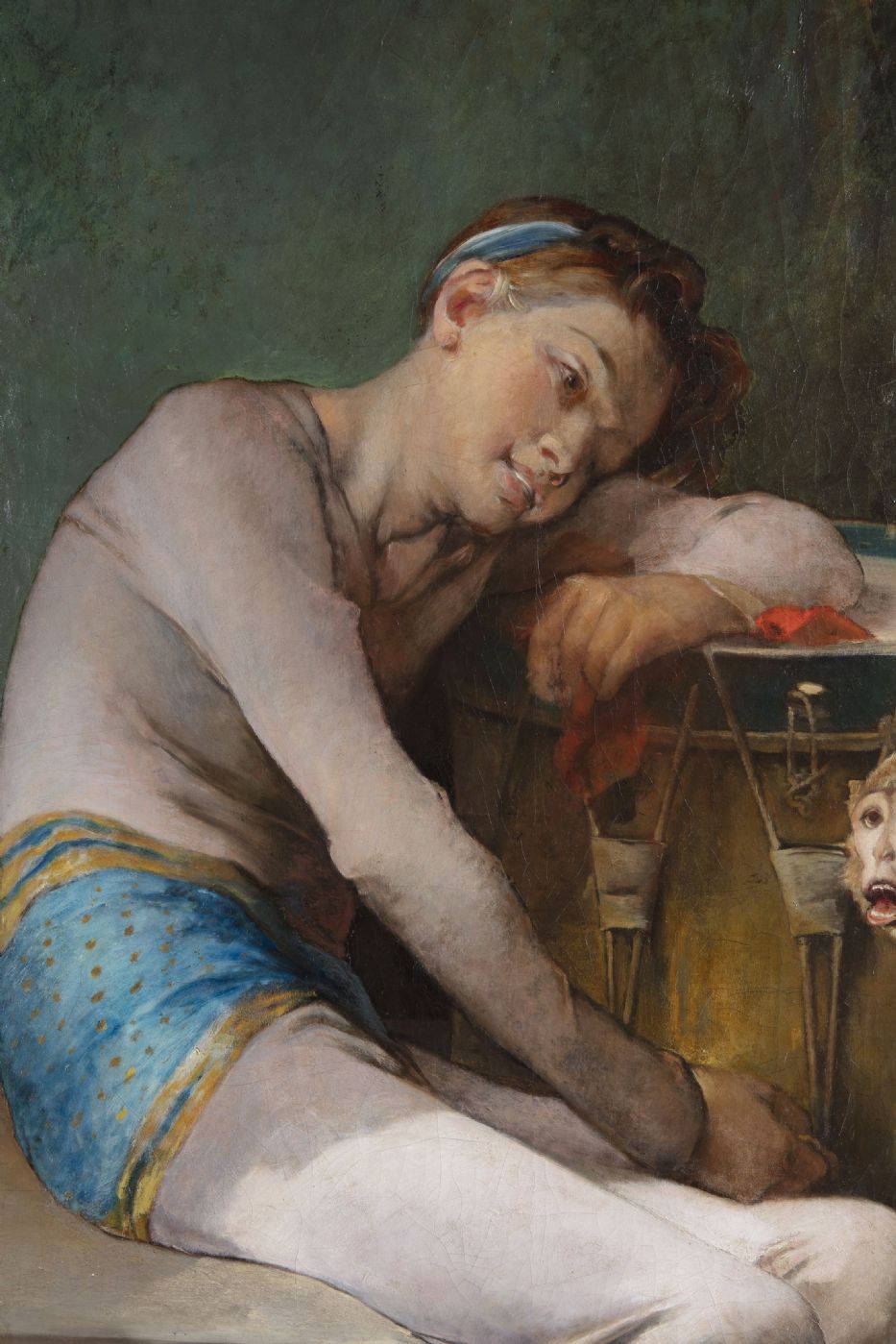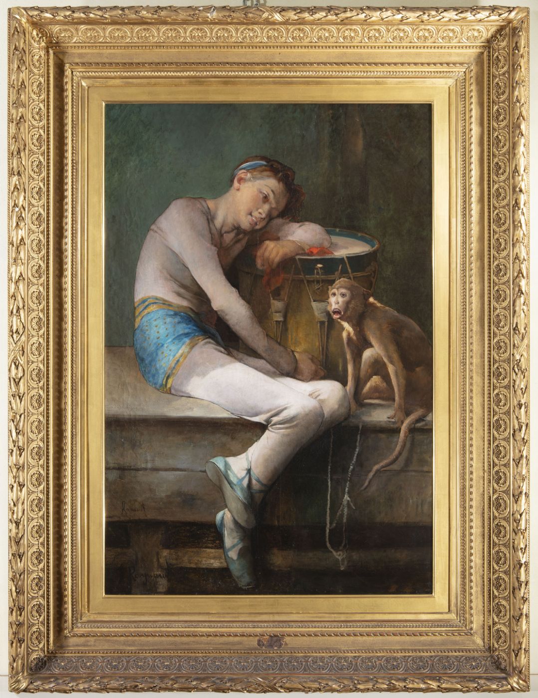 Il dipinto raffigura un giovane vestito in abiti circensi. Il ragazzo è ritratto dopo lo spettacolo, mentre riposa sotto ad un tendone verde; col corpo si abbandona in una posa ritorta, il suo sguardo stanco. Il suonatore di tamburo è accompagnato nel suo numero da un piccolo primate dal pelo marroncino, probabilmente una scimmia ragno, ritratta mentre fa il suo verso.