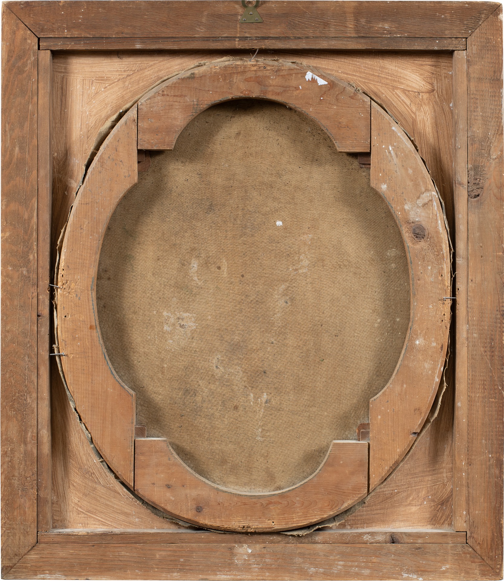 Dipinto antico ad olio su tela, in cornice coeva in legno intagliato e laccato.