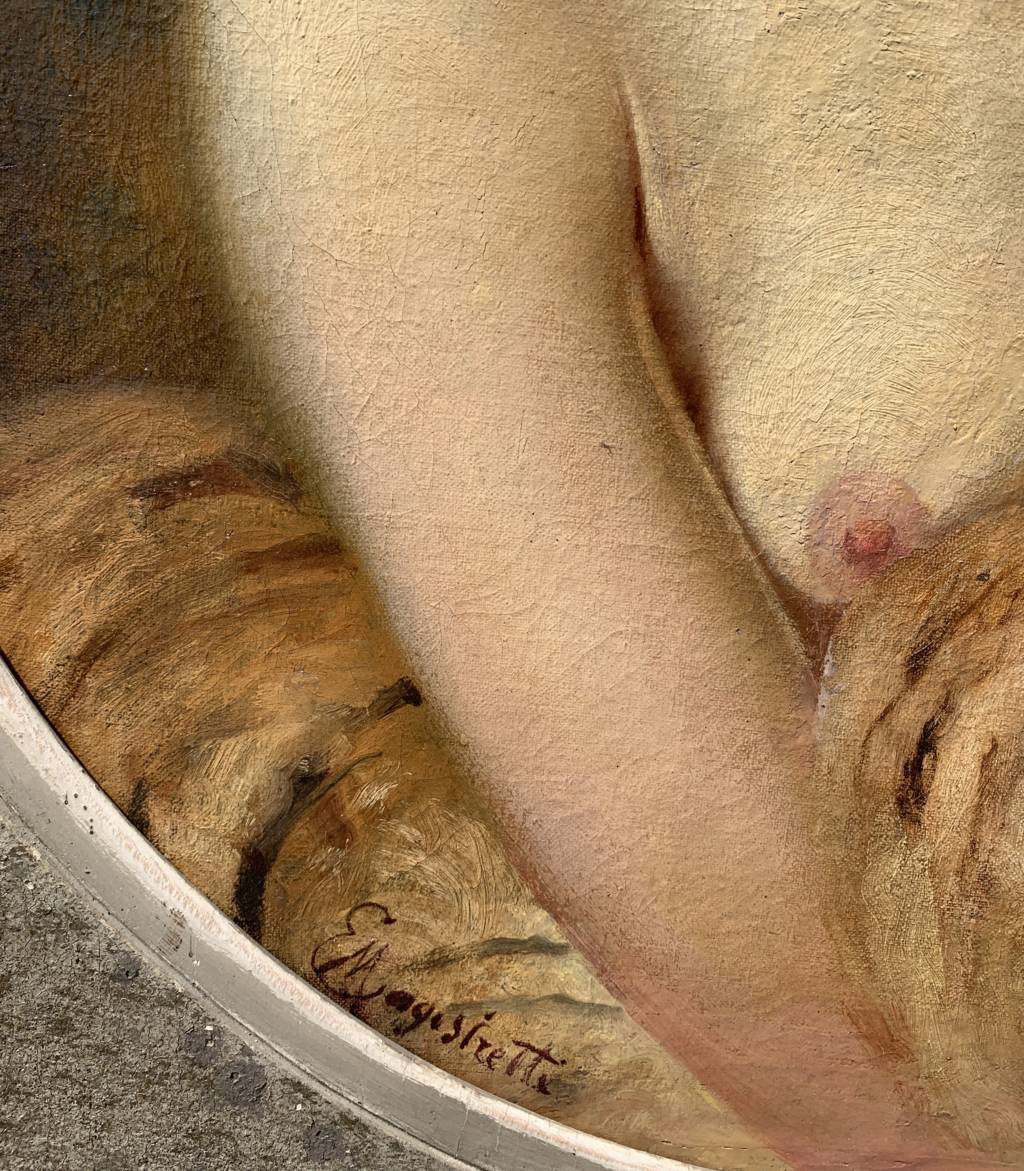 Emilio Magistretti (Milano 1851 – Milano 1936) è stato un pittore italiano attivo tra la seconda metà del XIX secolo e i primi del Novecento. Il suo stile, pur mantenendo una forte base realistica, fu influenzato dalle tecniche dell'Impressionismo e Post-impressionismo che conobbe durante il suo soggiorno parigino. Questa fusione di elementi tradizionali e moderni lo rese capace di catturare l'essenza dei suoi soggetti con grande realismo e di cogliere nei suoi ritratti una profonda introspezione. I suoi effigiati mostrano una grande umanità unita ad una stesura del colore vibrante e dinamica. La nostra fanciulla è rappresentata a seno scoperto mentre abbraccia un mansueto cucciolo di tigre. L’espressione enigmatica sul suo volto lascia presagire calma e sicurezza di sé, che affiorano anche dagli attributi della nudità e del felino pericoloso. L’opera è firmata in basso a sinistra e ricorda molto gli stilemi dell’arte parigina del periodo, la modella potrebbe quindi essere stata ritratta durante questo lasso temporale. La cornice, in legno intagliato e laccato color crema, è originale e coeva alla tela.
