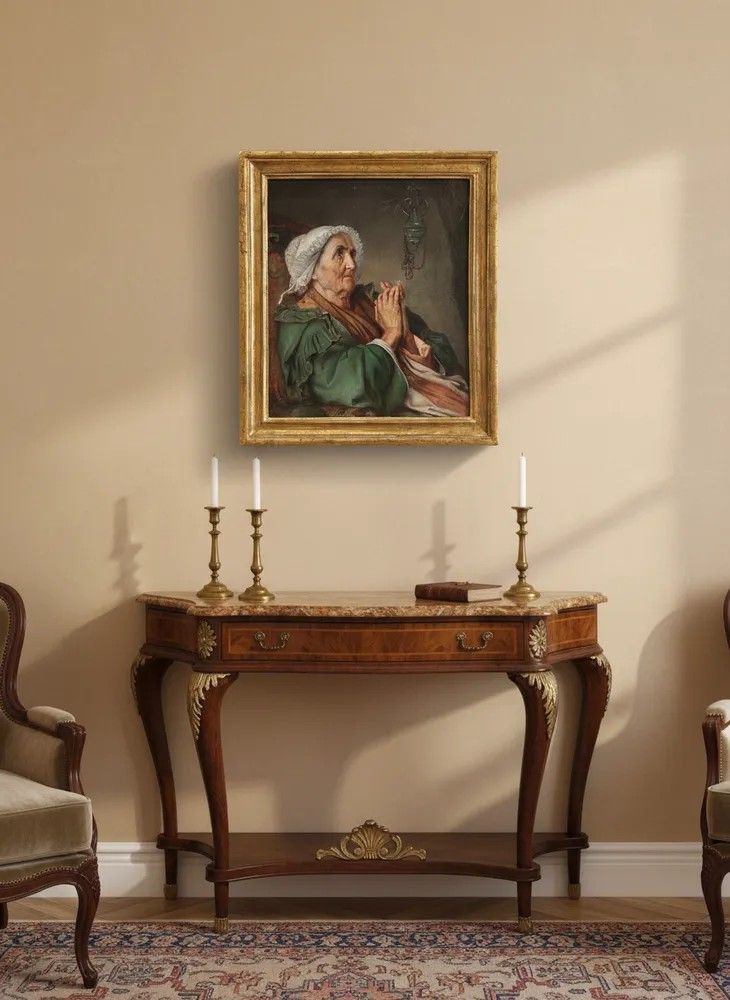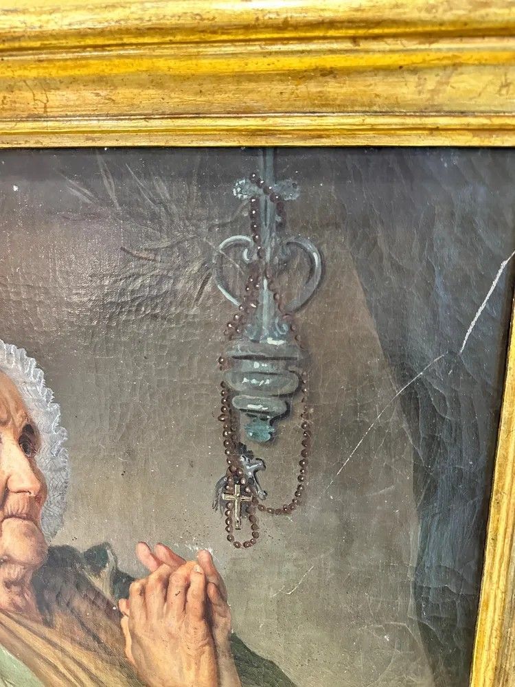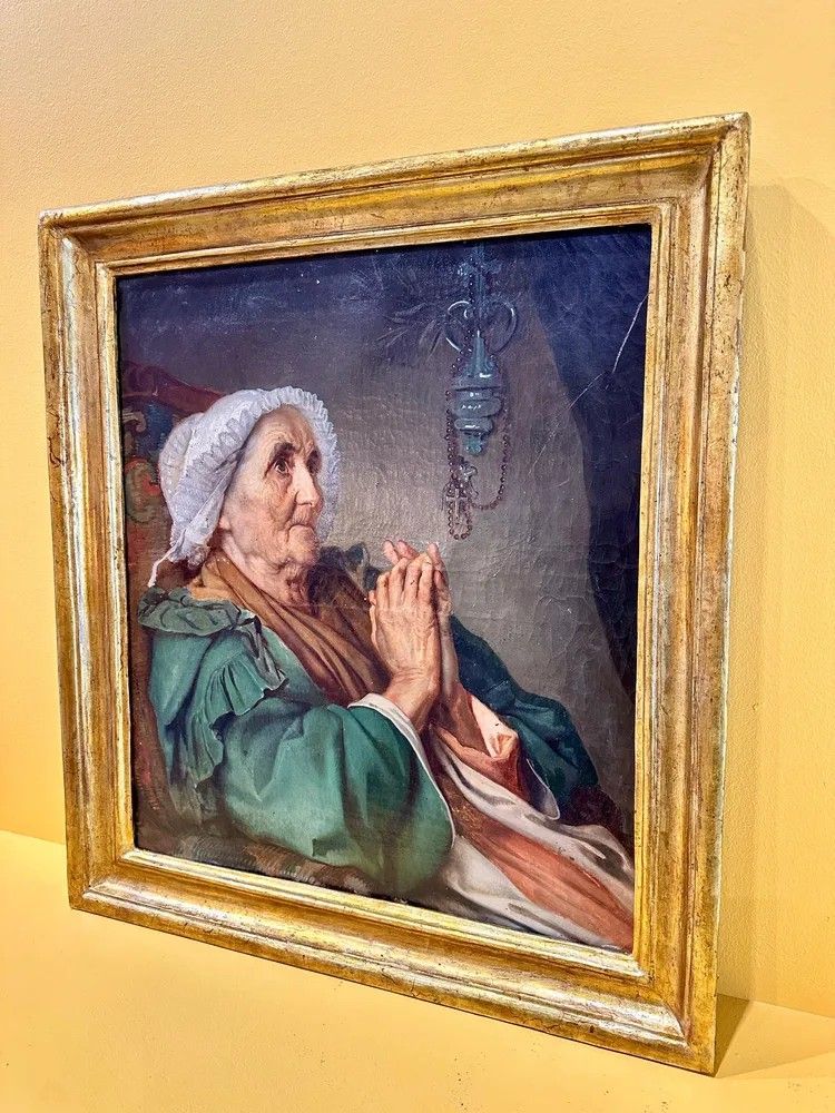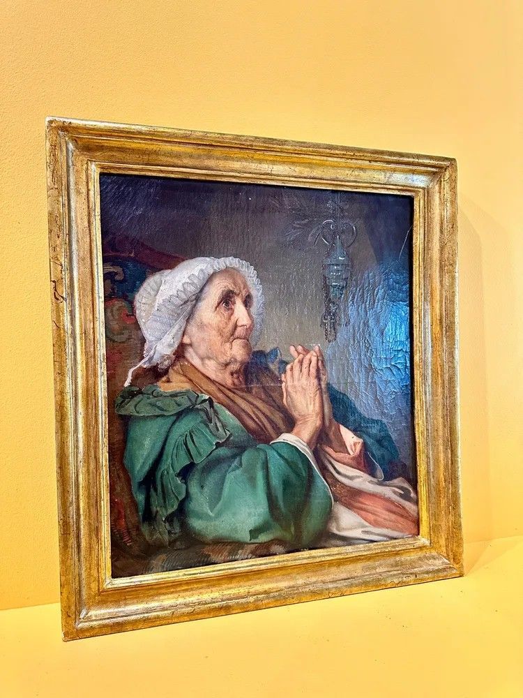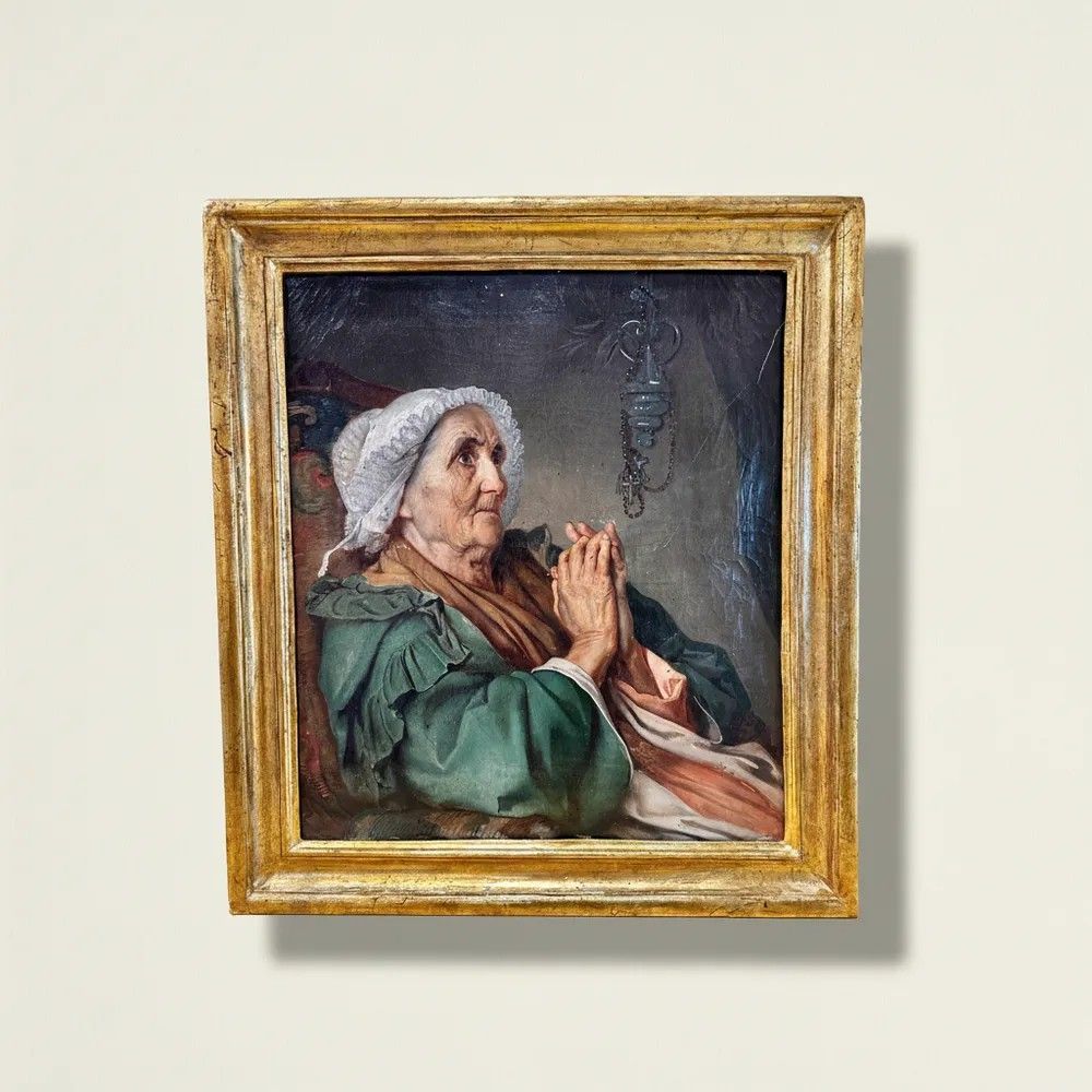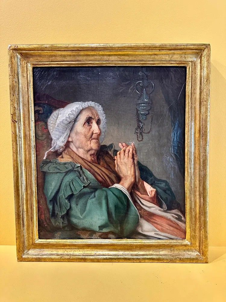 Questo raffinato dipinto ad olio su tela raffigura una donna anziana colta in un momento di profonda devozione. L’opera, firmata in basso a sinistra “Gaetano Ferri 1860 Hyères”, testimonia l’aderenza dell’artista ai più alti canoni della scuola pittorica italiana di metà XIX secolo.La figura, ritratta di profilo, ha il volto solcato da rughe sottili e straordinariamente veritiere. Il pittore utilizza velature sovrapposte per modulare le carni, restituendo alla cute un palpito quasi vivo. Le mani giunte, rese con minuzia anatomica, guidano l’occhio verso il fulcro spirituale della scena: un rosario in grani d’ambra che pende da una lampada votiva a parete, definito con tocchi calibrati di biacca e lacca bruna.Supporto: tela originale di manifattura coeva, non intelaiata in epoche successive (in prima tela).Tecnica: olio a pennellate sottili e trasparenti, con smalti finali a grana fine.Paletta cromatica: verdi smeraldo, bruni caldi e bianchi piombati, armonizzati da lenti passaggi tonali.Stato di conservazione: pellicola pittorica sana; craquelure di naturale invecchiamento; nessun ritocco visibile in luce radente.Cornice: lignea dorata a mecca, coeva all’opera, profilata a gola semplice; doratura originale con usura omogenea che ne attesta l’epoca.La composizione, serrata entro un formato quasi quadrato, richiama la ritrattistica di genere di ambito toscano, dove l’artista mette in luce la devozione popolare con partecipazione empatica ma scevra da sentimentalismi retorici. Il drappeggio del mantello verde, arricchito da balze in chiaroscuro deciso, dialoga con la cuffia di batista candida, creando un equilibrato contrappunto tra matericità e luce.Opera ideale per collezionisti di dipinti del XIX secolo, si presta a valorizzare contesti domestici o istituzionali che prediligano soggetti di alta intensità emotiva accompagnati da solida qualità esecutiva.Materiale: Dipinto ad olio su telaAltezza (cm): 82Larghezza (cm): 73Epoca: XIX Secolo - 1800