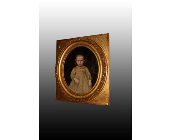 Olio su tela ovale, francese di metà 1800, raffigurante ritratto di fanciulla. Presenta bellissima cornice dorata foglia oro con incisioni sui 4 angoli.