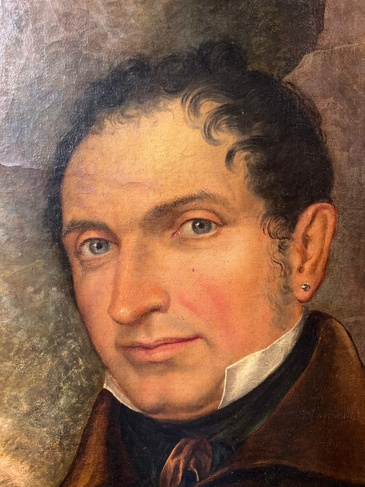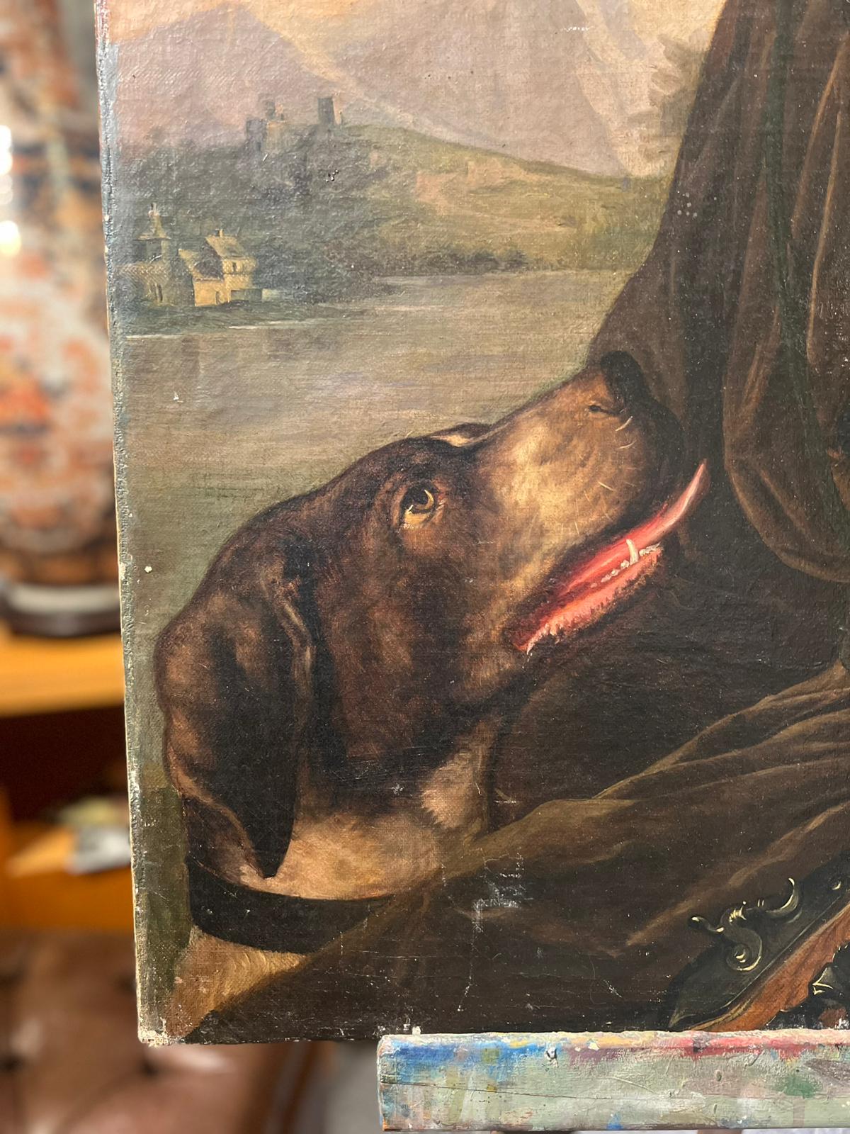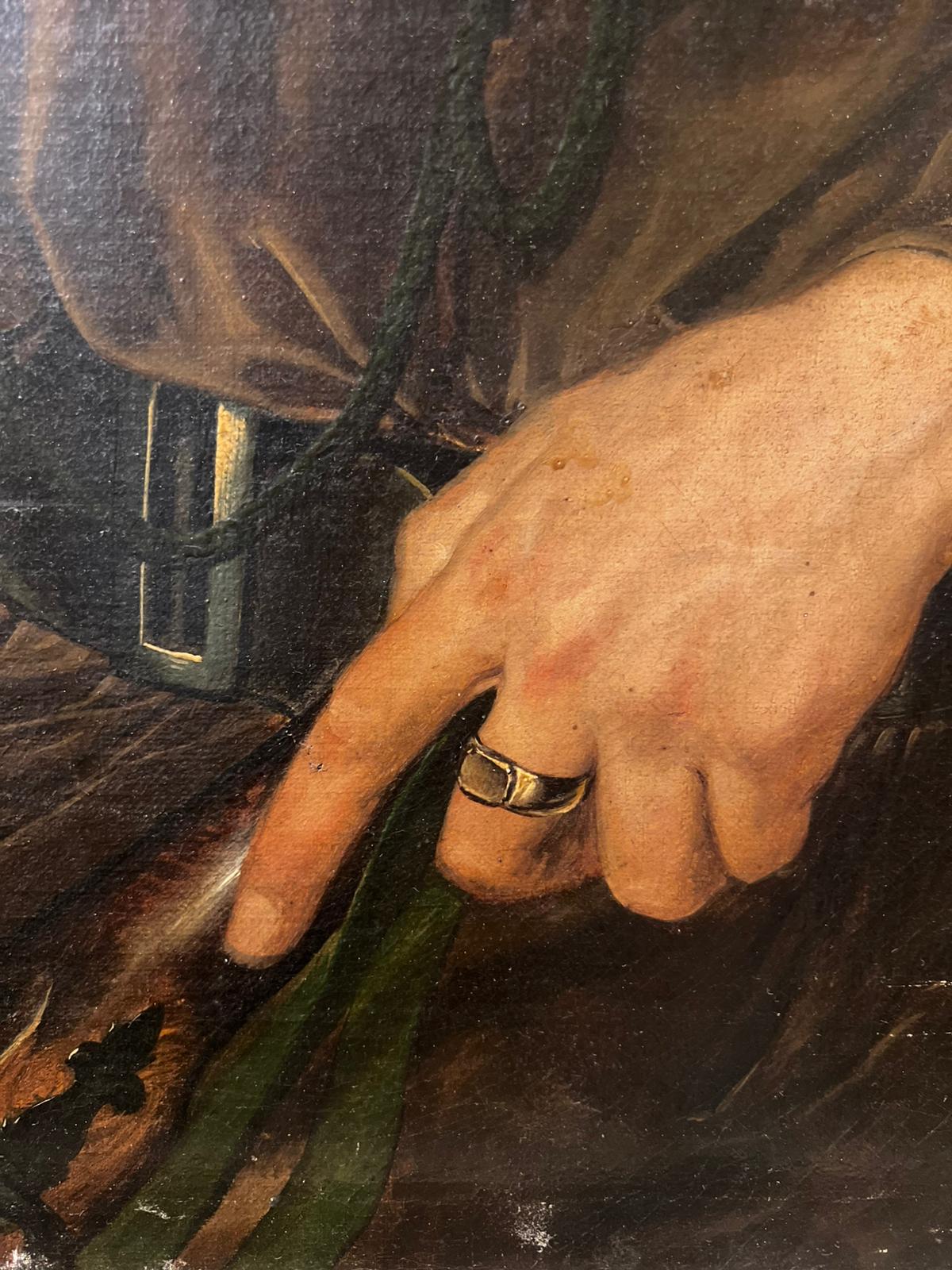 Raffinato dipinto ad olio raffigurante un gentiluomo in abiti da caccia, colto in un paesaggio montano al tramonto. L’uomo, elegantemente vestito con giacca di velluto bruno e foulard annodato al collo, regge un fucile e posa con naturale compostezza accanto al suo fedele cane da caccia, che lo guarda con espressione vigile e affettuosa.L’opera, di ottima qualità pittorica, si distingue per la cura nella resa psicologica del volto e per la minuziosa attenzione ai dettagli dell’abbigliamento e della scena naturale.