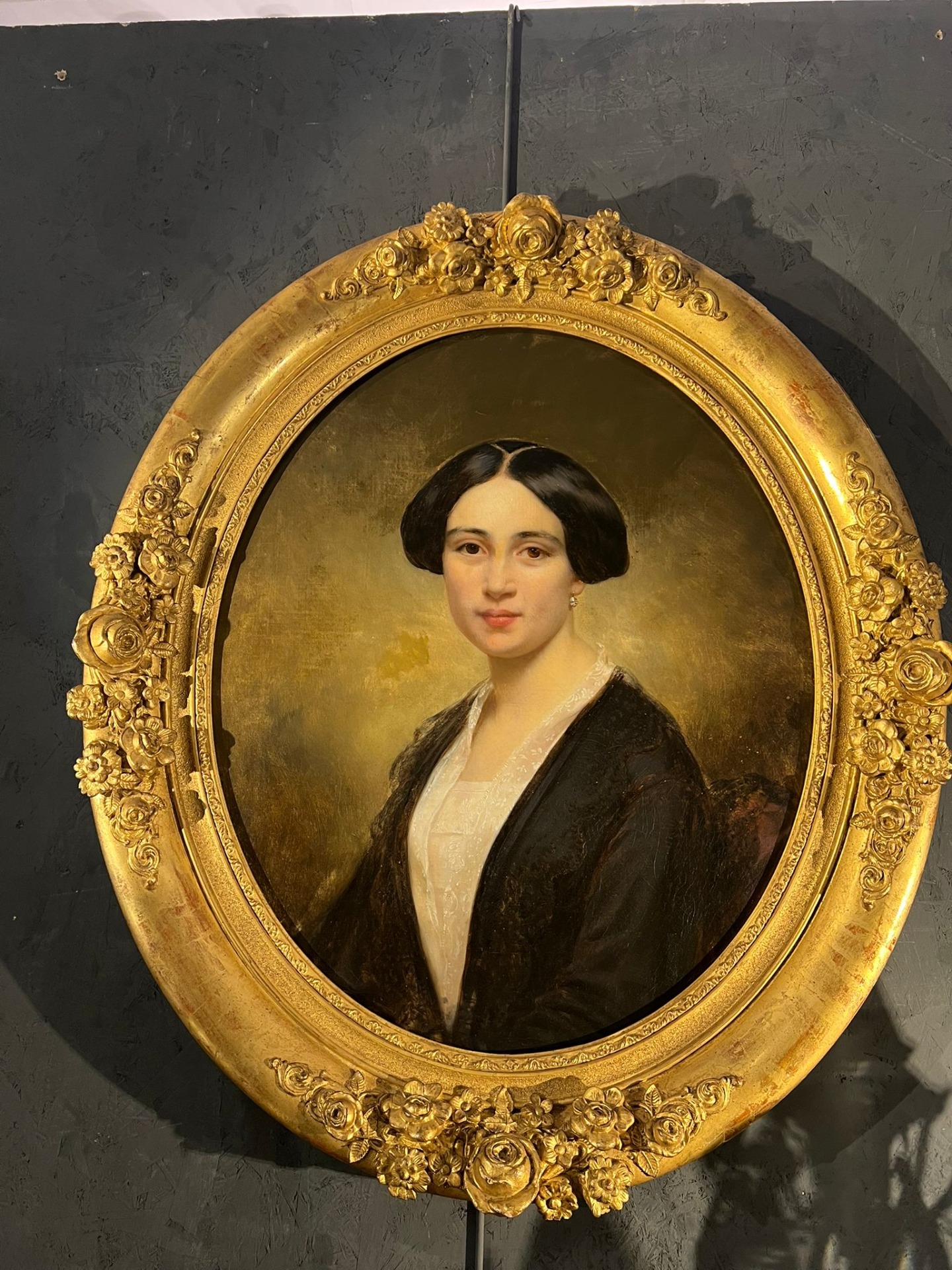Elegante dipinto ad olio raffigurante una dama. La figura femminile viene rappresentata dallo sguardo sereno e composto. Molto raffinati sono i dettagli come la delicatezza del volto e la lucentezza dei capelli scuri.