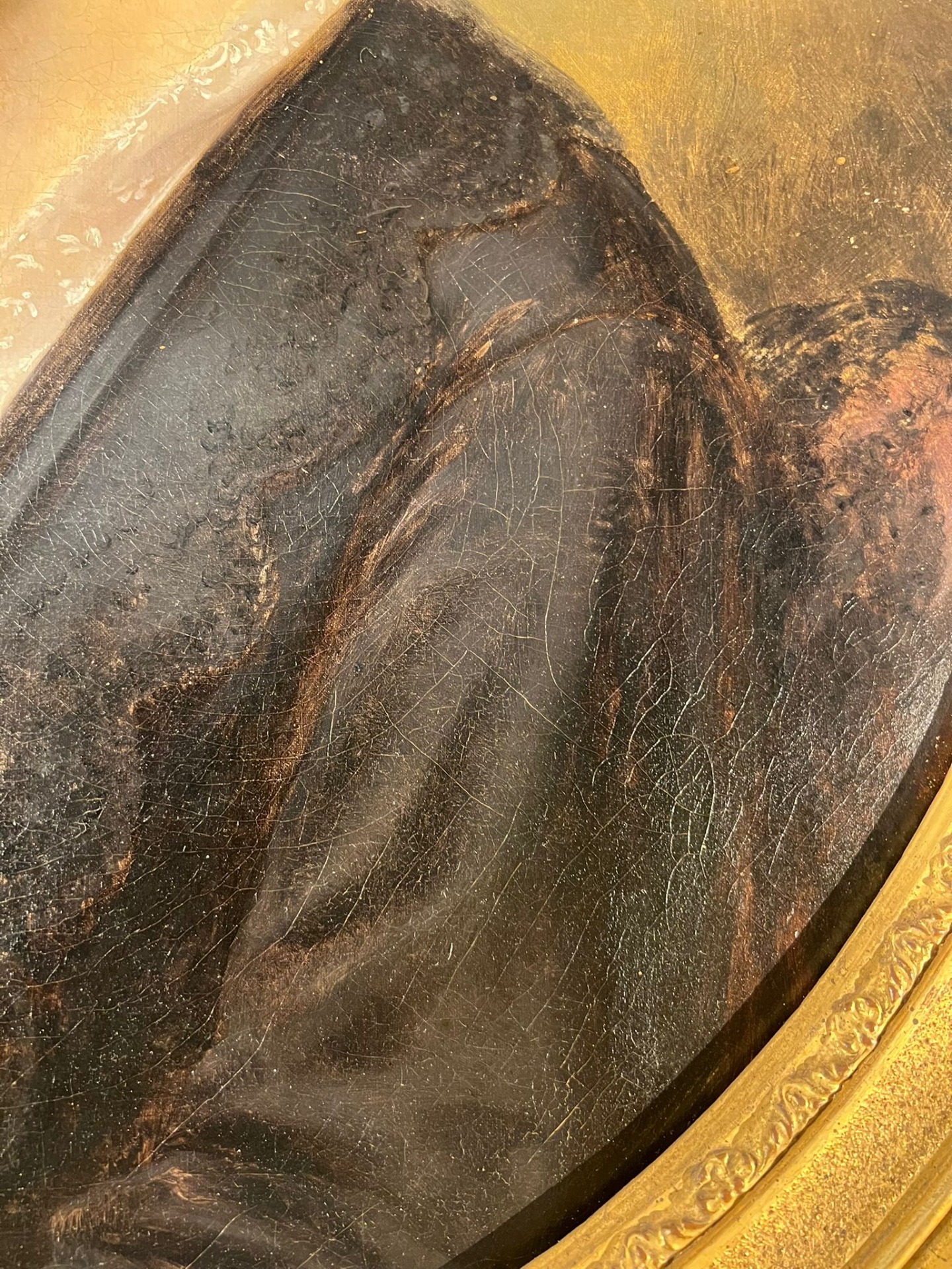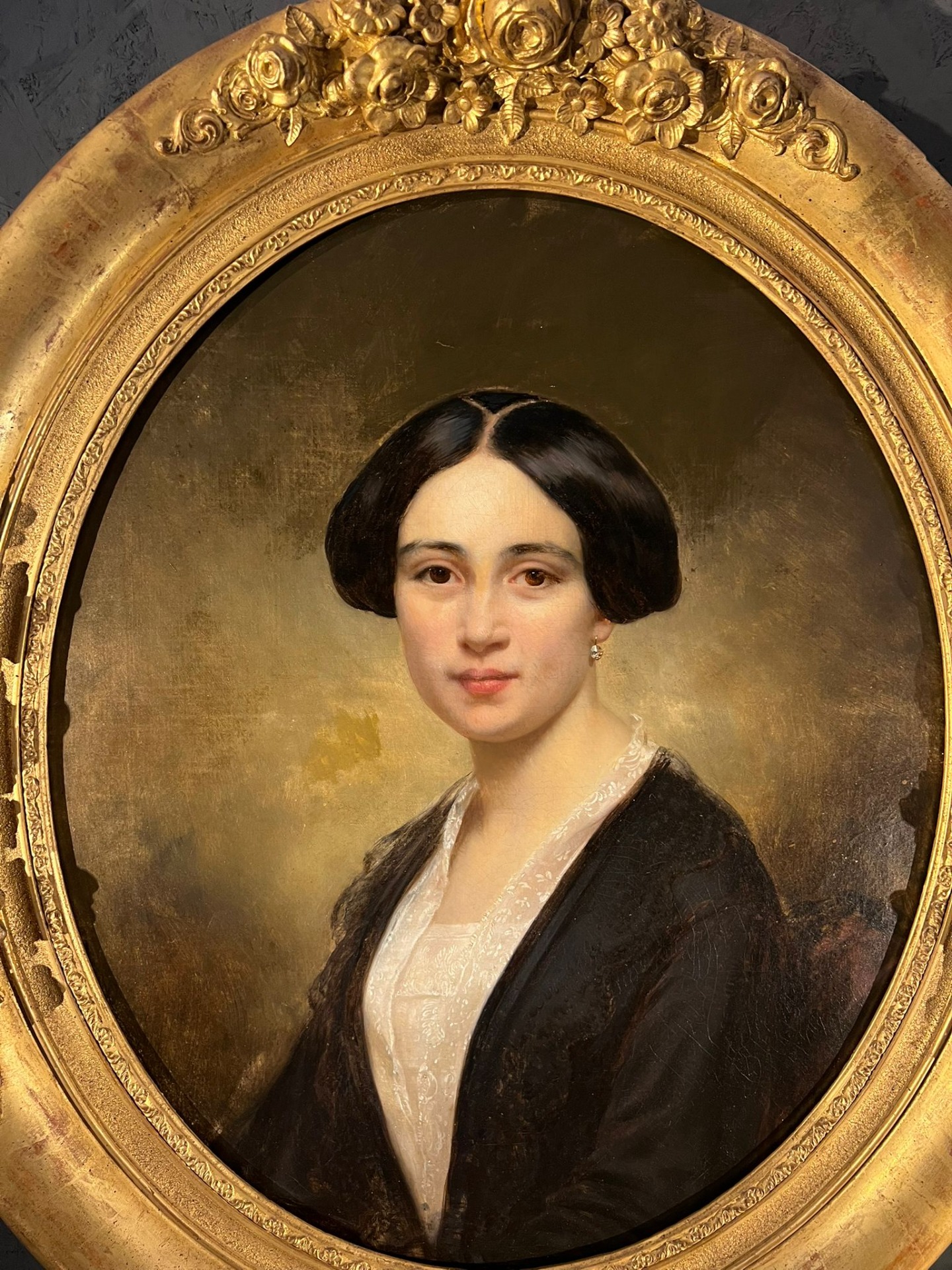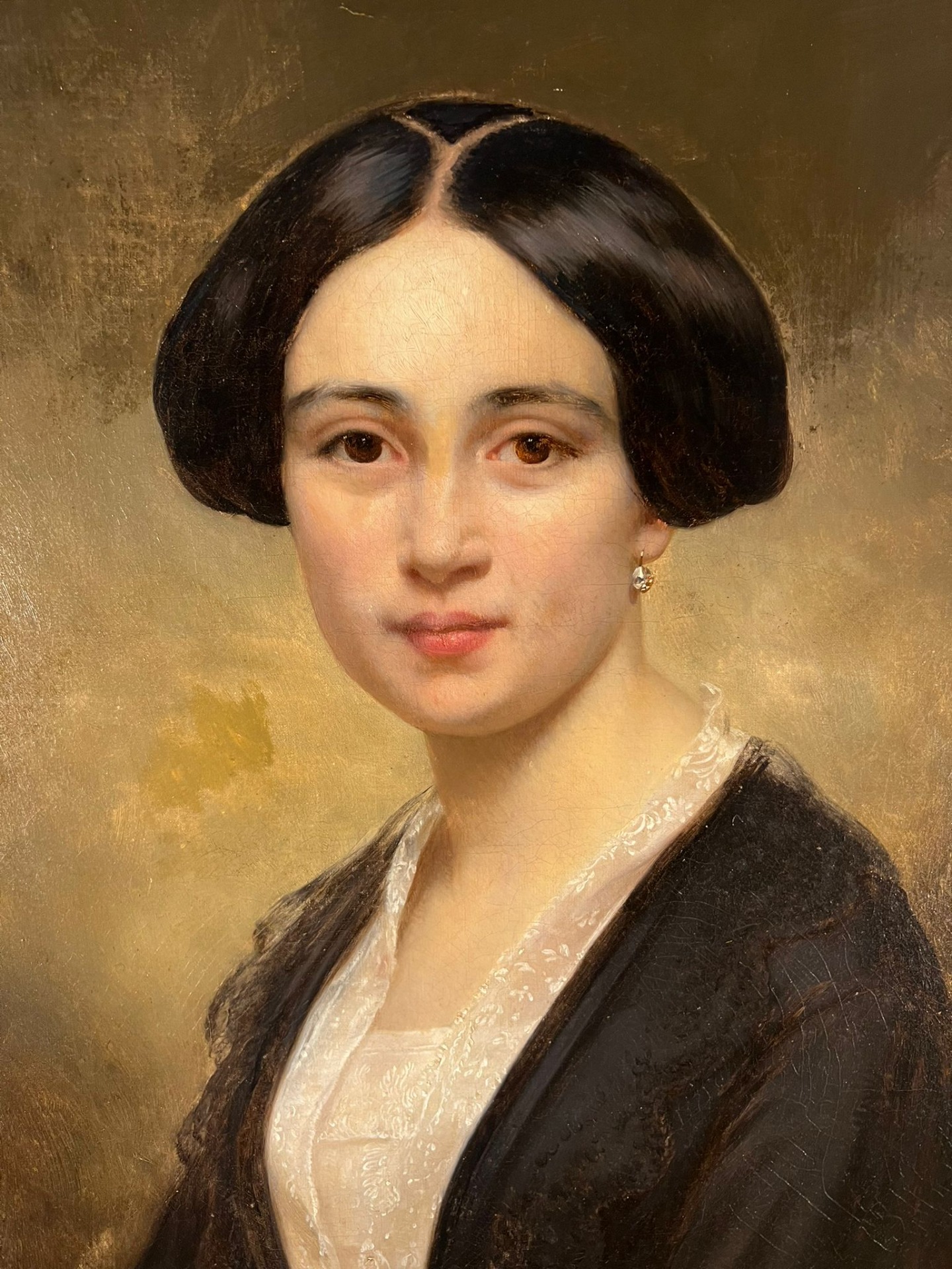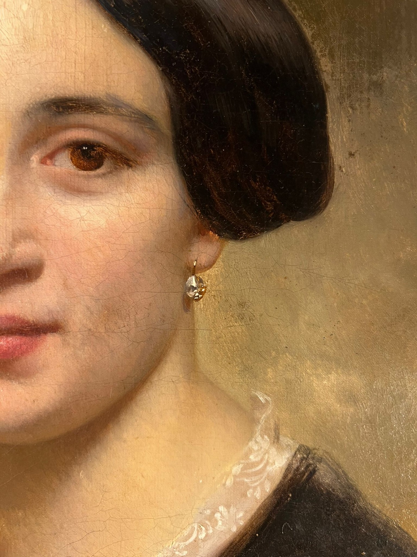 Elegante dipinto ad olio raffigurante una dama. La figura femminile viene rappresentata dallo sguardo sereno e composto. Molto raffinati sono i dettagli come la delicatezza del volto e la lucentezza dei capelli scuri.