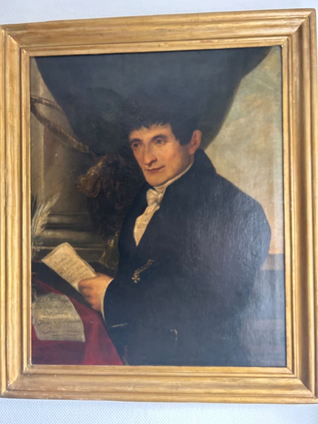 Un bel ritratto di un gentiluomo nobile con la corrispondenza in mano, olio su tela nella cornice d'orata, misura: altezza 85cm è largheezza 71cm(con la cornice)   Italia primi dell'Ottocento;...