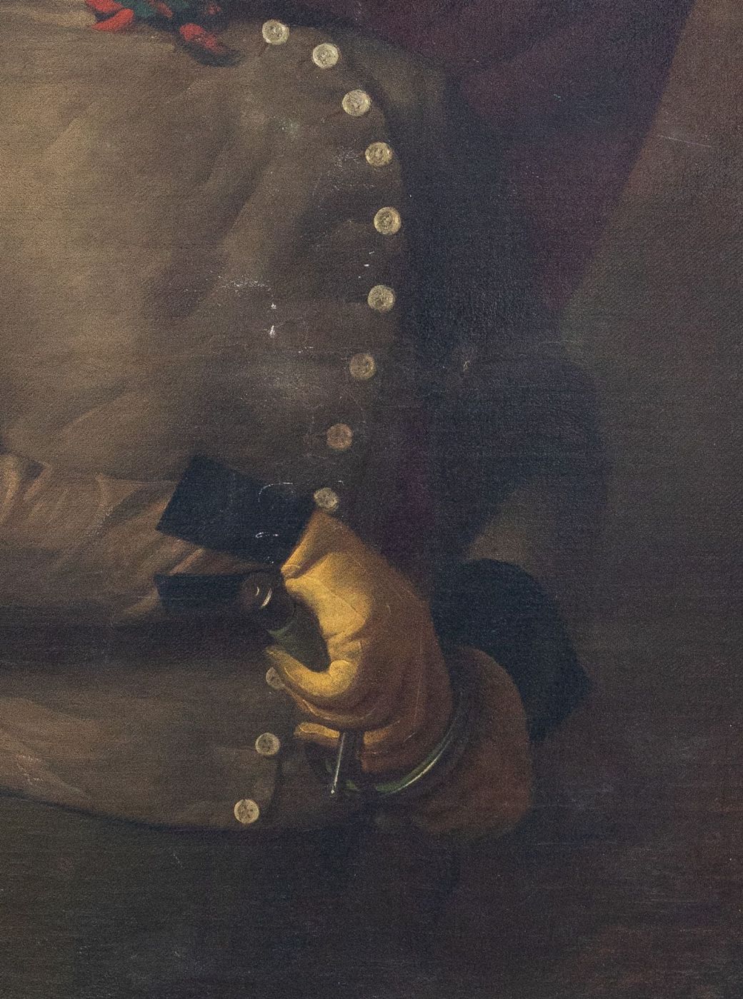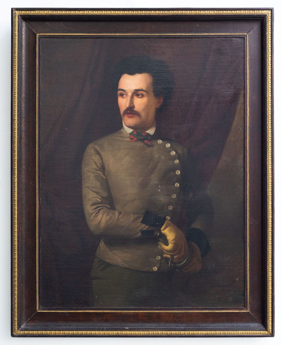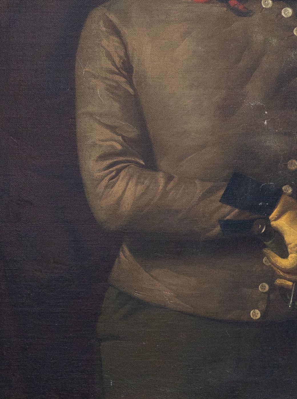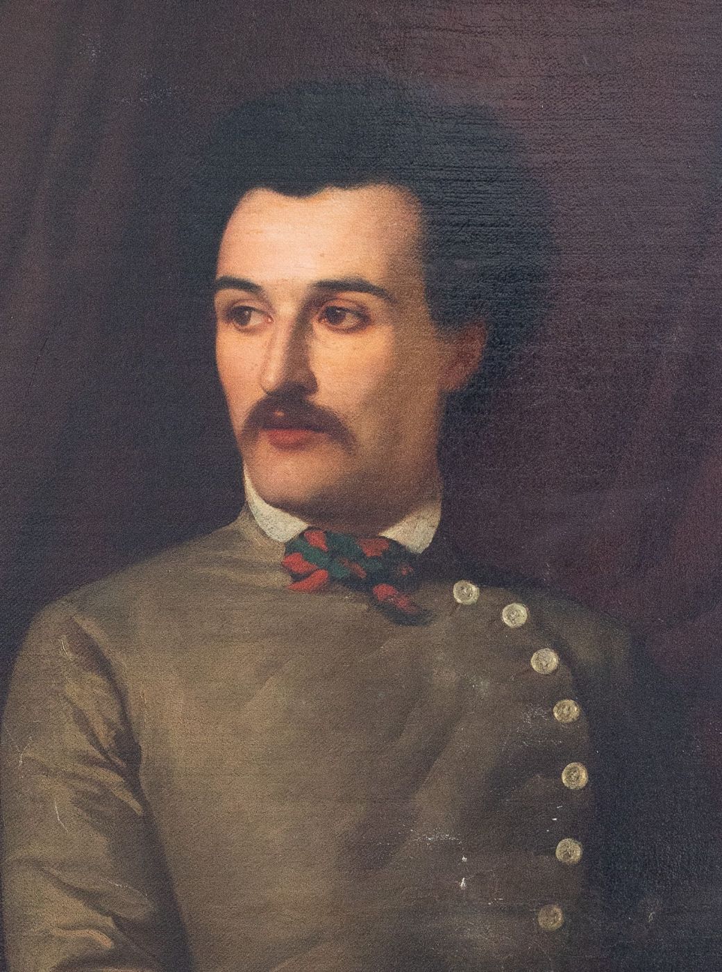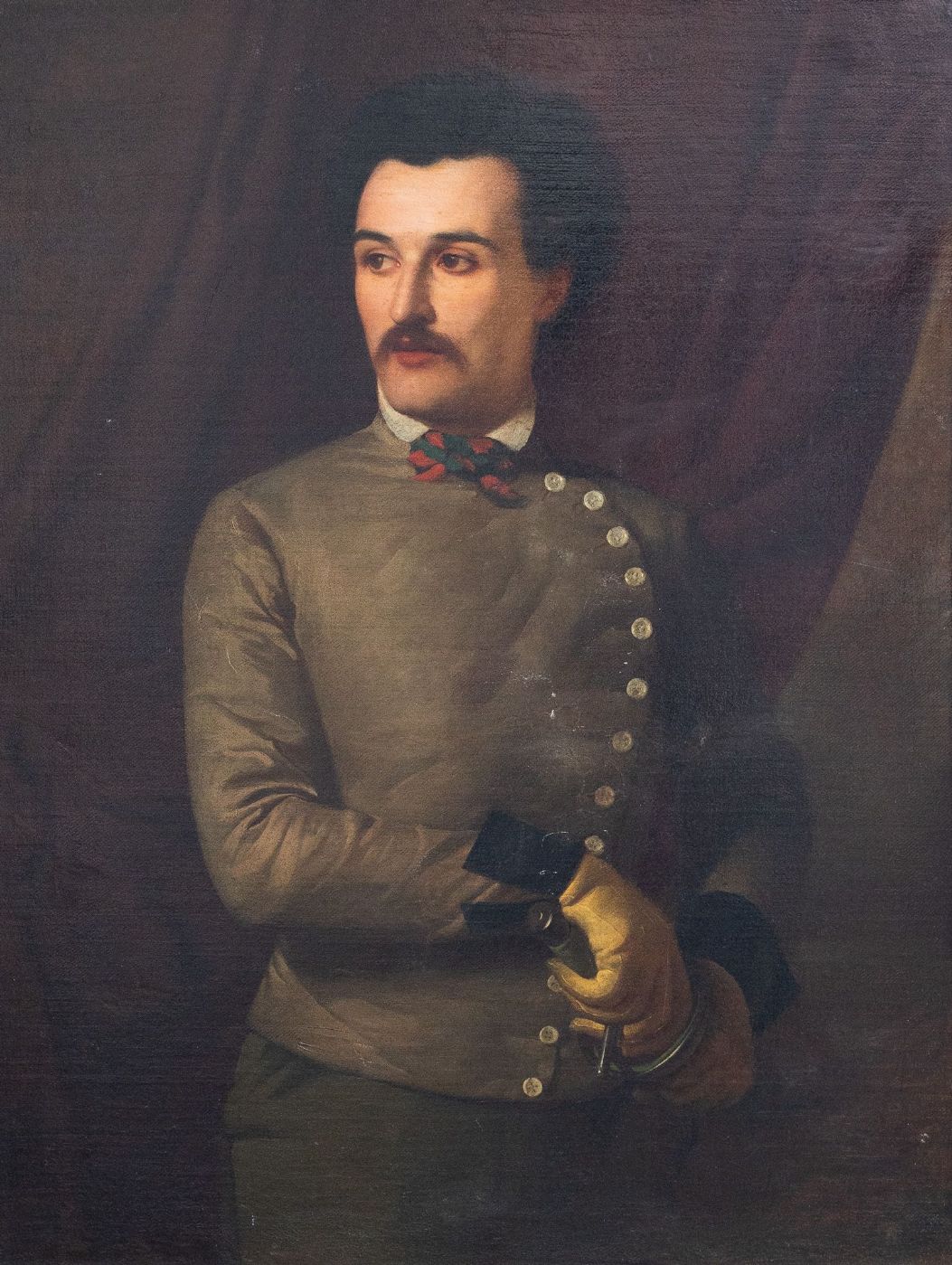 Descrizione: Elegante e intenso ritratto maschile di fine Ottocento, raffigurante un uomo appartenente alla borghesia nobile dell’epoca, colto in una posa composta e solenne. L’effigiato indossa una giacca militare, arricchita da una doppia fila di bottoni metallici e completata da una cravatta a fiocco dai toni vivaci. La mano destra trattiene un paio di guanti in pelle e l’elsa di una spada, simboli di prestigio, posizione sociale e senso dell’onore. Lo sfondo, costruito con drappeggi morbidi e toni scuri, esalta la luminosità del volto e la cura anatomica con cui il pittore rende la fisionomia: lo sguardo assorto, il taglio deciso dei baffi, la postura elegante ma non rigida. L’opera rivela un gusto tipicamente tardo ottocentesco per il ritratto formale.
