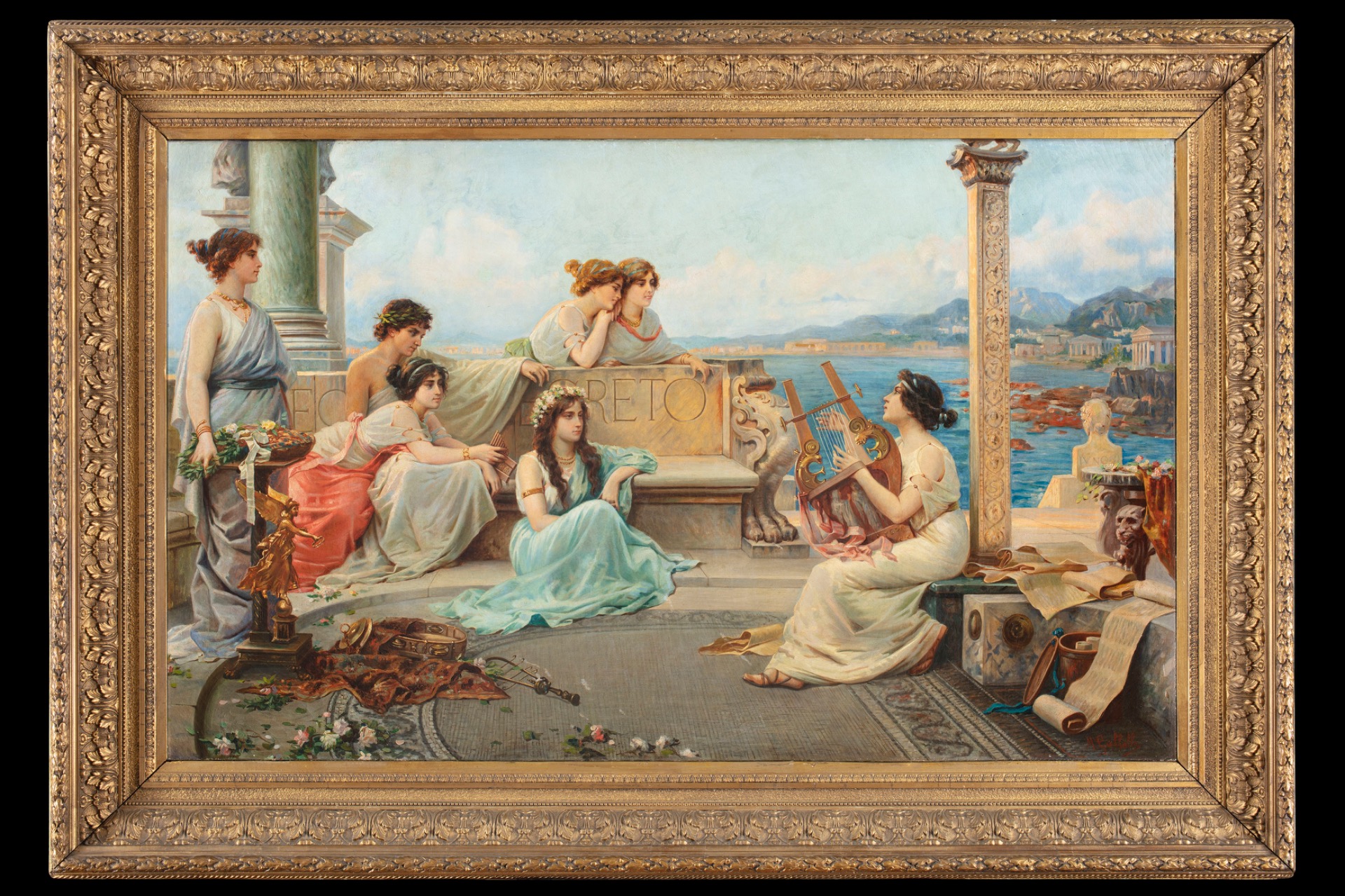Il dipinto raffigura una scena di genere classica con figure femminili e una maschile in un momento di convivialità: una delle giovani si esibisce con la cetra, intonando canti e poesie, mentre le altre fanciulle e il giovane uomo, forse un altro poeta, la ascoltano. La scena è ambientata in uno spazio aperto ideale, una terrazza affacciata sul mare, con il paesaggio costiero sullo sfondo. L’ambiente della scena è minuziosamente riscostruito come se fosse la terrazza di una villa romana antica.