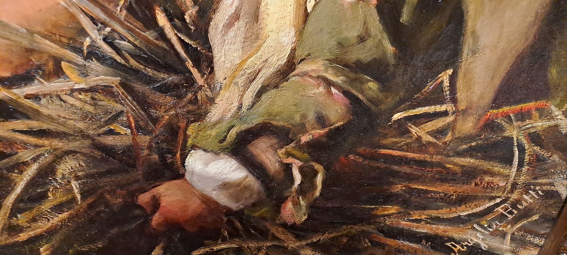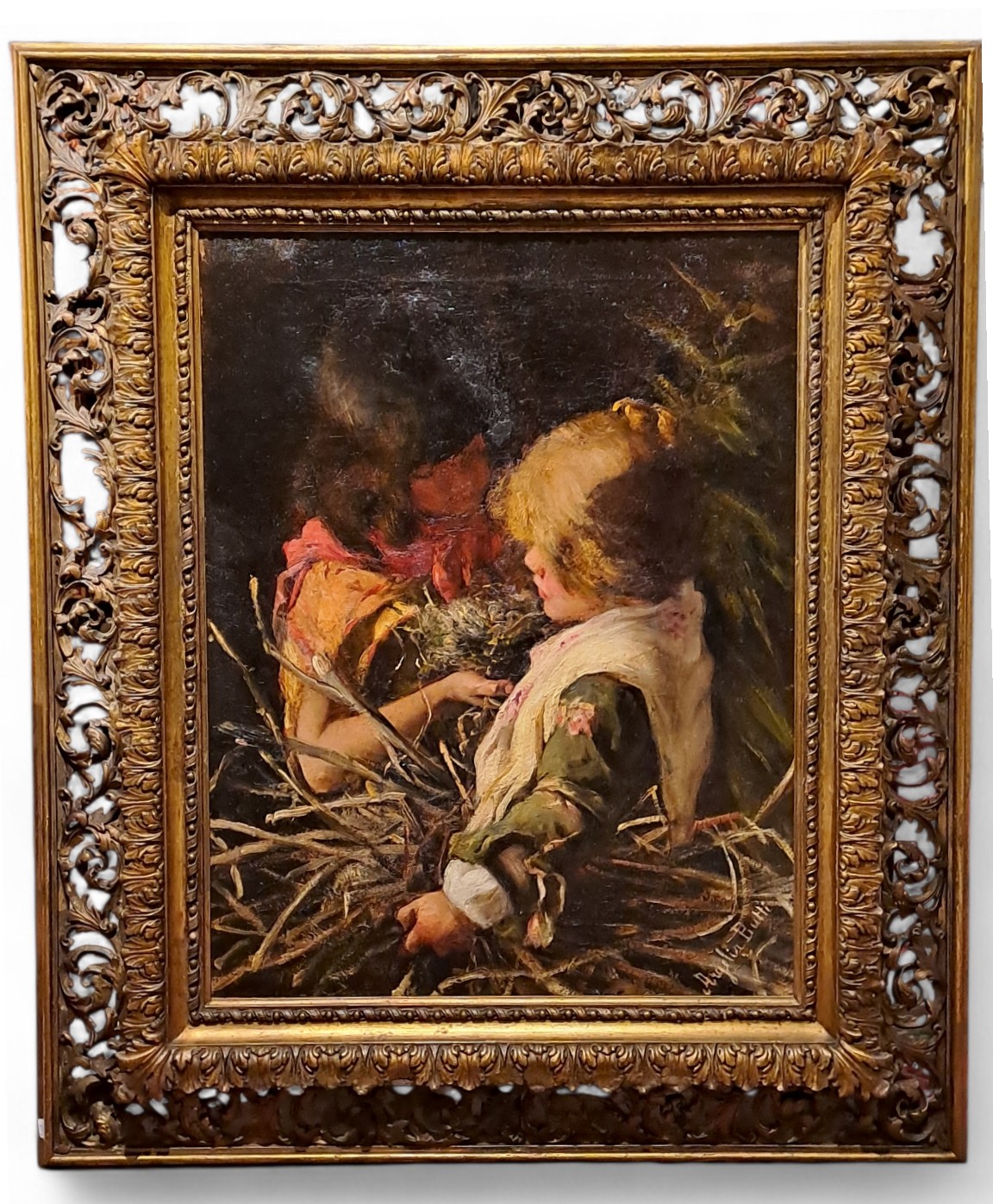 Olio su Tela della Pittrice Triestina Argelia Butti (1855–1924) Un'opera di rara delicatezza e notevole valore storico-artistico, eseguita dalla talentuosa pittrice triestina Argelia Butti. Il dipinto cattura un momento di tenera curiosità e innocenza infantile, tipico della sensibilità artistica della fine del XIX e inizio XX secolo. Descrizione del Dipinto Il quadro ritrae due bambine, probabilmente sorelle o coetanee, immerse in una scena campestre o boschiva, con un'atmosfera calda e intimista. L'attenzione è focalizzata sulla figura in primo piano che, con dolcezza e compostezza, osserva un nido di uccellini, evidente segno di vita e fragilità. Tecnica e Stile: Olio su tela con una pennellata ricca e vibrante, che denota una formazione accademica e una maestria nell'uso del colore, in particolare nei toni terrosi e nelle accensioni rosse e gialle che illuminano la scena e le figure delle fanciulle. Lo stile si colloca nell'ambito della pittura di genere ottocentesca, con una forte enfasi sul sentimento e sulla narrazione visiva. Dettagli Chiave: Si nota l'abilità dell'artista nel rendere le texture, come le piume soffici dei pulcini nel nido e il groviglio dei rami e della paglia. La composizione è bilanciata e il contrasto tra luci e ombre (chiaroscuro) conferisce profondità e drammaticità emotiva alla scena. Condizioni: L'opera si presenta in buone condizioni conservative in prima tela. È incorniciata in una splendida cornice coeva dorata, che ne esalta l'importanza e l'impatto visivo. Firma: L'operareca firma leggibile "Argelia Butti" sul margine inferiore destro. Cenni Biografici sull'Artista Argelia Butti (Trieste, 1855 – Roma, 1924) è stata una pittrice italiana attiva tra la fine dell'Ottocento e l'inizio del Novecento. Contesto Familiare: Proveniente da una famiglia intellettuale di spicco a Trieste, era sorella della scrittrice Adele Butti (1848-1909) e della musicista Sofia Butti (1851-?), un ambiente che ne ha senz'altro favorito l'educazione artistica e la sensibilità culturale. Produzione Artistica: La sua produzione si è concentrata prevalentemente sulla pittura di figura, ritratti e scene di genere, spesso con soggetti intimi e quotidiani. Le sue opere riflettono un gusto ottocentesco per la narrazione sentimentale e l'attenzione ai dettagli. Significato Storico: Le opere di Argelia Butti rappresentano una testimonianza importante della pittura femminile e dell'ambiente artistico triestino e italiano dell'epoca, rendendola un pezzo da collezione per gli amanti dell'arte ottocentesca. Dimensioni della Tela: 88 x 105 cm compresa la cornice, 54 x 71 cm la sola tela. Provenienza: Collezione privata Epoca: Fine XIX – Inizio XX Secolo Si rilascia regolare certificato di autenticità con foto. Assicuriamo una risposta alle vostre mail entro le 24 ore ISCRITTO ALL' ALBO PERITI E CTU PRESSO IL TRIBUNALE DI LA SPEZIA