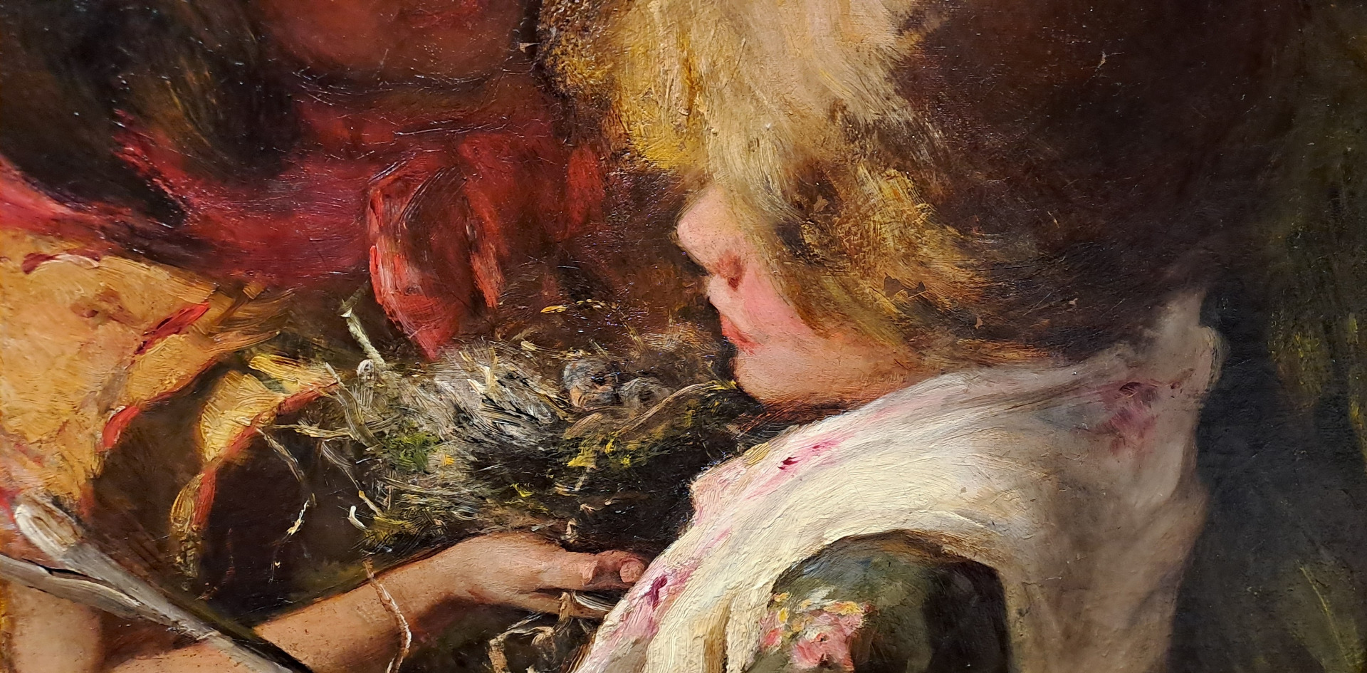 Olio su Tela della Pittrice Triestina Argelia Butti (1855–1924) Un'opera di rara delicatezza e notevole valore storico-artistico, eseguita dalla talentuosa pittrice triestina Argelia Butti. Il dipinto cattura un momento di tenera curiosità e innocenza infantile, tipico della sensibilità artistica...