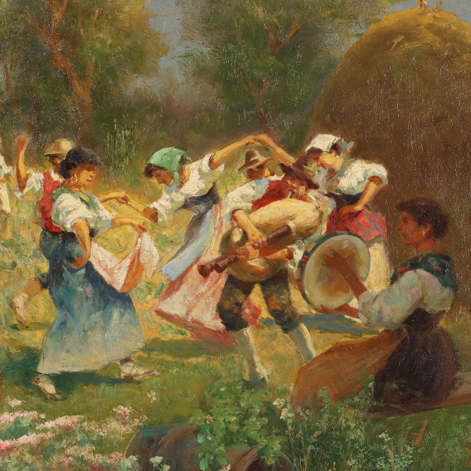 Olio su tela. Firmato in basso a sinistra. La scena raffigura un gruppo di contadini e contadine che raccolgono cesti di fiori, facendo musica e danzando al suono di cornamuse e tamburello, e qualcuno ne approfitta per corteggiarsi. Si tratta quindi di una festa popolare campestre, soggetto tra i...