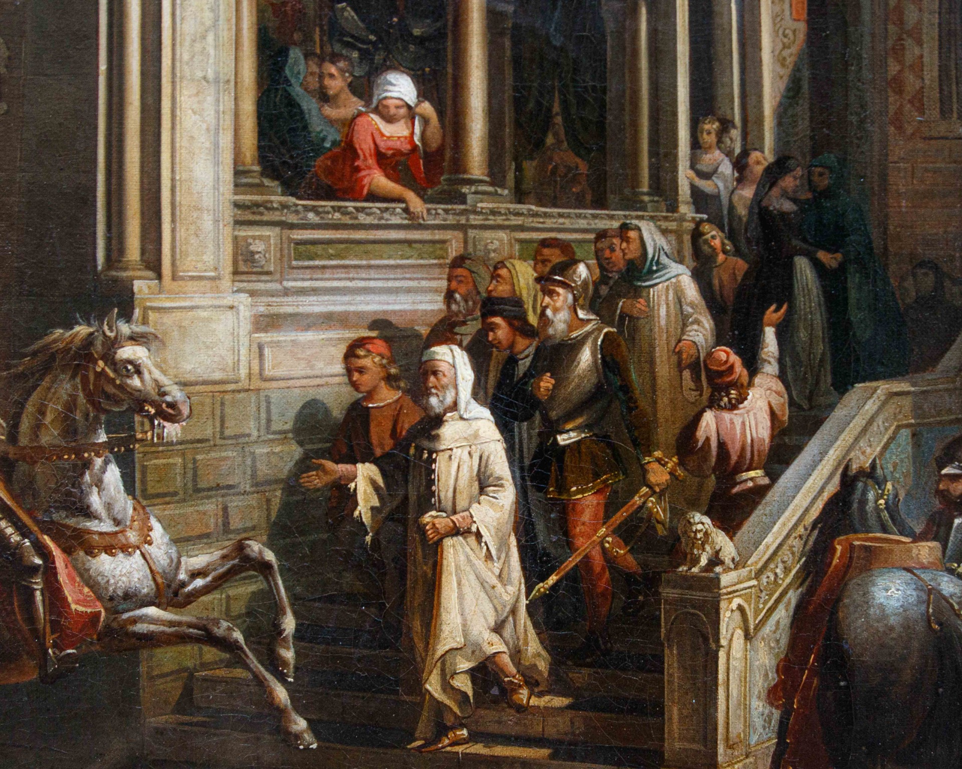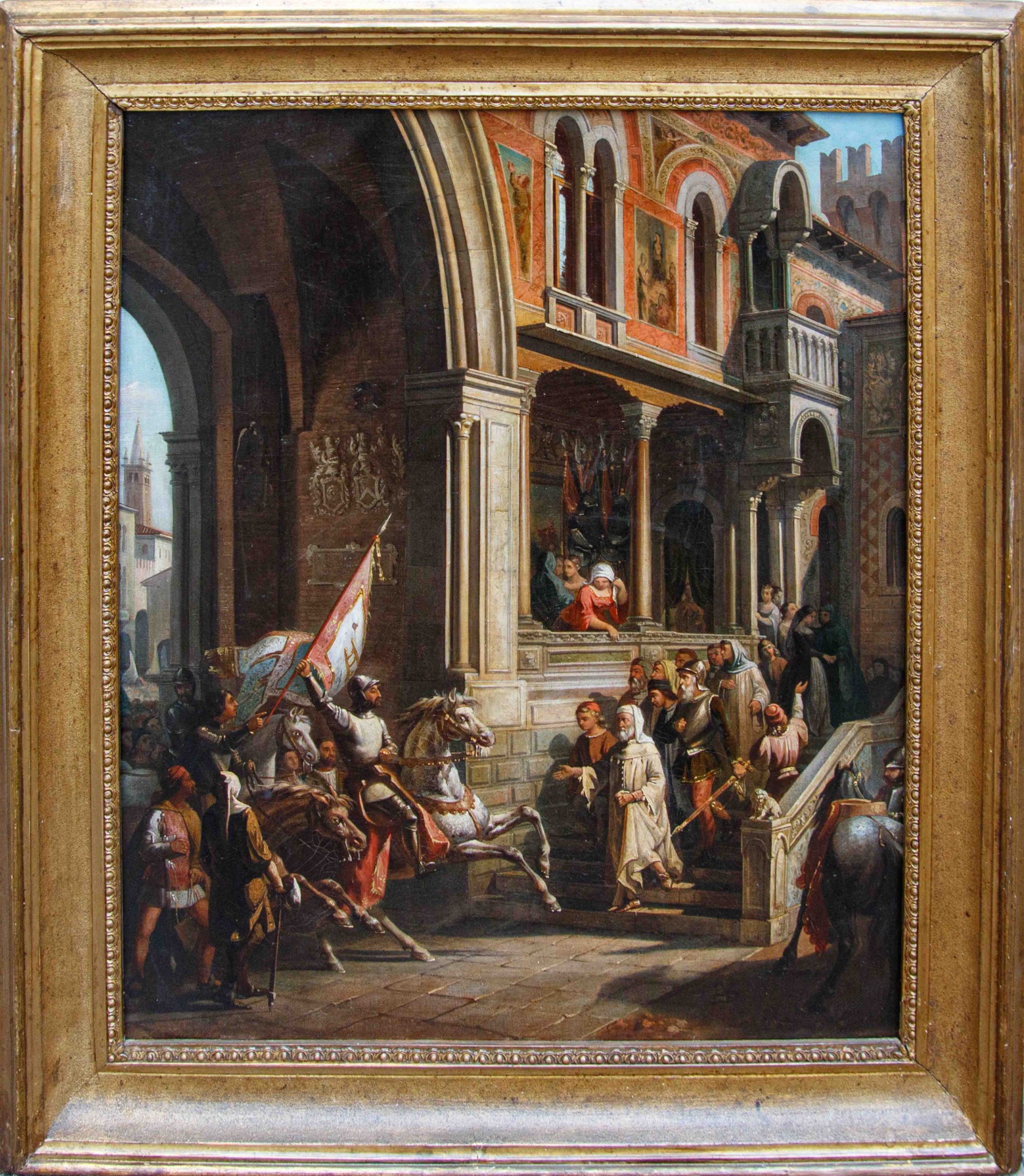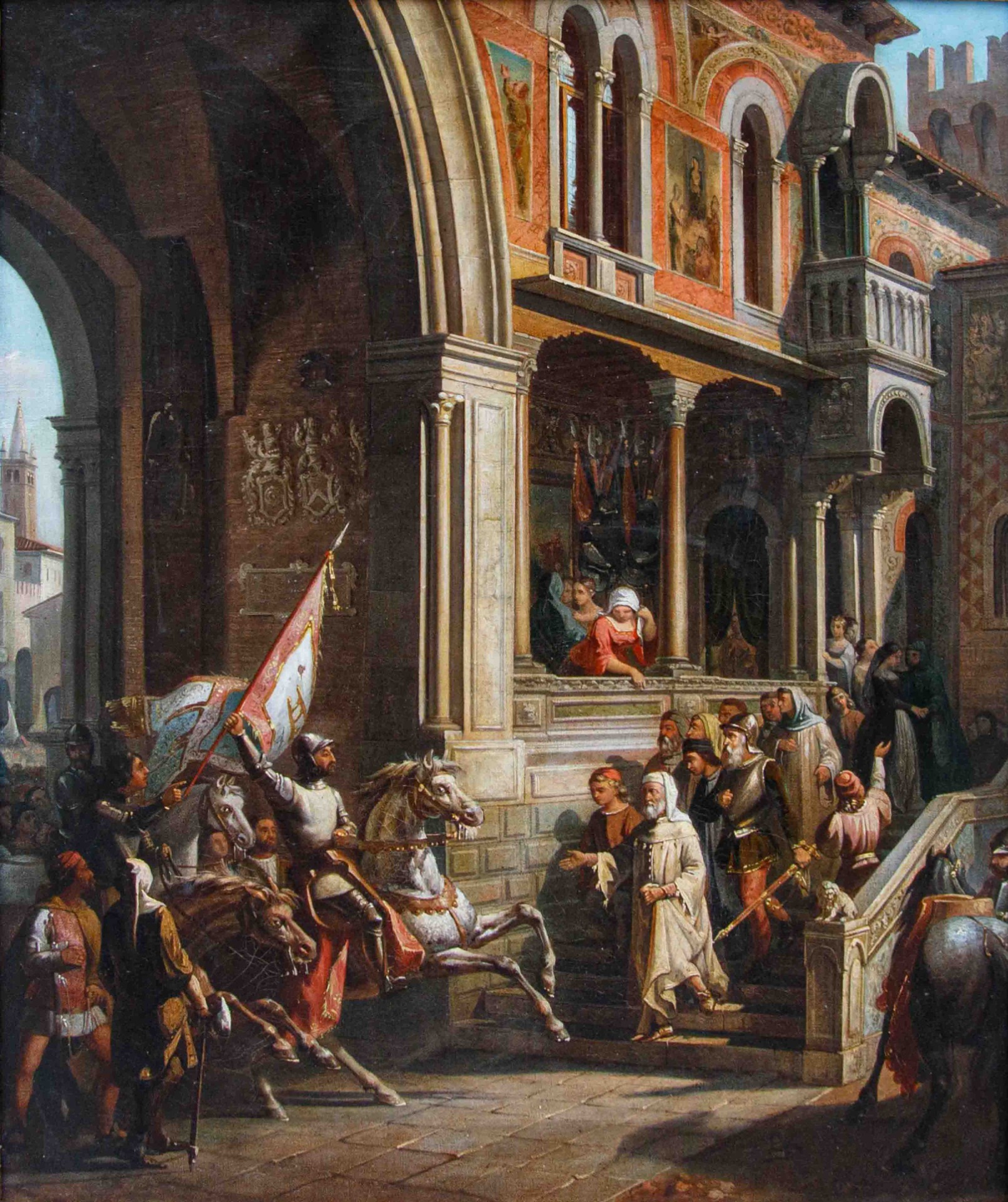 La scena si svolge davanti a un'architettura maestosa, ispirata all'arte medievale e rinascimentale italiana: arcate monumentali, colonne slanciate, logge e decorazioni policrome che richiamano l'architettura della Loggia del Consiglio di Verona. Sono raffigurati i due fratelli della famiglia Della Scala: Alboino, il primogenito, in sella al cavallo bianco mentre regge la bandiera con lo stemma araldico della famiglia (una scala), e Cangrande, sul destriero nero, subito al suo fianco.