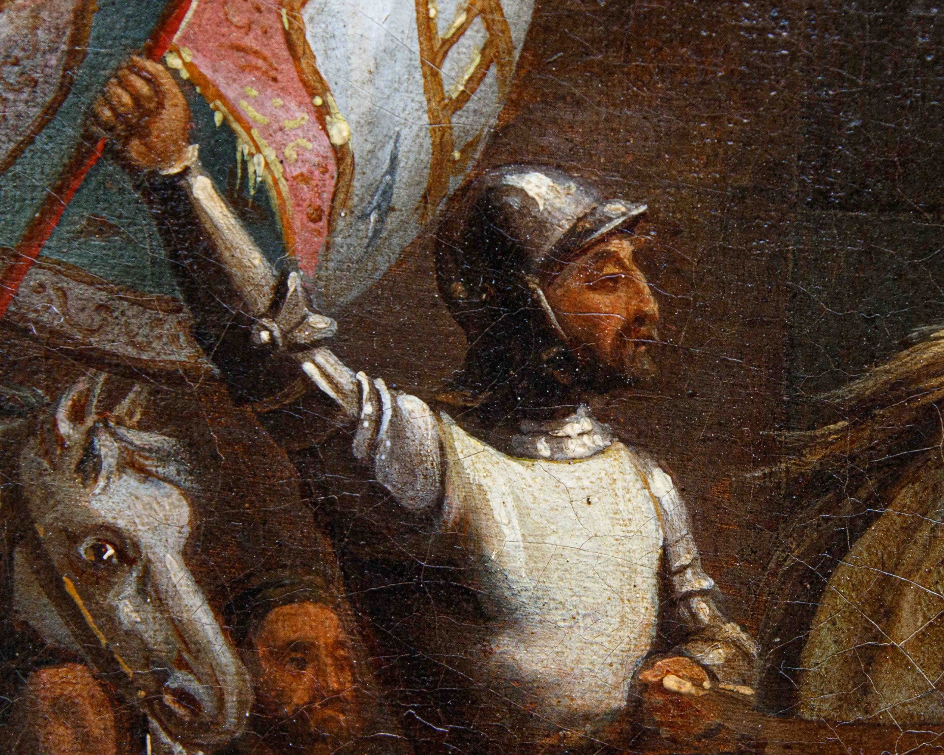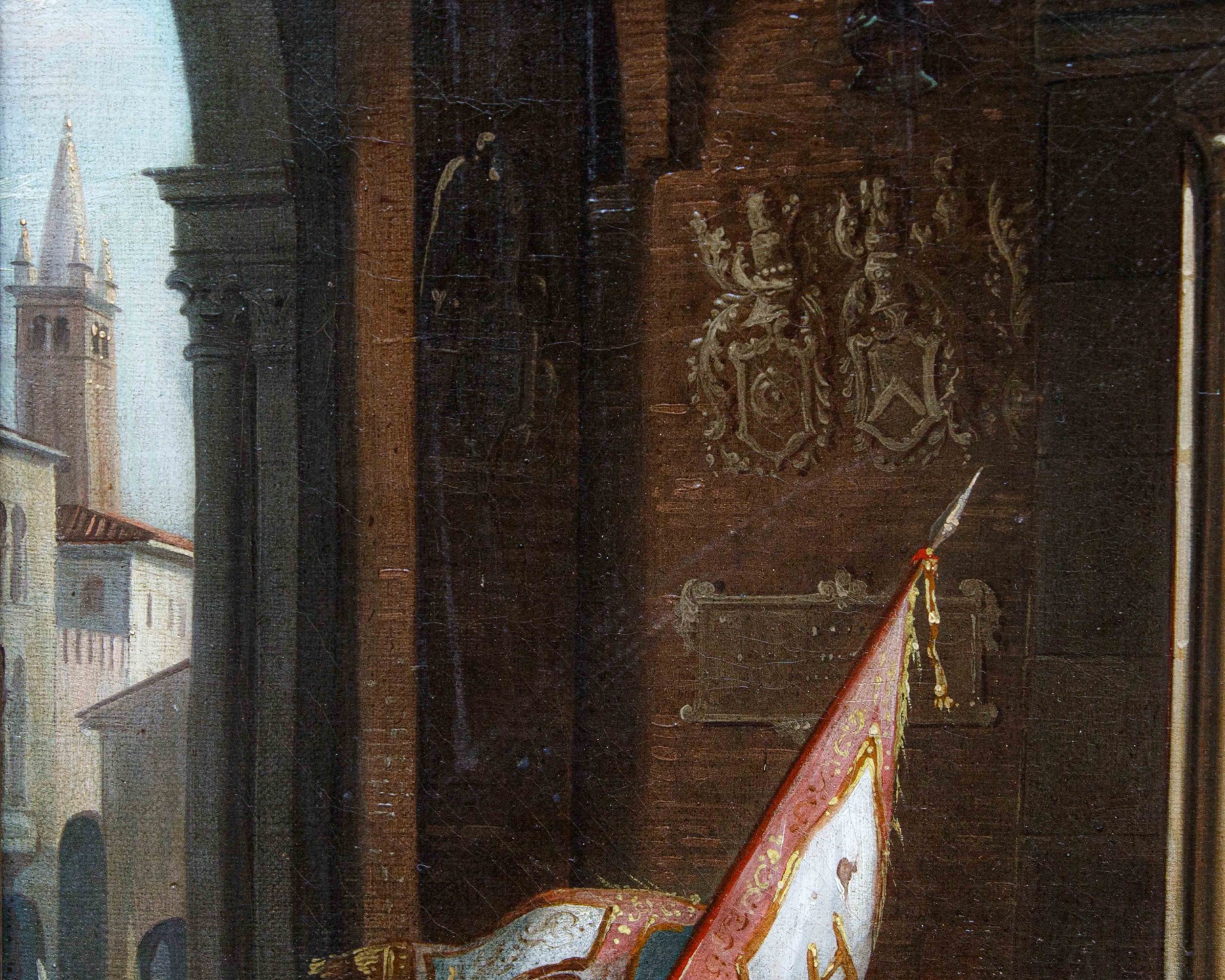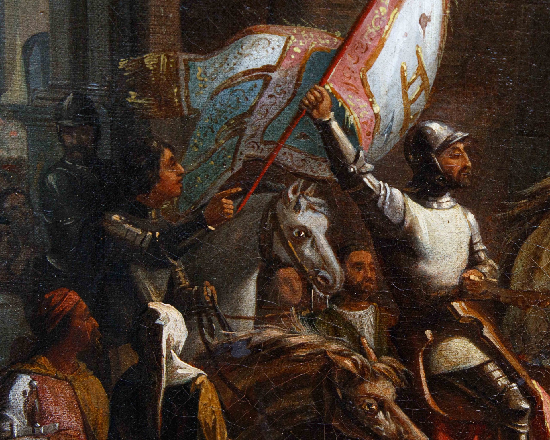 La scena si svolge davanti a un'architettura maestosa, ispirata all'arte medievale e rinascimentale italiana: arcate monumentali, colonne slanciate, logge e decorazioni policrome che richiamano l'architettura della Loggia del Consiglio di Verona. Sono raffigurati i due fratelli della famiglia Della Scala: Alboino, il primogenito, in sella al cavallo bianco mentre regge la bandiera con lo stemma araldico della famiglia (una scala), e Cangrande, sul destriero nero, subito al suo fianco.