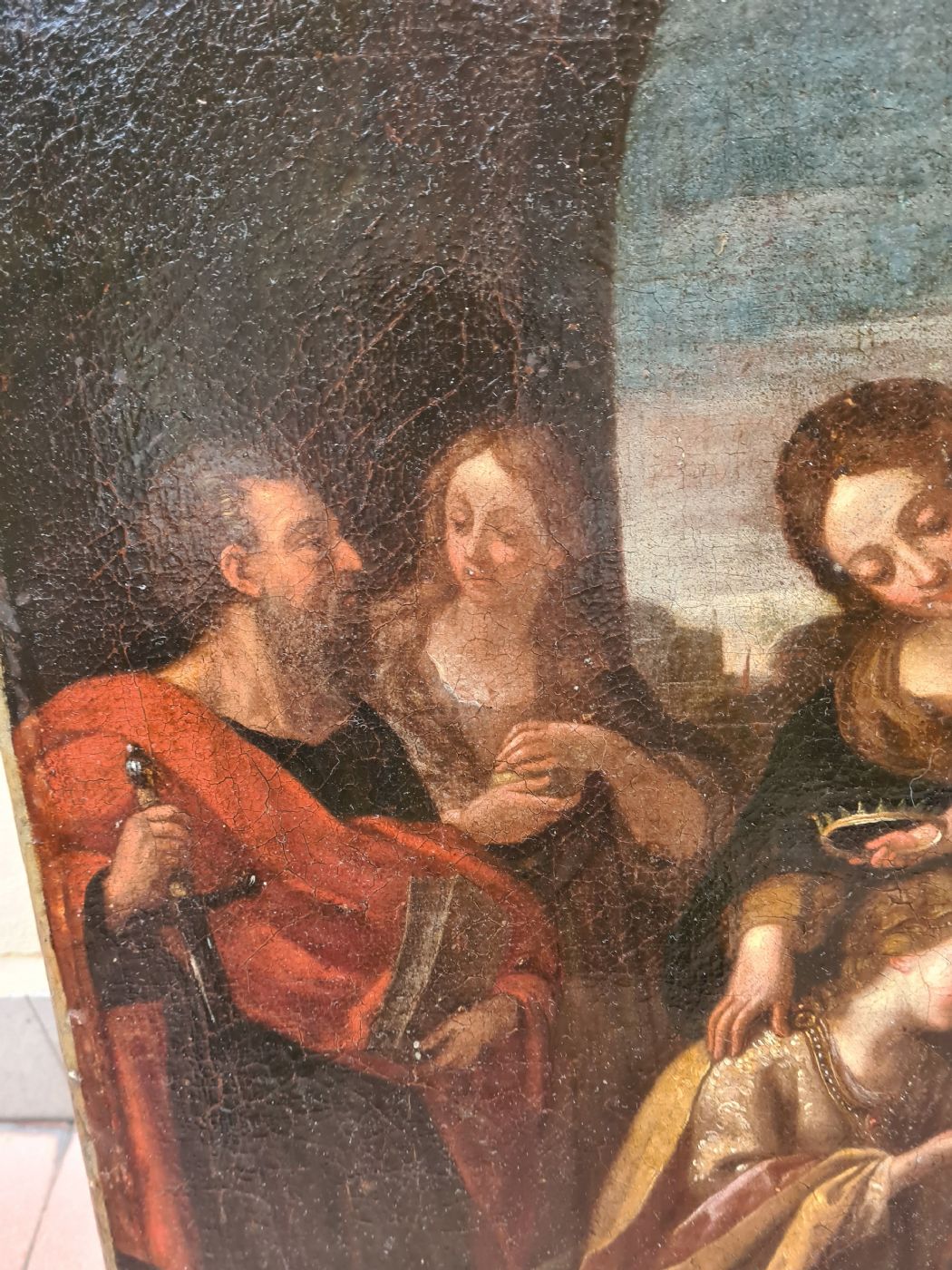 “l’Incoronazione di Santa Caterina d’Alessandria con San Paolo, Santa Maddalena e San Giovannino. Dipinto ad olio su tela, pulito e reintelato, vedi foto: H, I.
