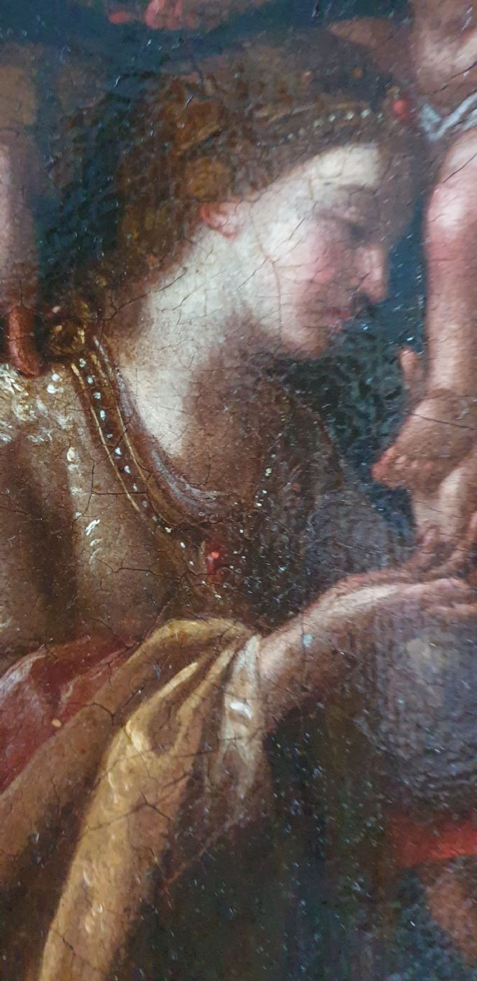 Si evidenzia la presenza del cretto, che corrisponde come caratteristica al periodo di attribuzione dell’opera, mette inoltre in evidenza i vari ritocchi di restauro presenti sul volto e sul collo.