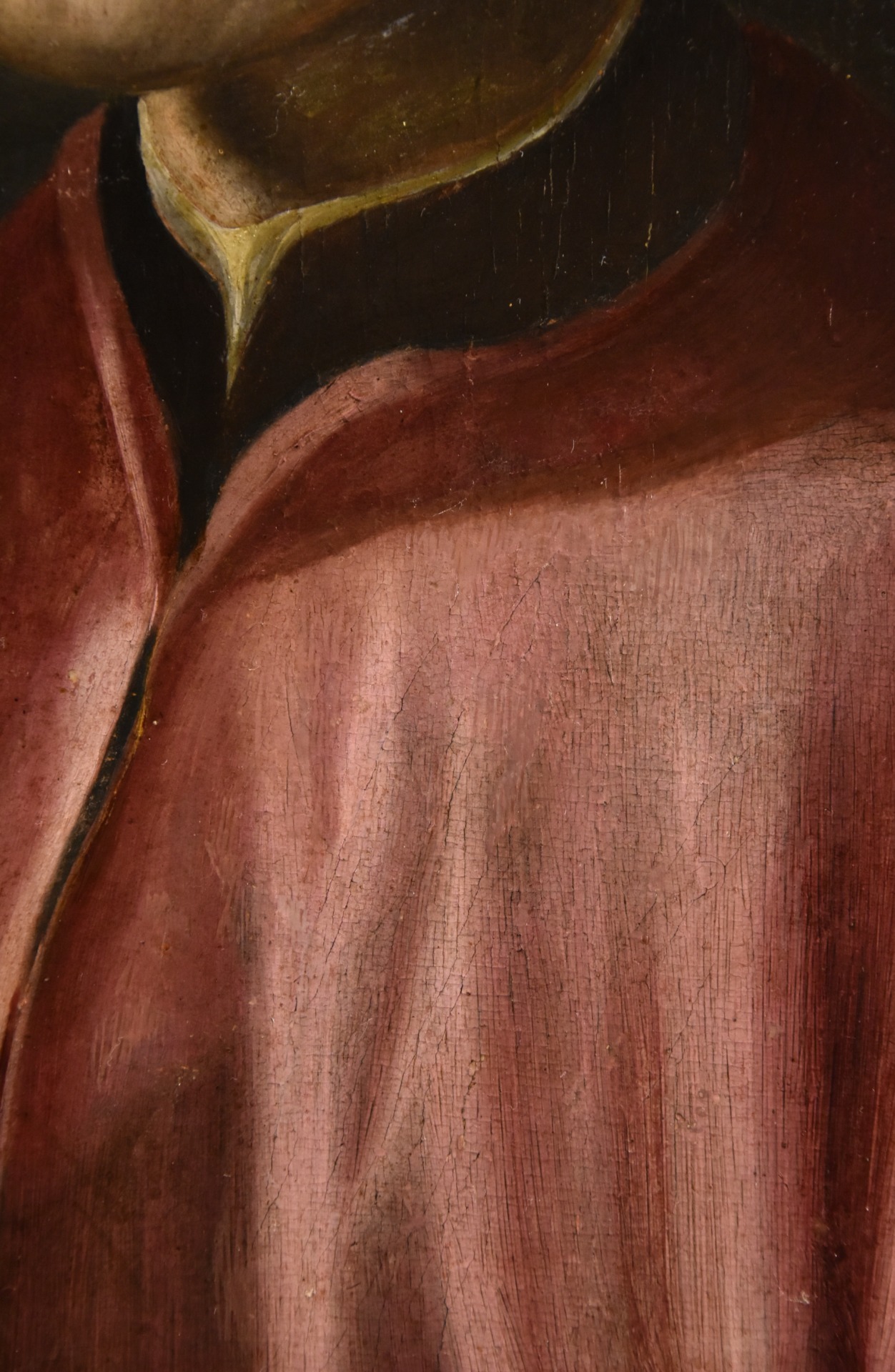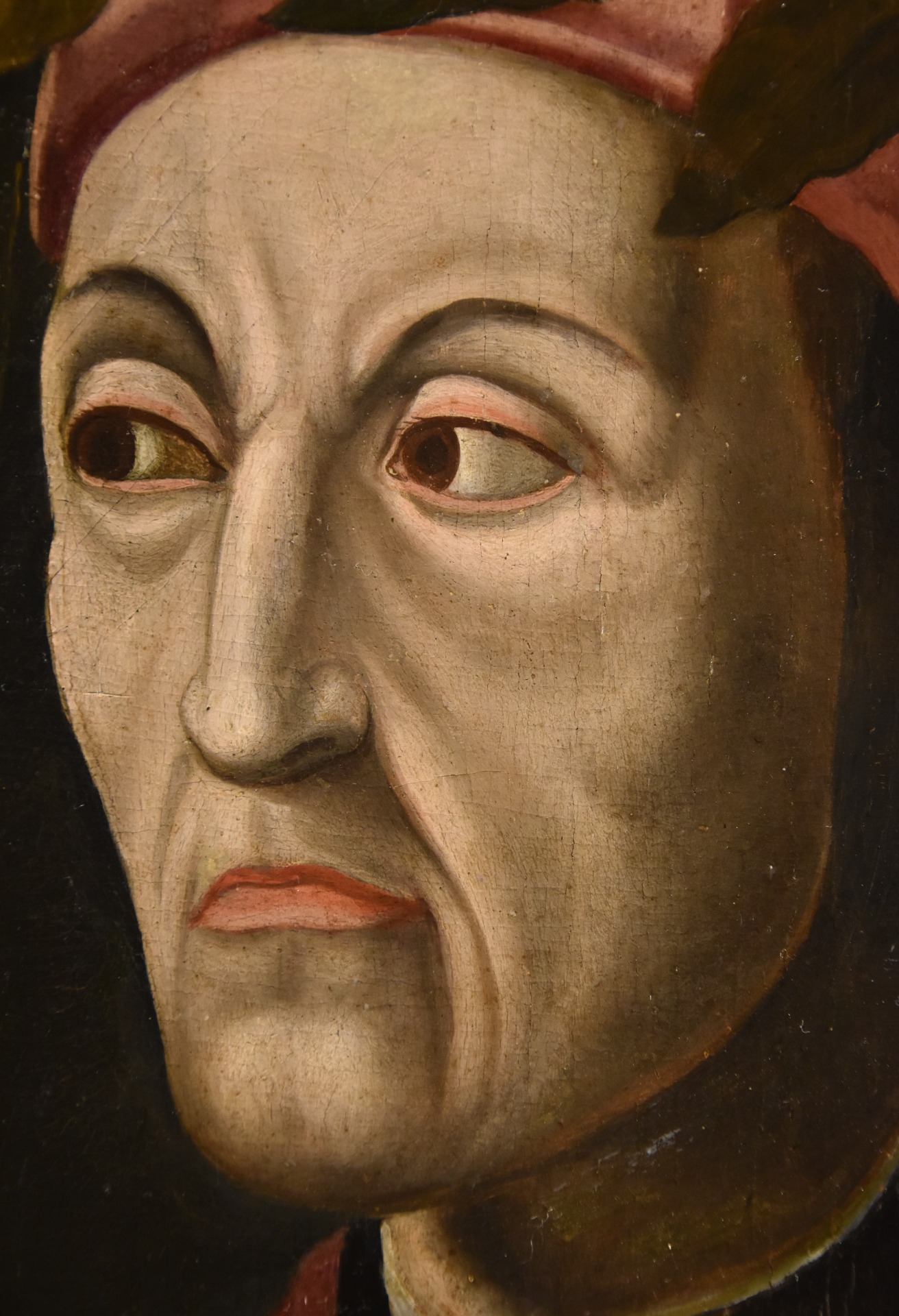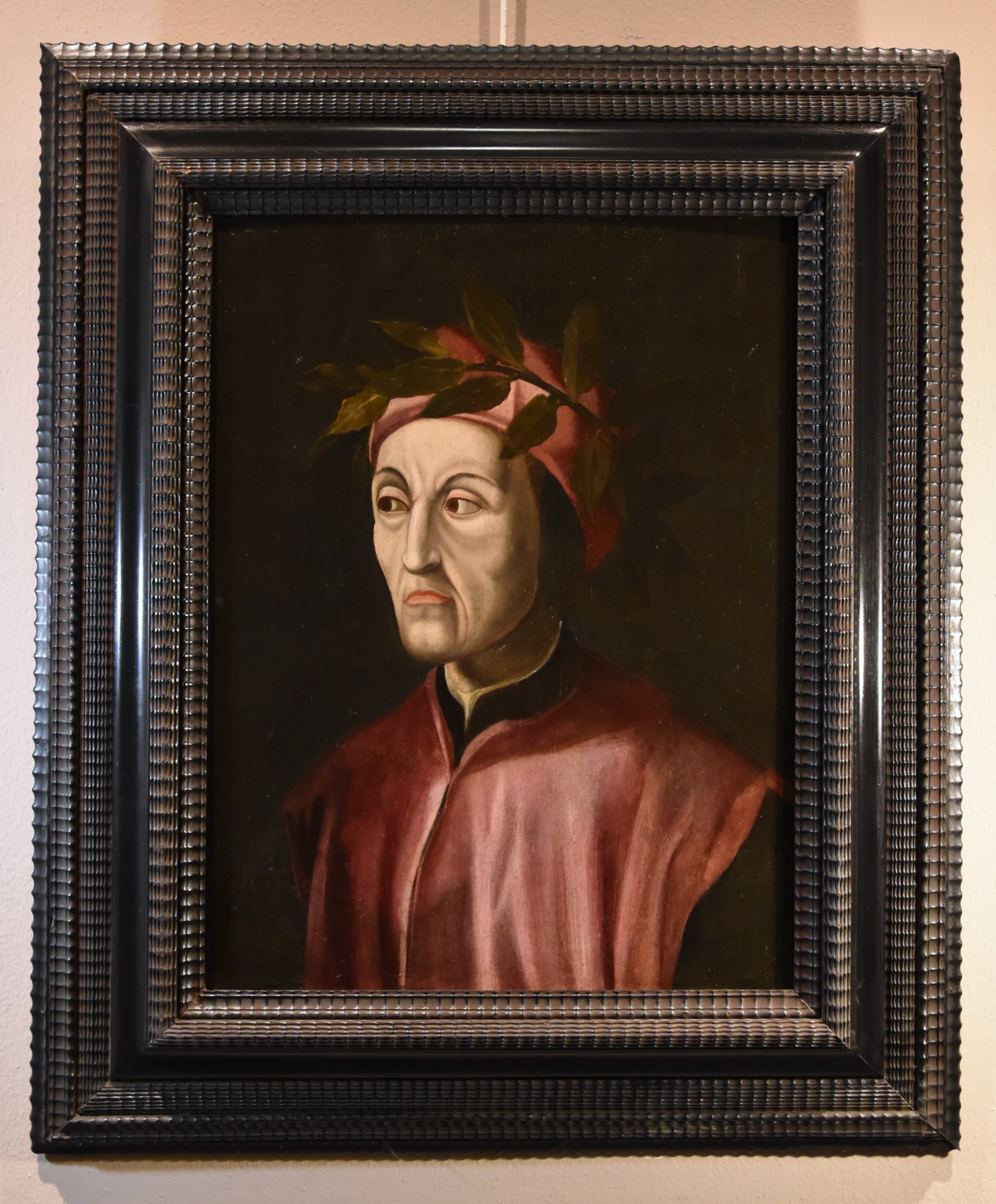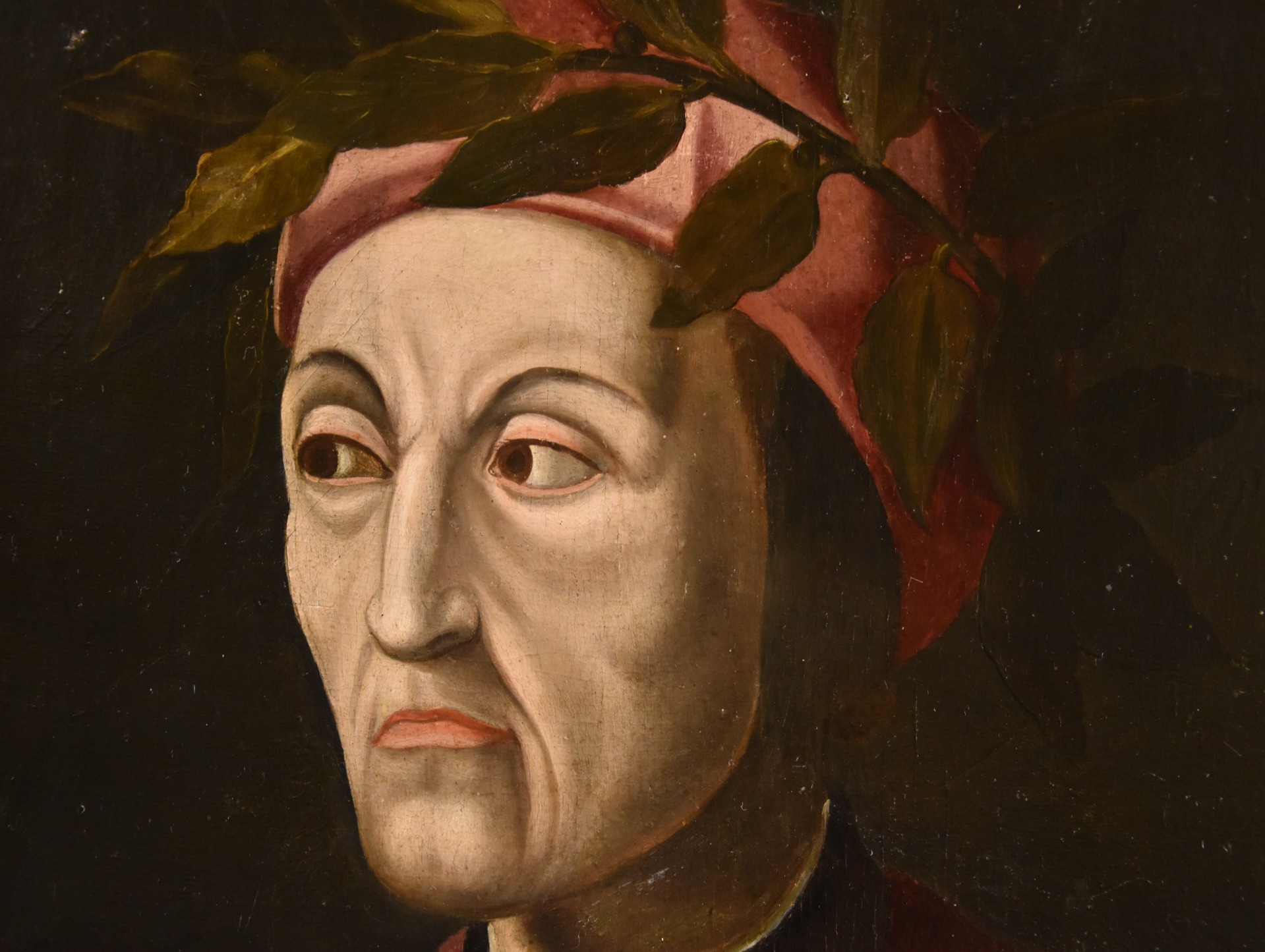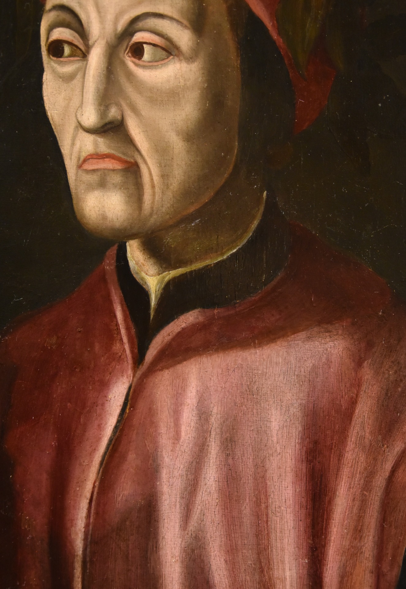 Vi presentiamo questo pregevole dipinto, uno dei rari ritratti di Dante Alighieri (Firenze 1265 – Ravenna 1321) di eccellente qualità esecutiva, da inserire nella serie dei ritratti postumi che i maggiori autori del Rinascimento dedicarono al Sommo Poeta, attestandone la sua acclamata ed immortale fama.