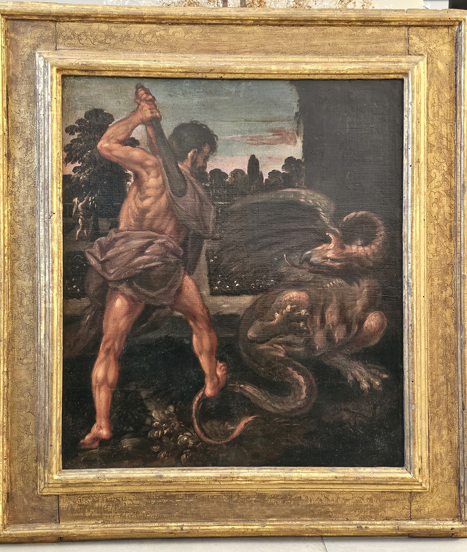 "Ercole che uccide lIdra" Scuola Emiliana del XVVI secolo . Dipinto ad olio su tela, sono presenti alcune riprese di restauro.