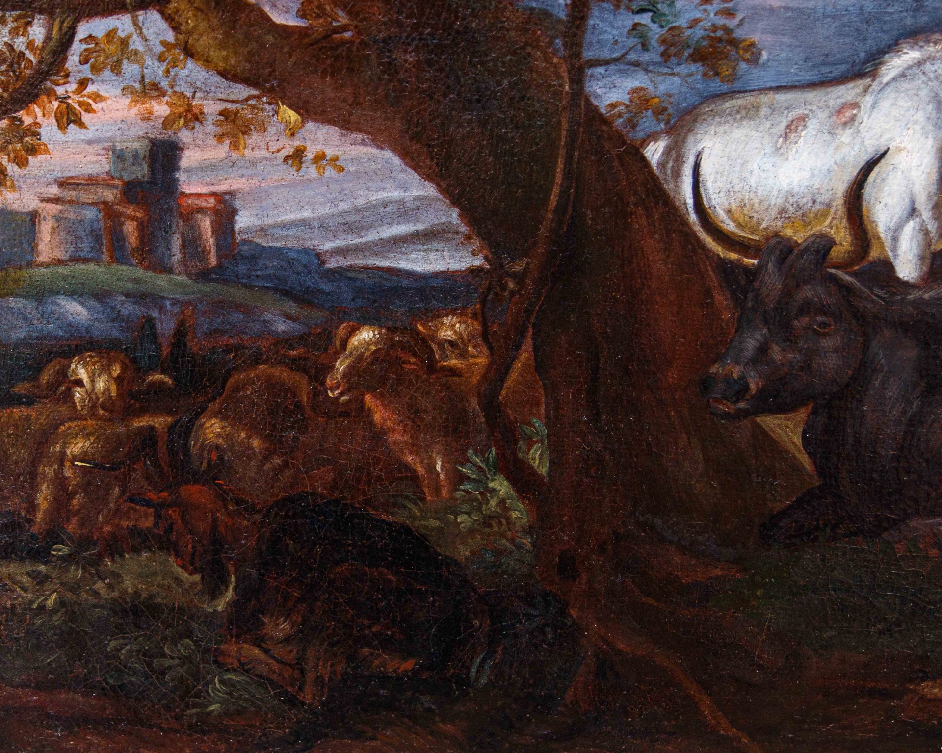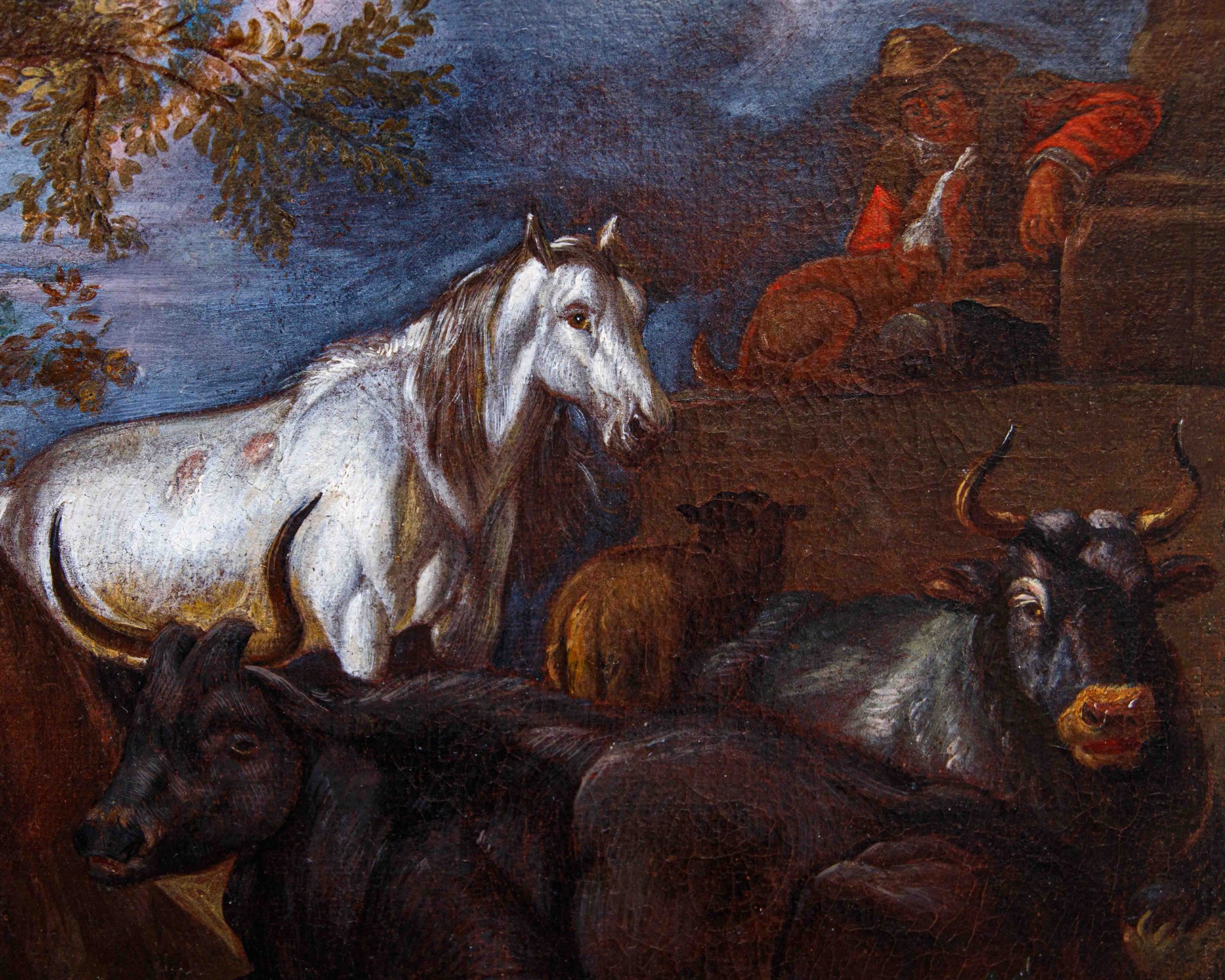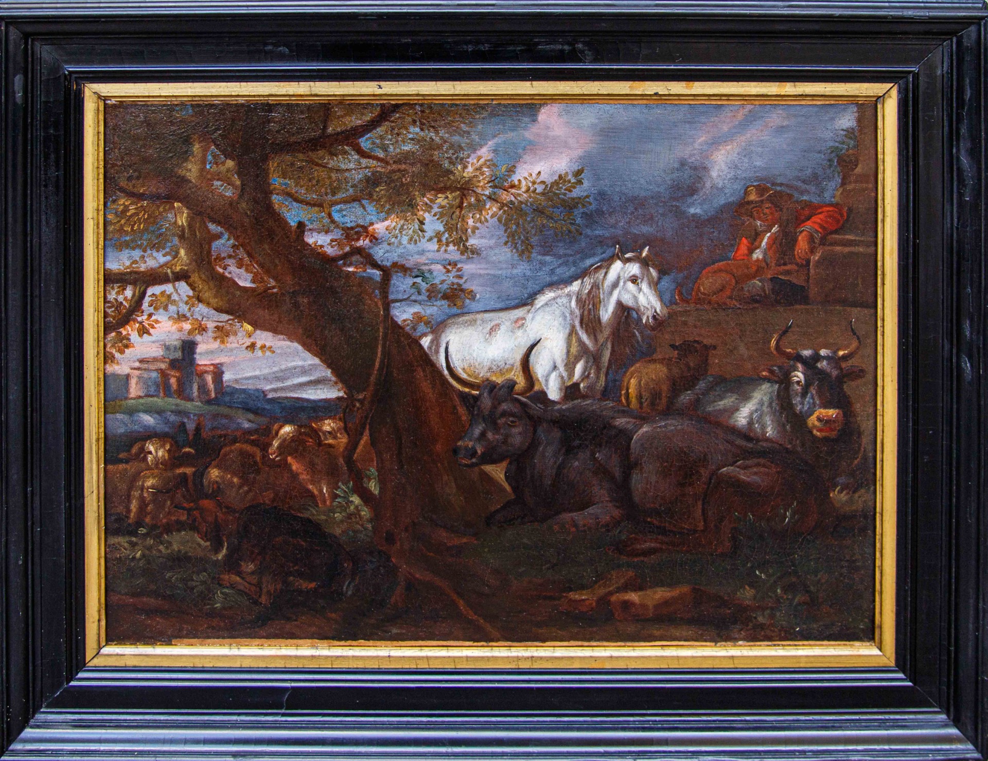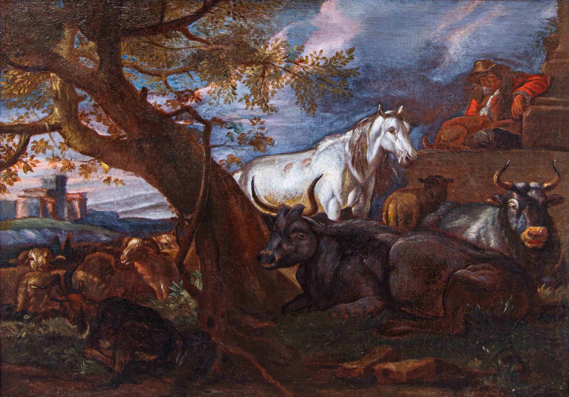 Questo dipinto offre un esempio classico di pittura di paesaggio fiamminga a Roma, che fonde la tradizione nordica con l'ambiente e la luce italiani. La scena è dominata da una tranquilla ambientazione pastorale, dove la natura e gli animali sono i veri protagonisti. L'intera composizione è pervasa da una luce diffusa e quasi dorata che crea un'atmosfera serena. Sullo sfondo, il cielo è mosso da nuvole scure, ma la luce si fa strada, illuminando il paesaggio e dando profondità alla scena. Sulla destra, seduto su una sporgenza rocciosa, un pastore riposa, con un cappello a larghe falde che nasconde parzialmente il volto. Vicino a lui, un cane lo osserva, aggiungendo un tocco di vita quotidiana. In primo piano, gli animali sono il fulcro del dipinto; due mucche, un cavallo bianco con chiazze scure si staglia contro il cielo,un bue e alcune capre, che formano una sorta di "natura morta vivente". In questo caso il pittore ha rielaborato temi già presenti a Roma, come gli animali al pascolo, che erano stati ampiamente esplorati dai cosiddetti "bamboccianti". A differenza di questi ultimi, però, ha applicato i modelli della pittura nordica, caratterizzati da un'attenzione meticolosa ai dettagli e da una composizione più elaborata. La scena è dominata da animali, che non sono semplici elementi di sfondo, ma veri protagonisti, rappresentati con un realismo vivace e una dignità quasi monumentale. Nel XVII secolo, un gruppo di artisti fiamminghi e olandesi emigrò a Roma, portando con sé una profonda sensibilità per la pittura di paesaggio e la rappresentazione del mondo naturale. Sebbene il paesaggio non fosse considerato un genere di alto rango nella gerarchia artistica italiana, questi pittori nordici, come Pieter van Bloemen e Philipp Peter Roos, furono pionieri nel creare un nuovo tipo di scena pastorale che mescolava la tradizione realistica del Nord con l'atmosfera e le rovine della campagna romana. La loro arte si concentrava sulla vita rurale, sugli animali e sul rapporto tra uomo e natura, offrendo una prospettiva nuova e intima che si differenziava dai grandi temi della pittura storica e religiosa.