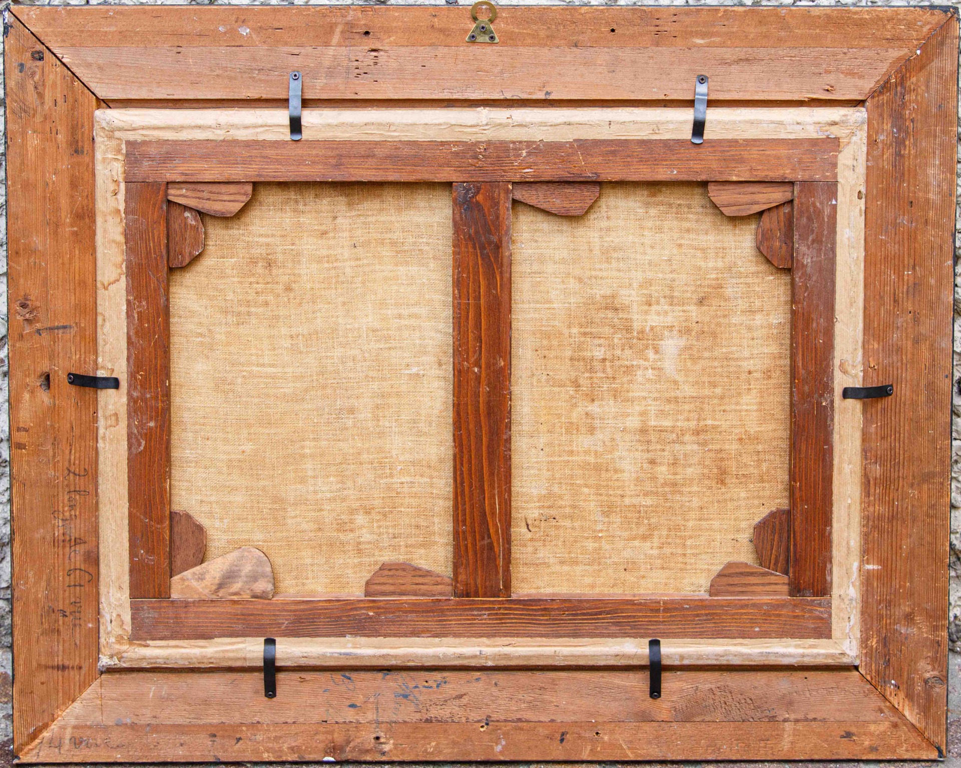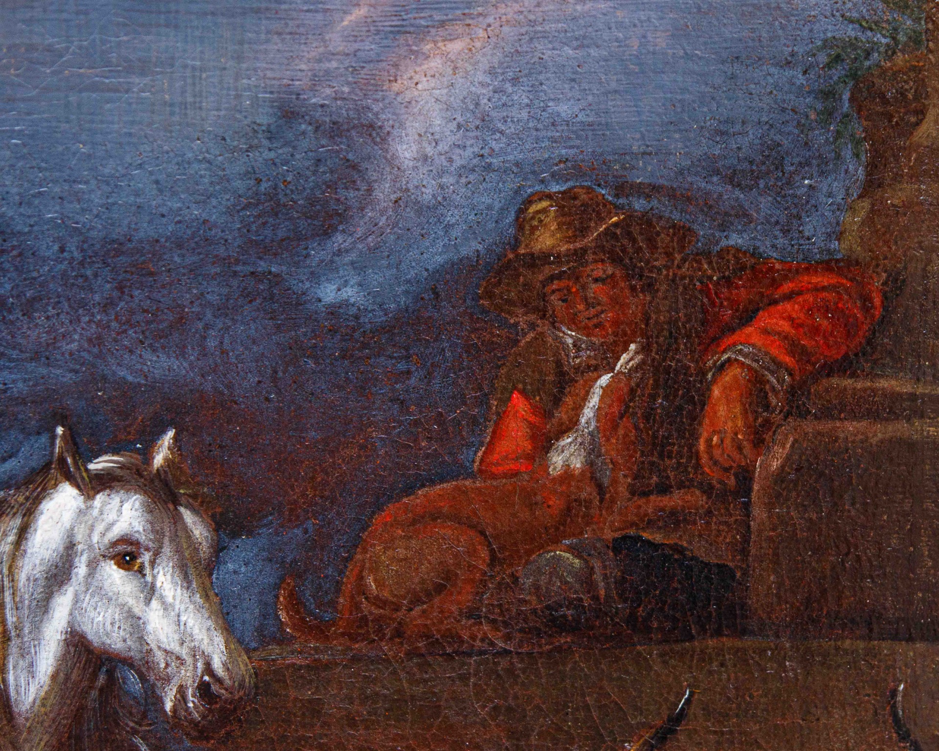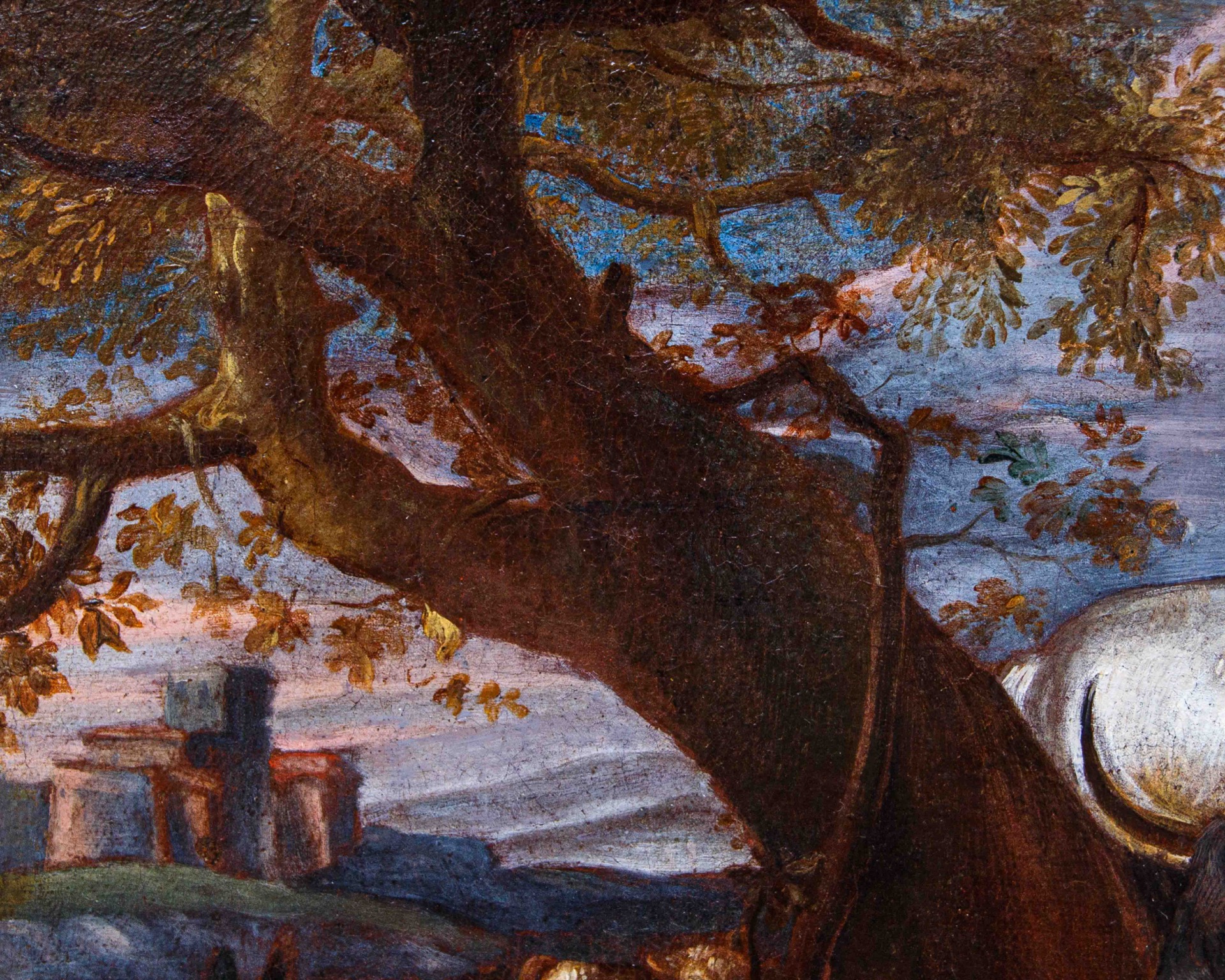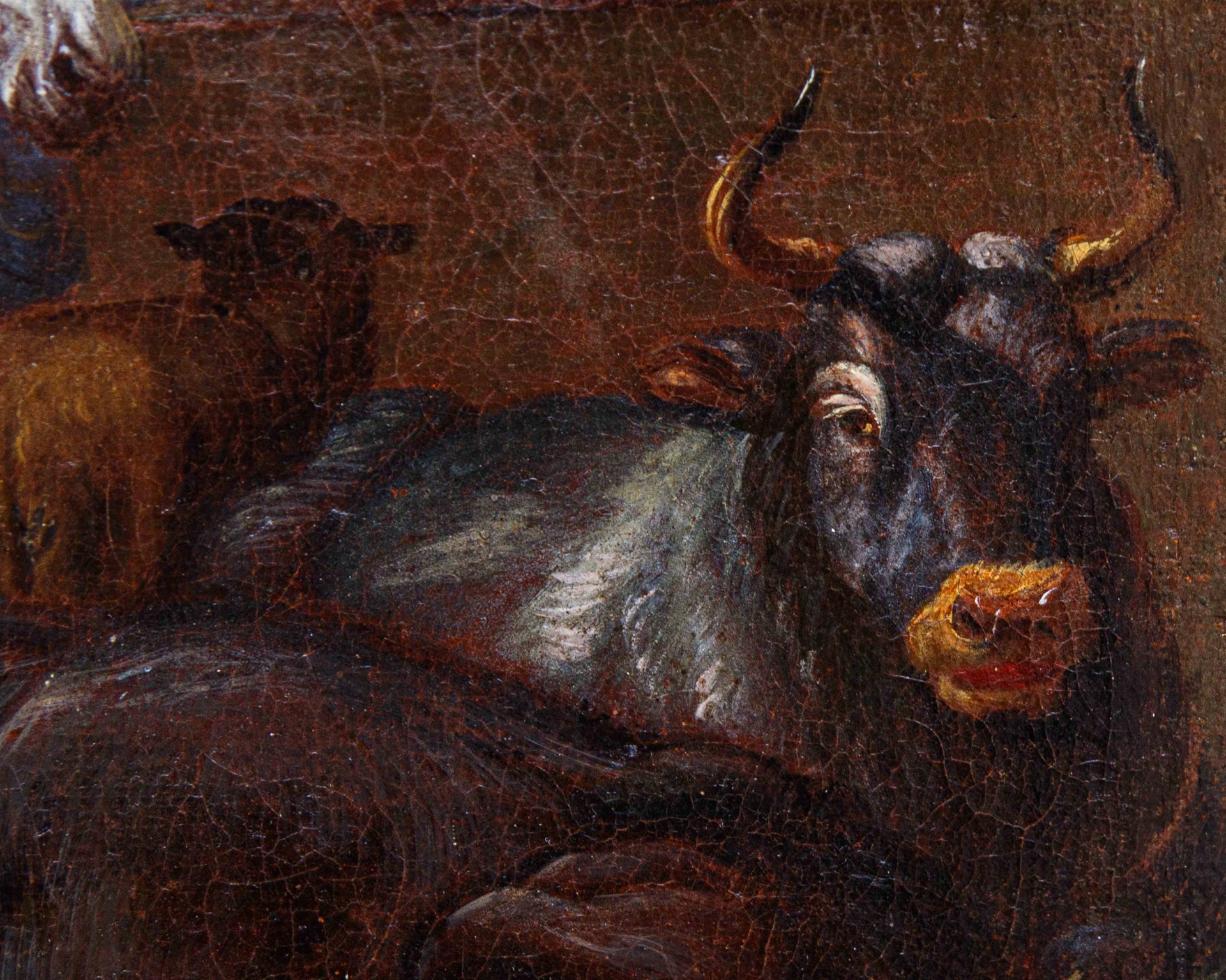 Questo dipinto offre un esempio classico di pittura di paesaggio fiamminga a Roma, che fonde la tradizione nordica con l'ambiente e la luce italiani. La scena è dominata da una tranquilla ambientazione pastorale, dove la natura e gli animali sono i veri protagonisti. L'intera composizione è pervasa da una luce diffusa e quasi dorata che crea un'atmosfera serena. Sullo sfondo, il cielo è mosso da nuvole scure, ma la luce si fa strada, illuminando il paesaggio e dando profondità alla scena. Sulla destra, seduto su una sporgenza rocciosa, un pastore riposa, con un cappello a larghe falde che nasconde parzialmente il volto. Vicino a lui, un cane lo osserva, aggiungendo un tocco di vita quotidiana. In primo piano, gli animali sono il fulcro del dipinto; due mucche, un cavallo bianco con chiazze scure si staglia contro il cielo,un bue e alcune capre, che formano una sorta di "natura morta vivente". In questo caso il pittore ha rielaborato temi già presenti a Roma, come gli animali al pascolo, che erano stati ampiamente esplorati dai cosiddetti "bamboccianti". A differenza di questi ultimi, però, ha applicato i modelli della pittura nordica, caratterizzati da un'attenzione meticolosa ai dettagli e da una composizione più elaborata. La scena è dominata da animali, che non sono semplici elementi di sfondo, ma veri protagonisti, rappresentati con un realismo vivace e una dignità quasi monumentale. Nel XVII secolo, un gruppo di artisti fiamminghi e olandesi emigrò a Roma, portando con sé una profonda sensibilità per la pittura di paesaggio e la rappresentazione del mondo naturale. Sebbene il paesaggio non fosse considerato un genere di alto rango nella gerarchia artistica italiana, questi pittori nordici, come Pieter van Bloemen e Philipp Peter Roos, furono pionieri nel creare un nuovo tipo di scena pastorale che mescolava la tradizione realistica del Nord con l'atmosfera e le rovine della campagna romana. La loro arte si concentrava sulla vita rurale, sugli animali e sul rapporto tra uomo e natura, offrendo una prospettiva nuova e intima che si differenziava dai grandi temi della pittura storica e religiosa.