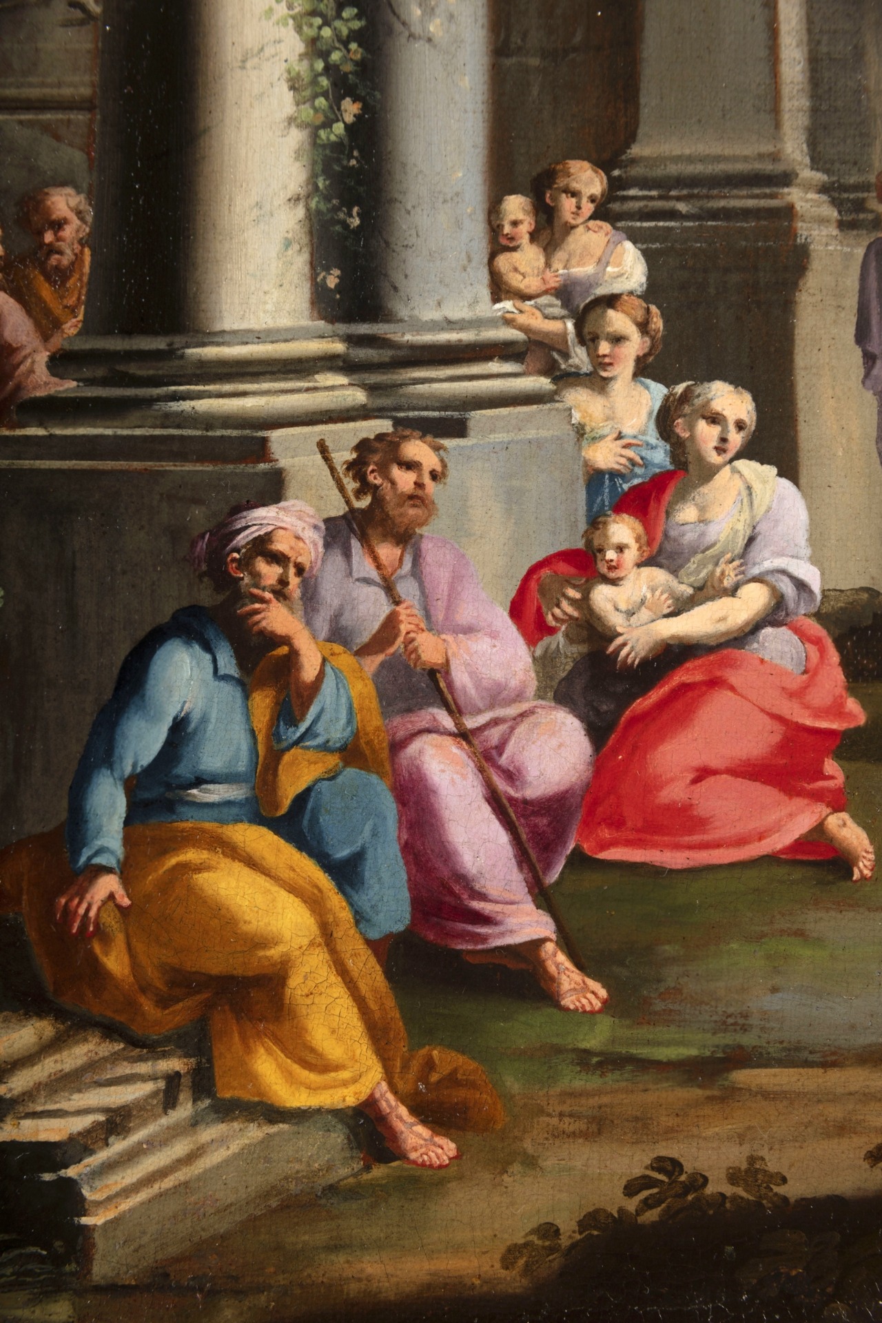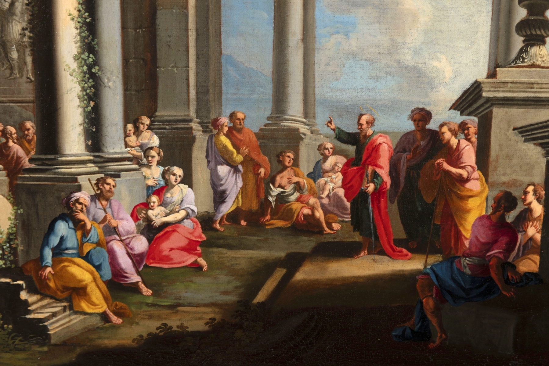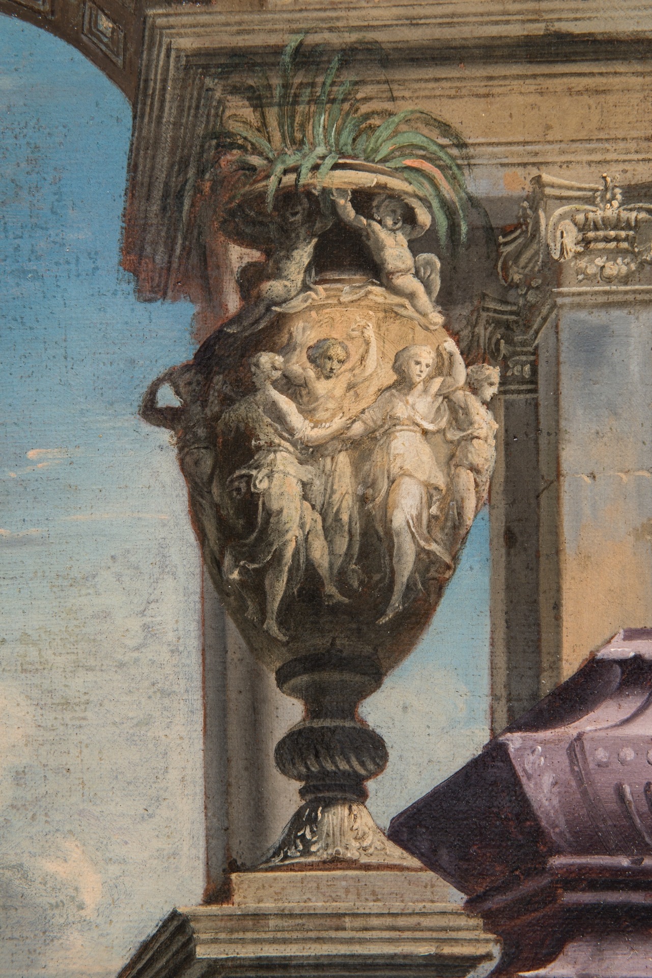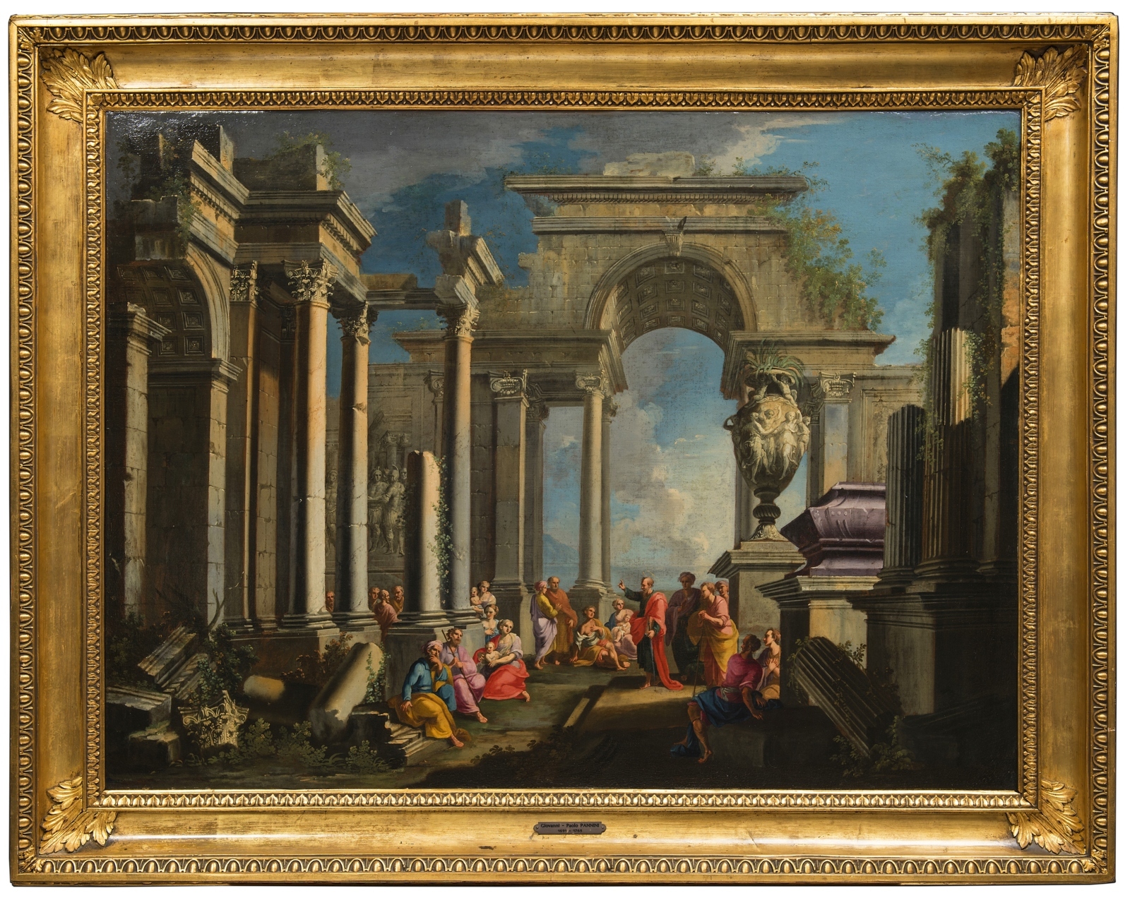 L’opera, dipinta con gran finezza anche nei dettagli e nelle piccole figurine, è certamente attribuibile all’importante pittore romano Alberto Carlieri (Roma, 1672 - 1720) in quanto si possono riscontrare motivi stilistici comuni dei suoi lavori. Elementi caratteristici sono le suggestive disposizioni compositive e la notevole maestria nella regia delle luci, così come la ricchezza dell’architettura e il raffinato, nonché minuzioso, descrittivismo dei particolari. Peculiare dell’autore è anche l’atteggiamento vivace delle figure, risolte con scioltezza nell’uso del colore, e inserite armoniosamente nelle architetture. Carlieri nasce a Roma nel 1672 e si avvia allo studio della pittura di architetture sotto la guida di Giuseppe de Marchis. Diviene allievo e poi collaboratore di Andrea Pozzo. Presente nelle più illustri quadrerie romane, dalla collezione di Filippo II Colonna, dei Rospigliosi e del cardinal Valenti Gonzaga, Carlieri elabora modelli compositivi ben riconoscibili, influenzati, oltre che dalla pittura del maestro anche quella di Viviano e Nicolò Codazzi. La sua attività pittorica è seguibile tramite le opere firmate, attorno alle quali è stato possibile costruire un catalogo non piccolo di tele. Le notizie sul Carlieri e le sue opere firmate o datate si scalano fra 1690 e 1720 circa. Nulla di preciso si conosce della vita del pittore, che dovrebbe essere morto a Roma poco dopo il 1720. Tra gli studi sul Carlieri risulta significativo quanto indagato da Marshall, e in seguito ribadito da Giancarlo Sestieri, circa l’influenza che Giovanni Ghisolfi (Milano 1623-1683) e Giovanni Paolo Panini (Piacenza 1691 – Roma 1765) ebbero sulle architetture del nostro pittore. Vi sono alcune perplessità attributive per certe opere, storicamente date al Panini o al Ghisolfi, che potrebbero invece essere restituite al Carlieri o viceversa. Al centro di una diatriba attributiva vi è il Capriccio con la predica di un apostolo conservato come Panini autografo al Museo Cristiano di Esztergom in Ungheria ma che fu anche attribuito a Ghisolfi o allo stesso Carlieri, come propone Sestieri. Certamente il nostro pittore, soprattutto nelle tele sviluppate verticalmente, ripropone numerosi elementi tratti dal “Esztergom composizion”, come viene definito questo modulo compositivo in tutte le sue varianti. Si tratta di composizioni in cui le grandi architetture sono frammentarie; pittoresche verzure le ricoprono in parte; resti architettonici si trovano ammassati a terra; è sempre presente un dettaglio architettonico con la trabeazione del colonnato interrotta; la prospettiva ha una fuga laterale rispetto alla composizione; è sovente ambientata una scena raffigurante la predica di Cristo o di un santo. Carlieri sfrutta con assiduità questo schema compositivo. Possiamo in parte riscontrarlo anche nel dipinto in oggetto benchè sia sviluppato orizzontalmente. In questi dipinti, e in generale nei lavori di questo artista, si riscontrano sovente alcune figure o oggetti che l’autore ama inserire con alcune piccole varianti. Tra queste vi è il vaso di epoca classica in pietra con figure femminili a bassorilievo. Altrettanto il personaggio semidisteso che si sostiene con un braccio a terra. Questo particolare, molto frequente e raffigurato anche in modo speculare, può quasi considerarsi una firma del Carlieri. L’autore raffigura più volte la predica di un apostolo. Come sottolinea Sestieri, dovettero essere i soggetti a guidare le commissioni di Carlieri. Ad alcuni pertanto arrise a maggior successo, stando alle loro numerose versioni, come le «Parabole» o le «Prediche» di Cristo o di Apostoli. Nel presente studio (vedi expertise allegato) sono stati portati a confronto alcuni dei più significativi esempi.