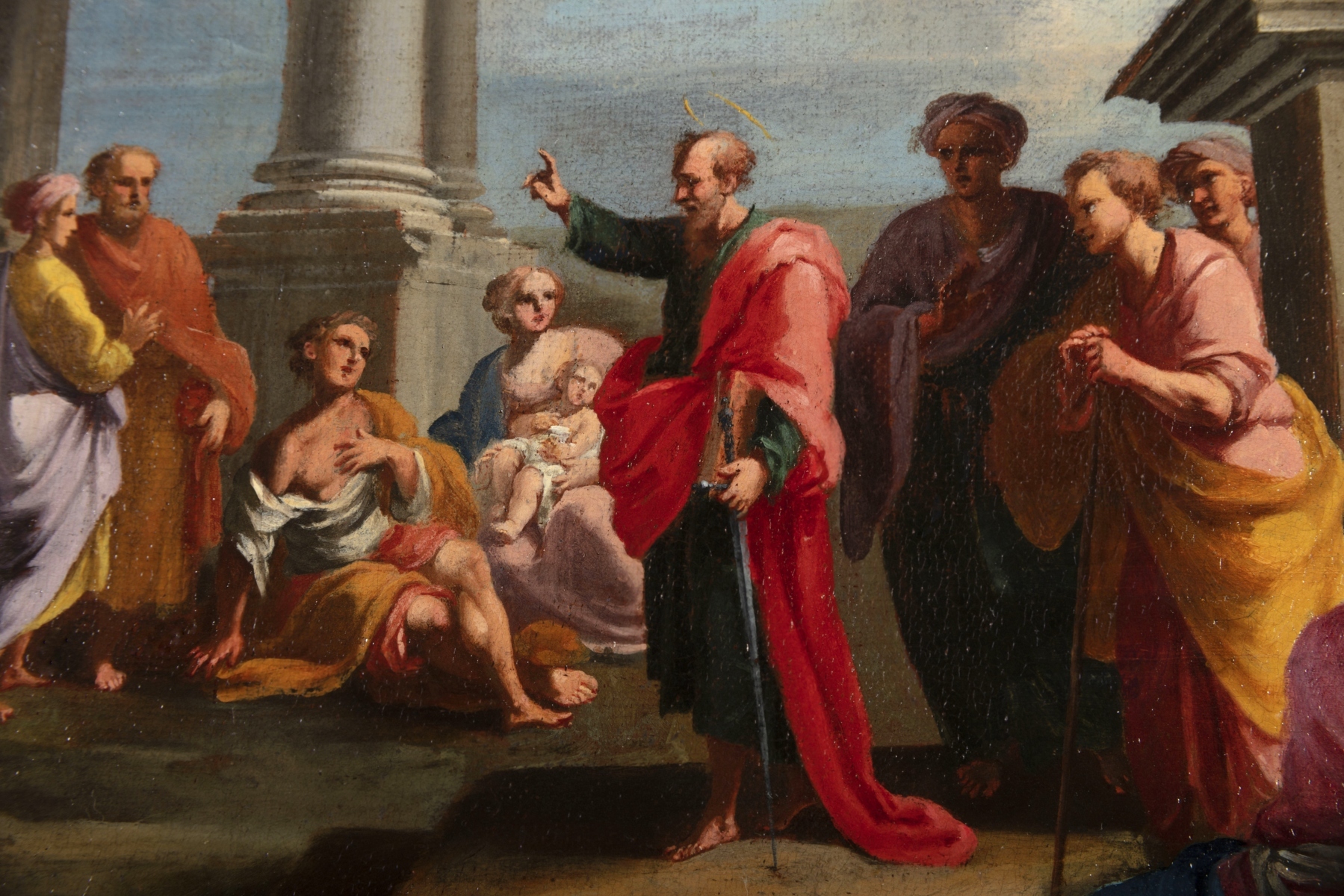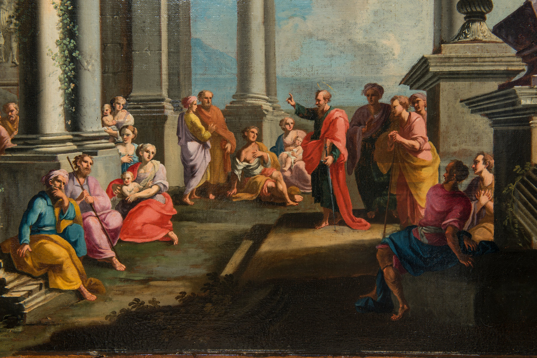 Il grande e pregevole dipinto, realizzato ad olio su tela, raffigura un Capriccio architettonico con la predica di san Paolo nell'Areopago di Atene. L’opera è attribuibile alla mano del celebre pittore romano Alberto Carlieri (Roma 1672-1720). Sul retro del telaio si trovano due sigilli in ceralacca con stemma e motto del committente o di una successiva proprietà nobiliare.