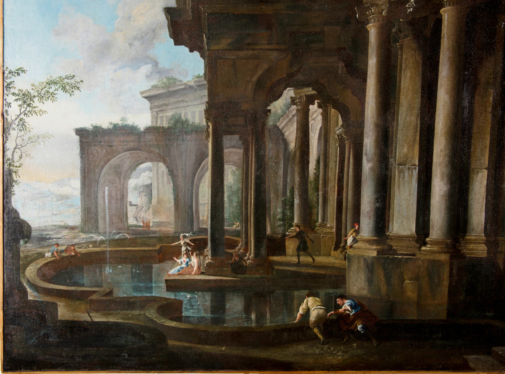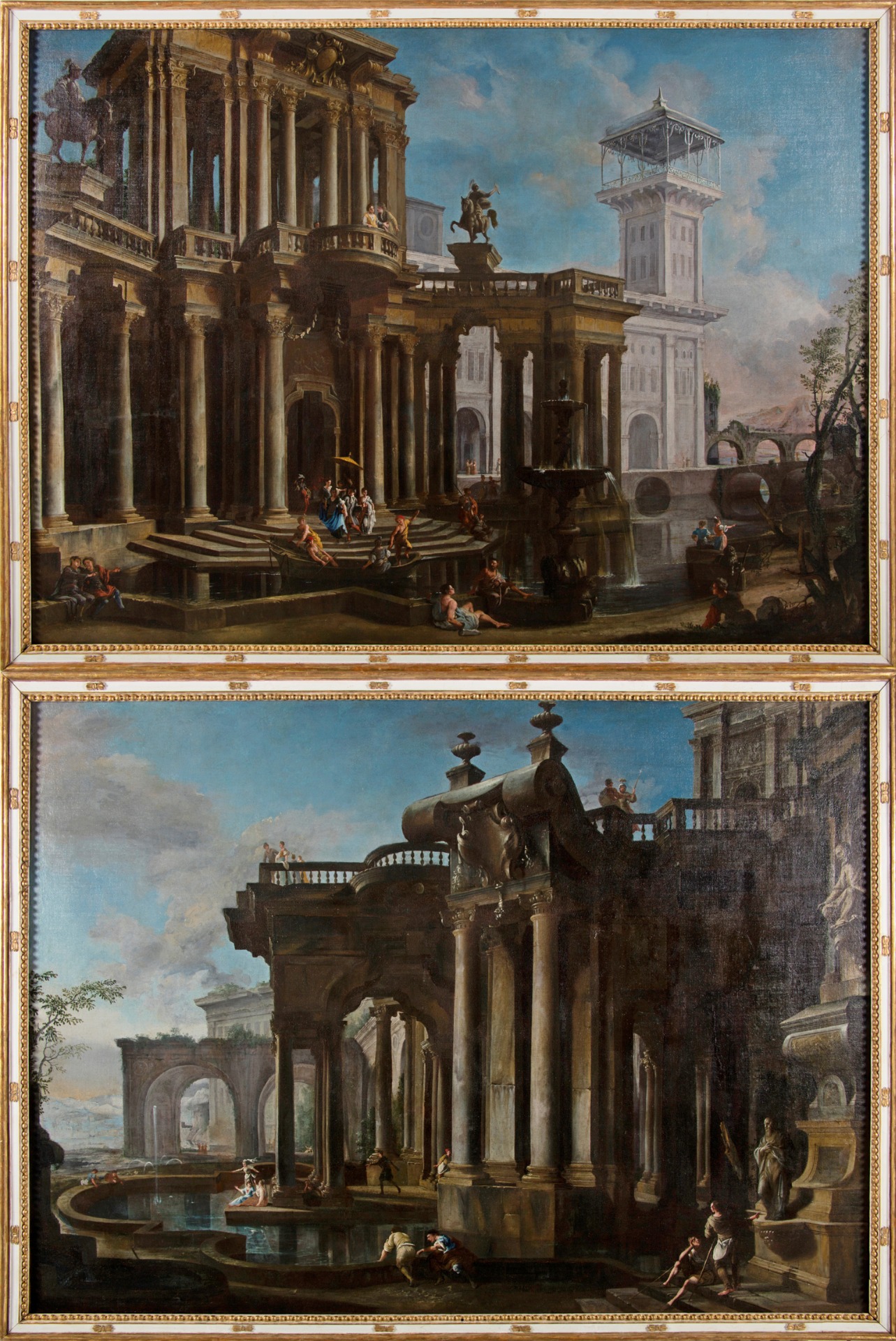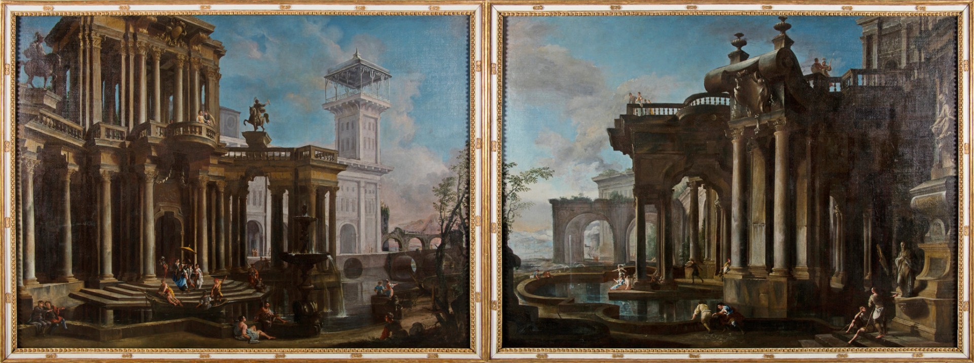 Le due grandi e pregevoli tele raffigurano due capricci architettonici, con scorci di colonnati ed edifici ad arcate, animati da figure. Le composizioni si caratterizzano per l’armonia con cui il pittore introduce i fastosi monumenti architettonici, gli specchi d’acqua, gli edifici in lontananza e gli scorci di paesaggio. Domina una cromia giocata sui toni di marroni e ocra che si staglia sul cielo azzurro, segnato da qualche nuvola di vapore. Anche l’inserimento delle figure per vivacizzare le vedute architettoniche si pone in equilibrio con l’insieme. Il capriccio architettonico, genere artistico che si fa strada nella pittura italiana a partire dal XVII secolo, è caratterizzato dalla raffigurazione di architetture fantastiche o invenzioni di tipo prospettico, talvolta combinate con elementi tratti liberamente dalla realtà. Le due tele sono un esplicativo esempio di questa tipologia e presentano un notevole interesse artistico. La notevole qualità pittorica emerge sia dalla composizione d’insieme che dal modo in cui l’artista descrive le vedute con grande attenzione ai dettagli, alle lumeggiature e al ricercato, perfettamente realistico, chiaroscuro.