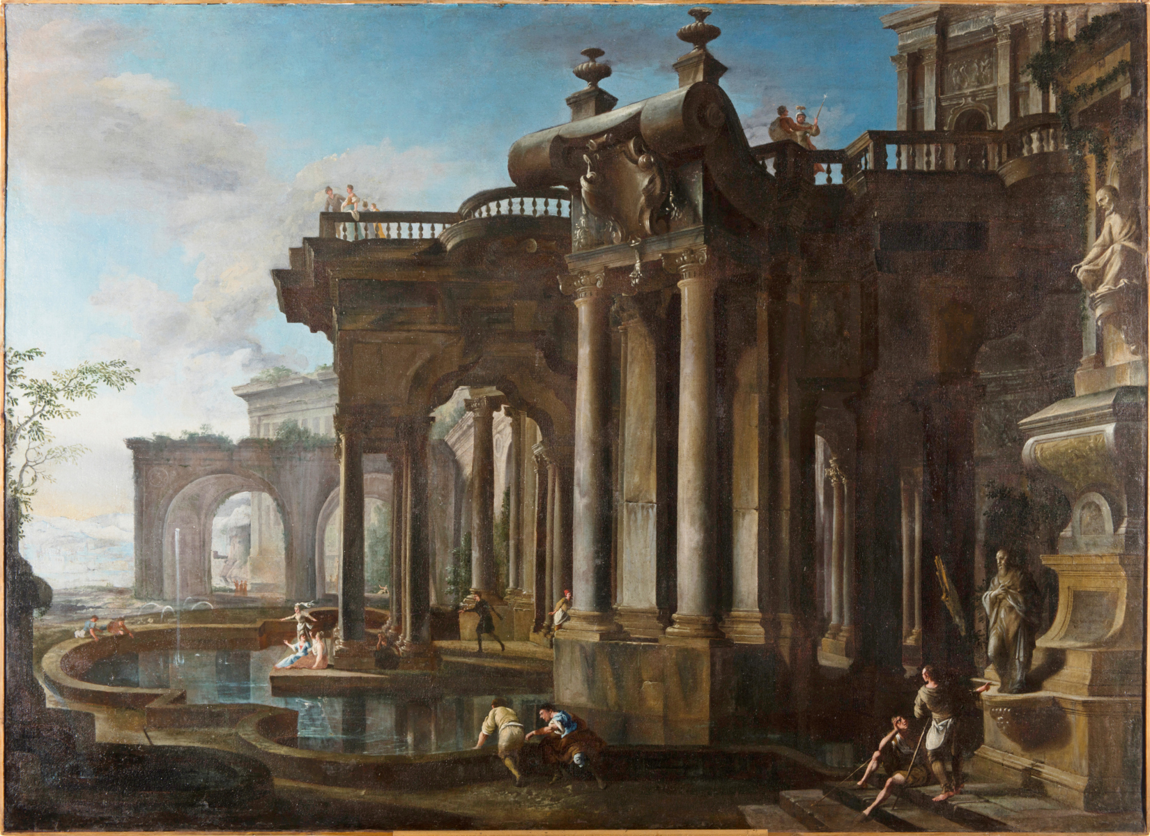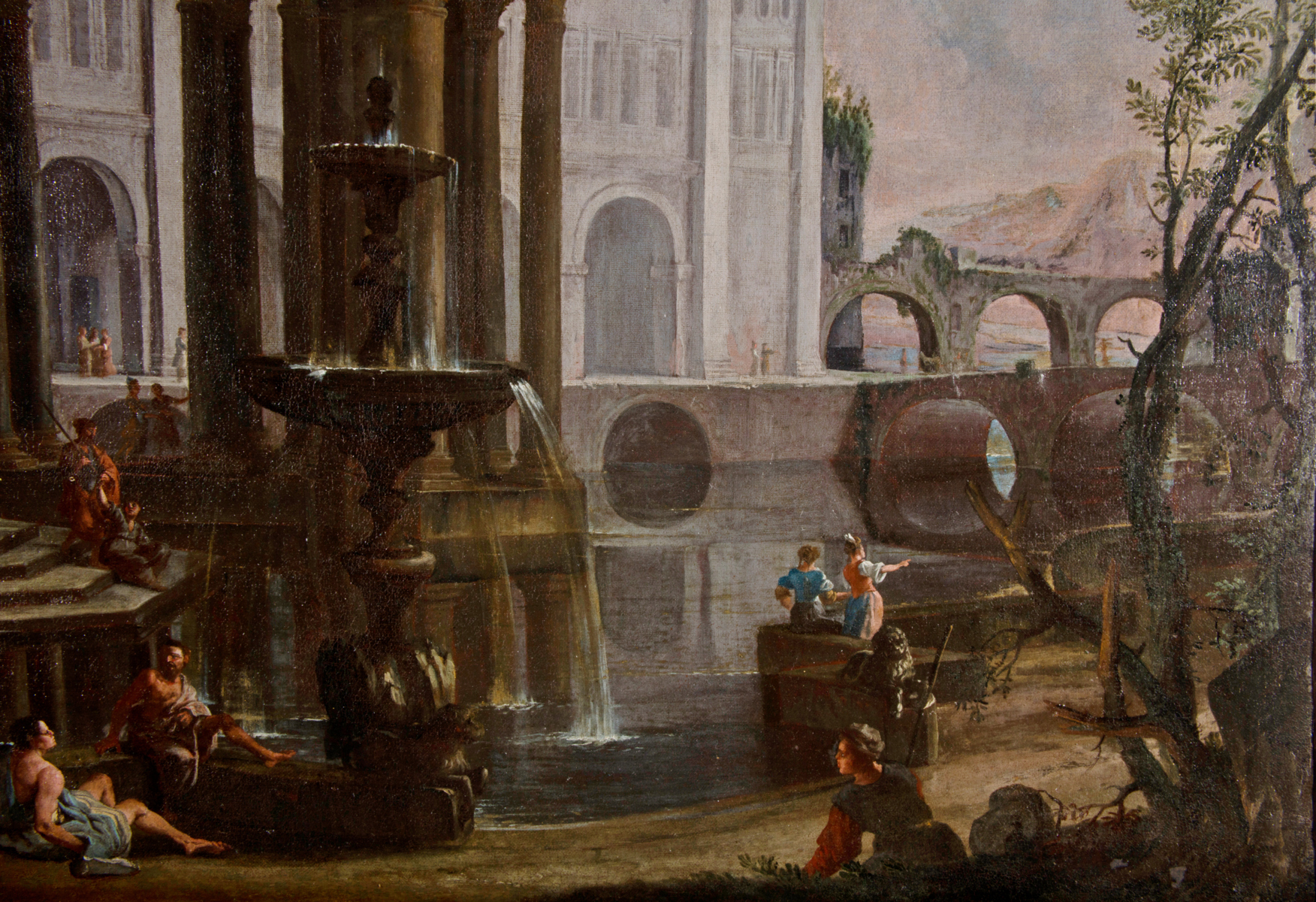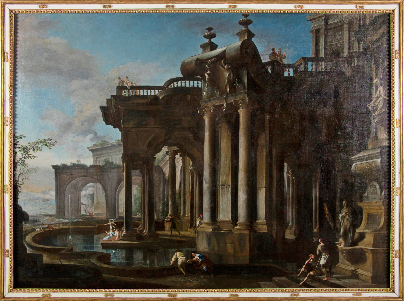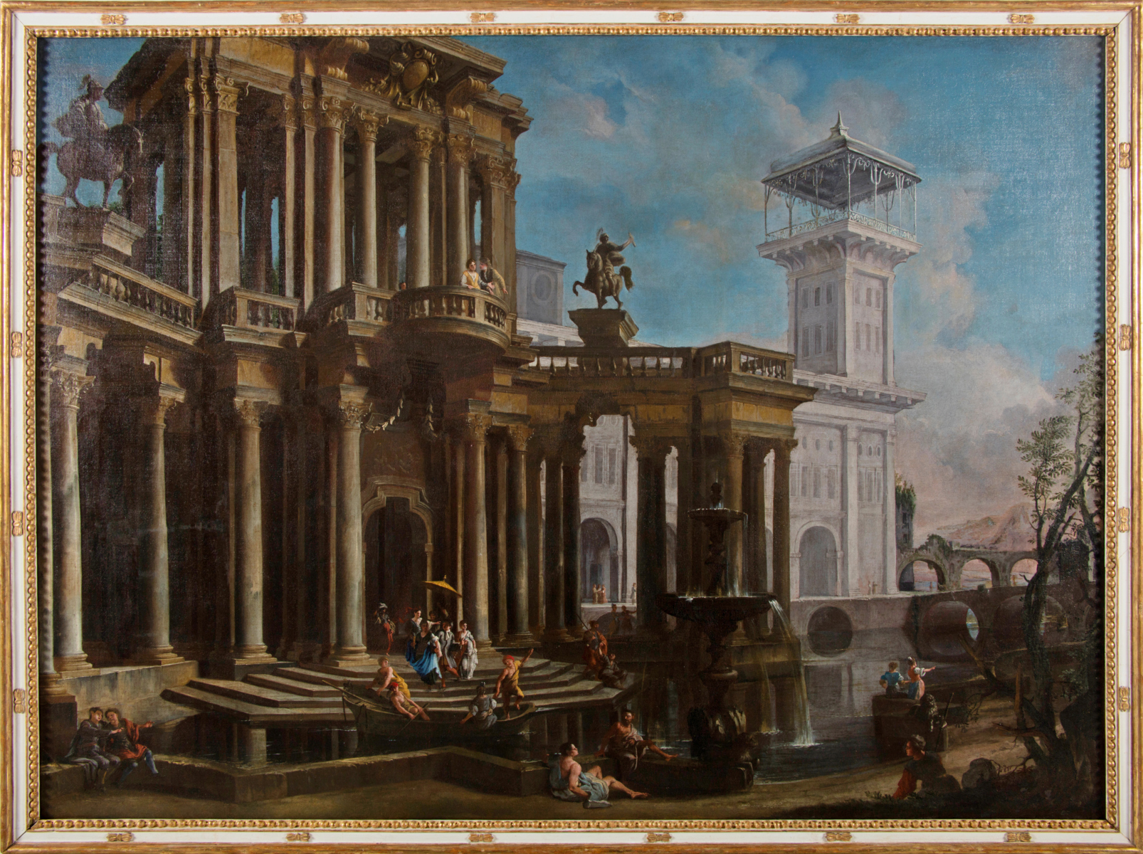 Le due grandi e pregevoli tele raffigurano due capricci architettonici, con scorci di colonnati ed edifici ad arcate, animati da figure. Le composizioni si caratterizzano per l’armonia con cui il pittore introduce i fastosi monumenti architettonici, gli specchi d’acqua, gli edifici in lontananza e gli scorci di paesaggio. Domina una cromia giocata sui toni di marroni e ocra che si staglia sul cielo azzurro, segnato da qualche nuvola di vapore. Anche l’inserimento delle figure per vivacizzare le vedute architettoniche si pone in equilibrio con l’insieme. Il capriccio architettonico, genere artistico che si fa strada nella pittura italiana a partire dal XVII secolo, è caratterizzato dalla raffigurazione di architetture fantastiche o invenzioni di tipo prospettico, talvolta combinate con elementi tratti liberamente dalla realtà. Le due tele sono un esplicativo esempio di questa tipologia e presentano un notevole interesse artistico. La notevole qualità pittorica emerge sia dalla composizione d’insieme che dal modo in cui l’artista descrive le vedute con grande attenzione ai dettagli, alle lumeggiature e al ricercato, perfettamente realistico, chiaroscuro.