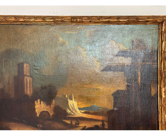Olio su tela soggetto paesaggio con rovine cornice dorata coeva del periodo attribuibile alla cerchia di Leonardo Coccorante