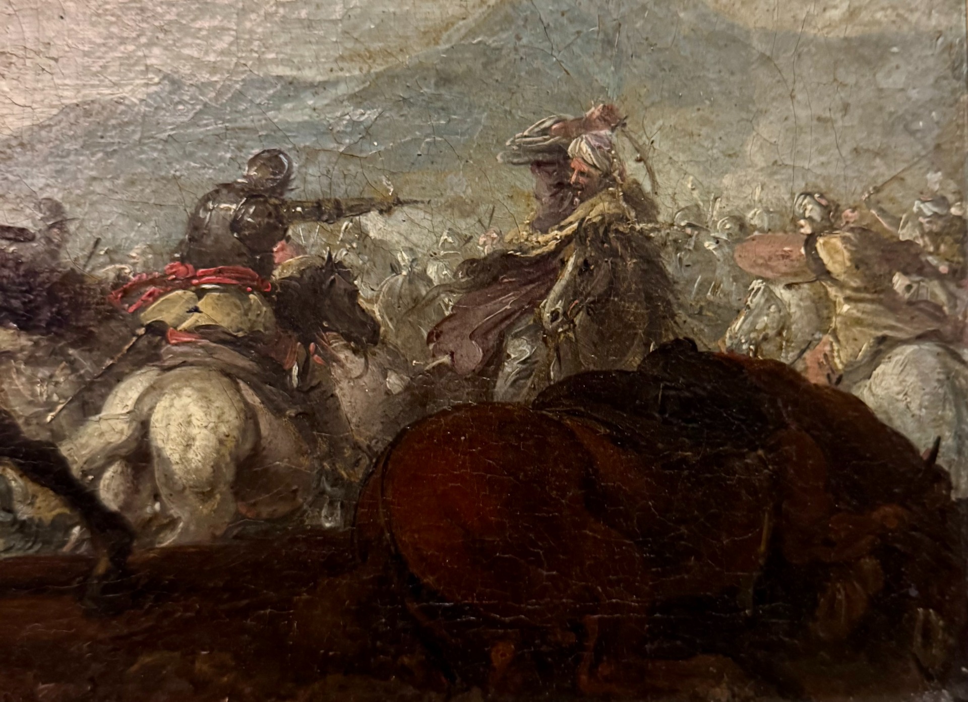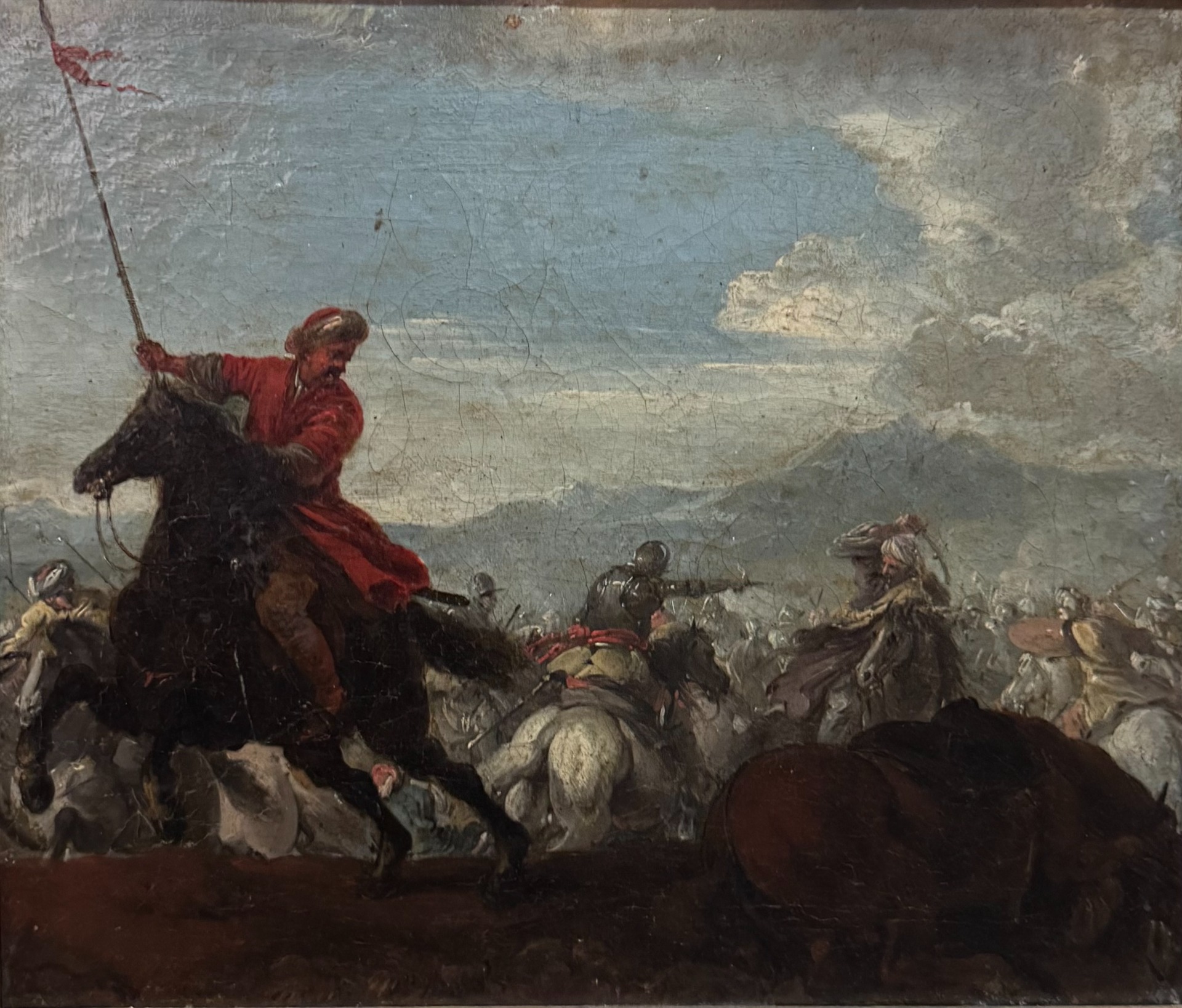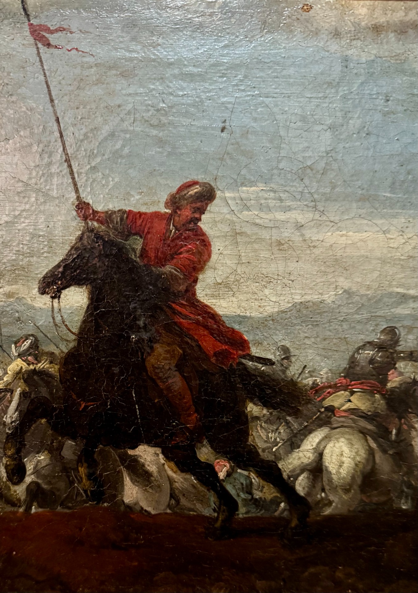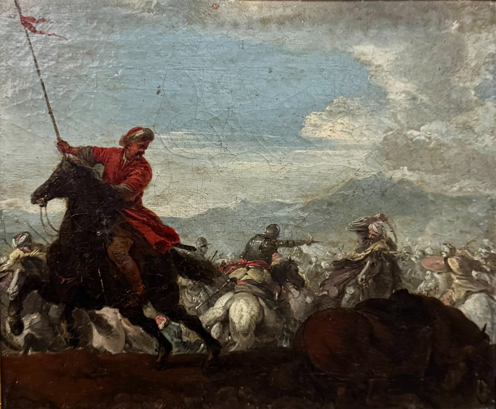 Splendido dipinto ad olio su tela attribuito a Jacques Courtois, detto il Borgognone, maestro del Seicento famoso per le sue scene di battaglia. Al centro della composizione emerge un cavaliere avvolto in un mantello rosso, lanciato al galoppo mentre brandisce una lunga asta. Attorno a lui si sviluppa uno scontro concitato tra cavalieri armati, reso con grande energia e dinamismo.