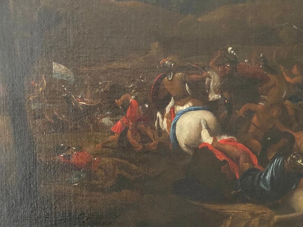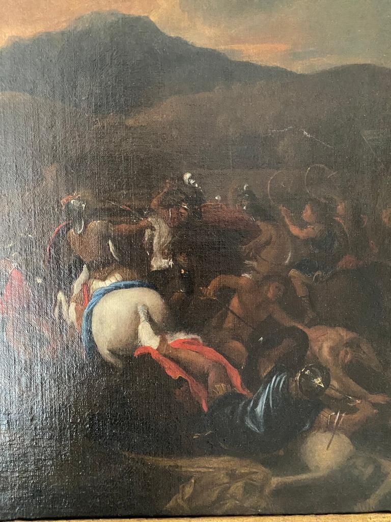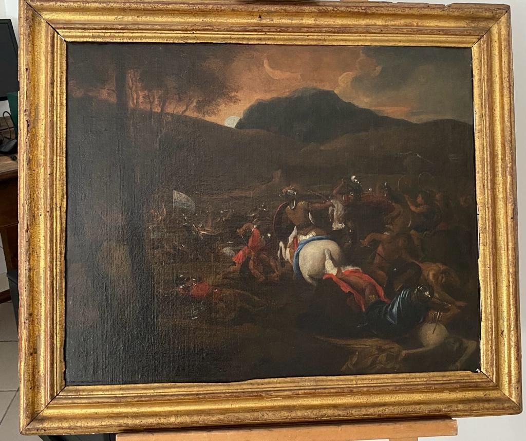 Grande battaglia veneta dei primissimi anni del XVII secolo L opera a mio avviso e' da ricercare nell ambito del pittore Matteo Storm ed ha misure di cm.75x65 totali compresa cornice dorata salvator rosa al rovescio, coeva.