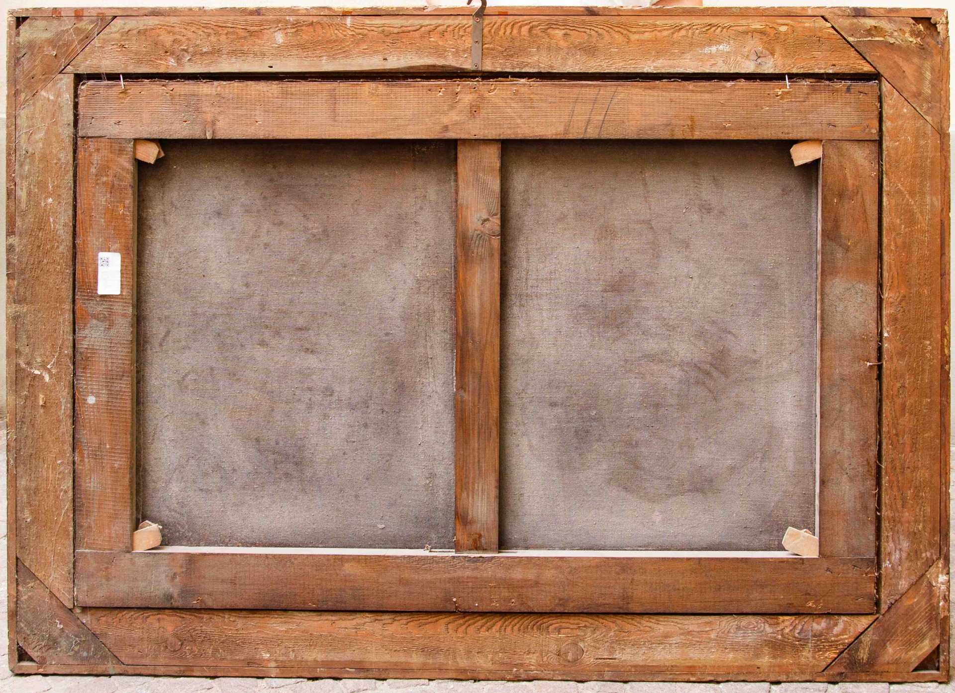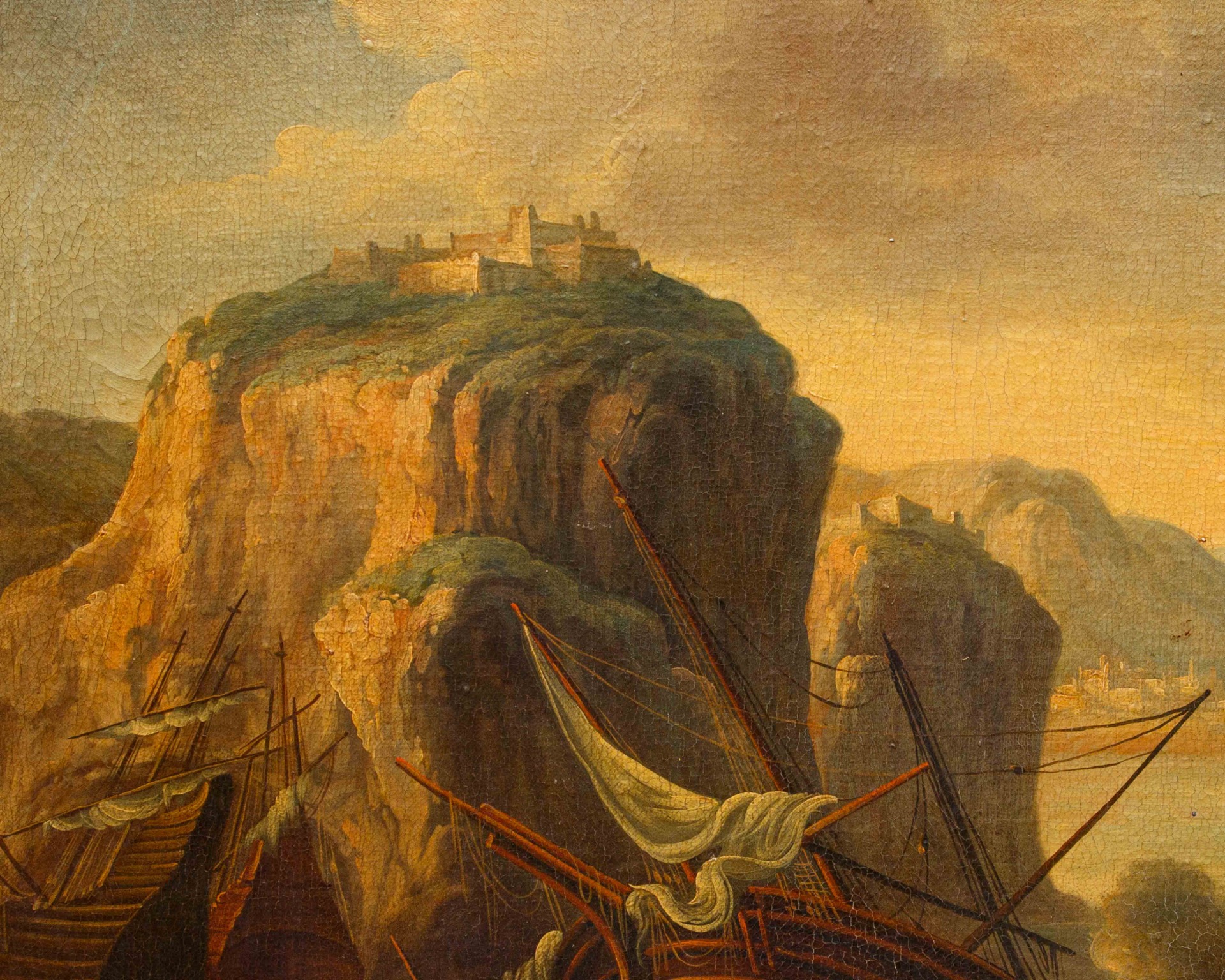 Seguace di Salvator Rosa (Napoli, 1615 – Roma 1673) Veduta con baia Olio su tela, cm 81 x 121 Con cornice, cm 102 x 144 La presente veduta costiera, dal taglio prospettico virtuosamente affettato, evoca gli esempi del paesaggismo italianizzante sviluppatosi a Roma nel corso del Seicento e diffuso in particolar modo da Salvator Rosa (1615-1673). La veduta riprende un dipinto dell’artista napoletano, oggi conservato nelle Gallerie Estensi di Modena: La Veduta di una baia, parte di una serie di tre tele eseguite da Salvator Rosa a Roma tra il 1639 e il 1640 su commissione del duca Francesco I d’Este, poi collocate nel Palazzo Ducale di Sassuolo e quindi trasferite nel 1786 nel Palazzo Ducale di Modena. In un’insenatura chiusa sulla destra da un edificio diroccato sulla cui porta è riconoscibile lo stemma estense e limitata a sinistra da un picco roccioso, alcuni uomini sono indaffarati nella riparazione di vascelli; una suggestiva luce avvolge le figure e il paesaggio, splendido nella veduta della costa lungo la quale sono ormeggiate le imbarcazioni. Allievo in terra natia del Fracanzano e di Aniello Falcone, battaglista, Rosa si trasferì a Roma nel 1635 grazie alla protezione del cardinal Brancacci, dove conobbe i bamboccianti e l’opera di Peter van Laer e Cerquozzi che avevano un atteggiamento innovativo nei confronti della natura in opposizione al pesante ed accademico Barocco romano. Gli anni della realizzazione della Veduta con Baia (1639-1640) vedono un mutamento in senso classicista del suo stile, per influsso di Claude Lorrain, Nicolas Poussin e Pietro Testa, evidente nella concezione del paesaggio, pur mantenendo la sensibilità propria dell’artista per la resa degli aspetti pittoreschi della natura. Ben presto rinnegherà quel linguaggio pittorico della Scuola dei Bamboccianti, per entrare nella bottega del pittore Jusepe de Ribera, detto lo Spagnoletto fedele continuatore del luminismo caravaggesco, creatore di una pittura drammatica e tenebrosa, ricca di vistosi effetti di chiaroscuro. La presente veduta organizza una composizione attentamente studiata grazie al controllo della luce e degli effetti di sfumato nella foschia del cielo, alla descrizione del porto con la perfetta rappresentazione dei vascelli e all’incombenza della natura, con i grandi alberi a destra. Di particolare qualità è il taglio con cui è concepita l'immagine e le tonalità cromatiche con cui sono tratteggiate le linee di costa e le imbarcazioni, minuziosamente descritte. La costruzione scenica è ben concepita dal punto di vista prospettico e ponderate sono le figure in primo piano che si misurano nel paesaggio con notevole armonia. Le opere di Rosa rendono magistralmente la tensione tra il creato e l'elemento umano, del quale viene evidenziata la piccolezza materiale e l'impotenza nei confronti della natura, elementi che emergono anche nella tela analizzata, dove la figura umana diventa minuta di fronte alla maestosità del suggestivo paesaggio.