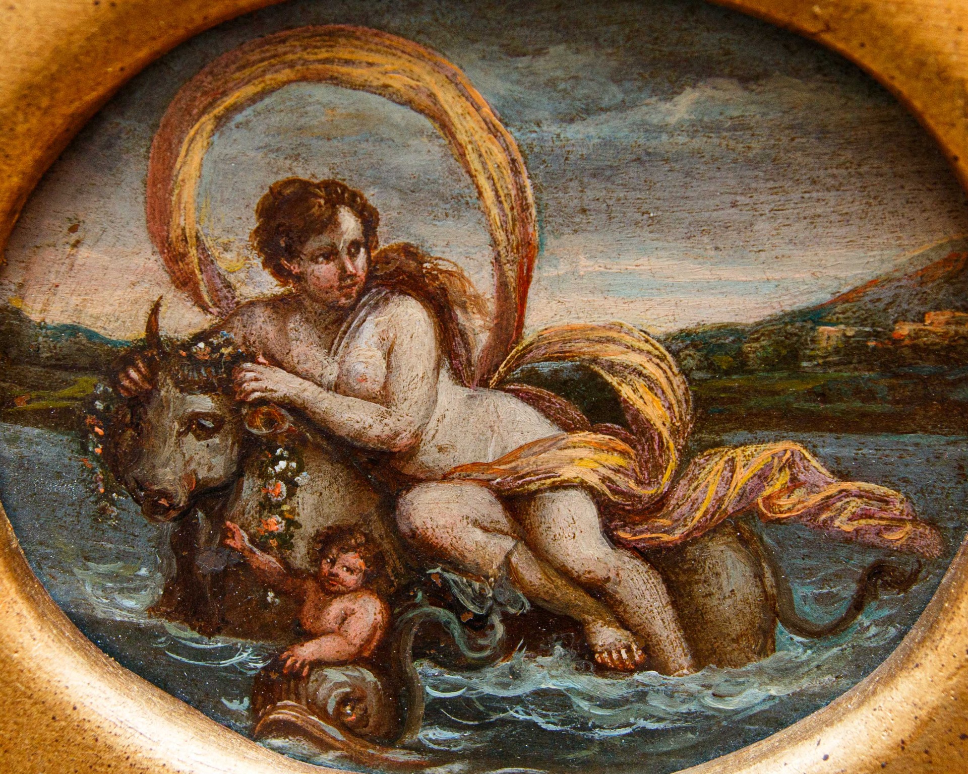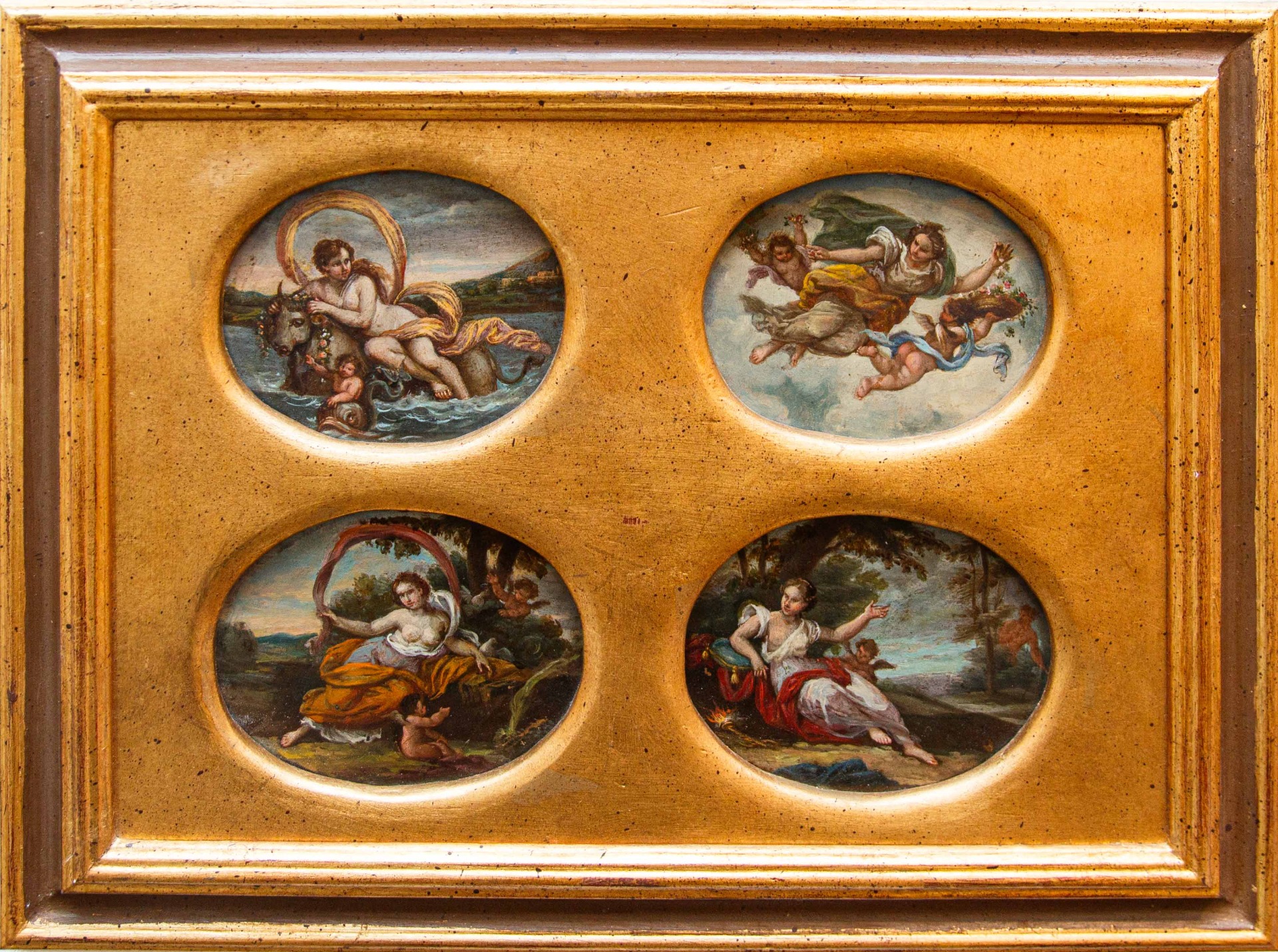 Scuola francese, XVII secolo Allegorie dei quattro elementi (4) Olio su rame ovale, cm 10,5 x 13 Con cornice, cm 36 x 46 I quattro ovali incorniciati in esame costituiscono un raffinato esempio di pittura su rame, supporto prediletto da artisti che ricercavano brillantezza particolare ed...