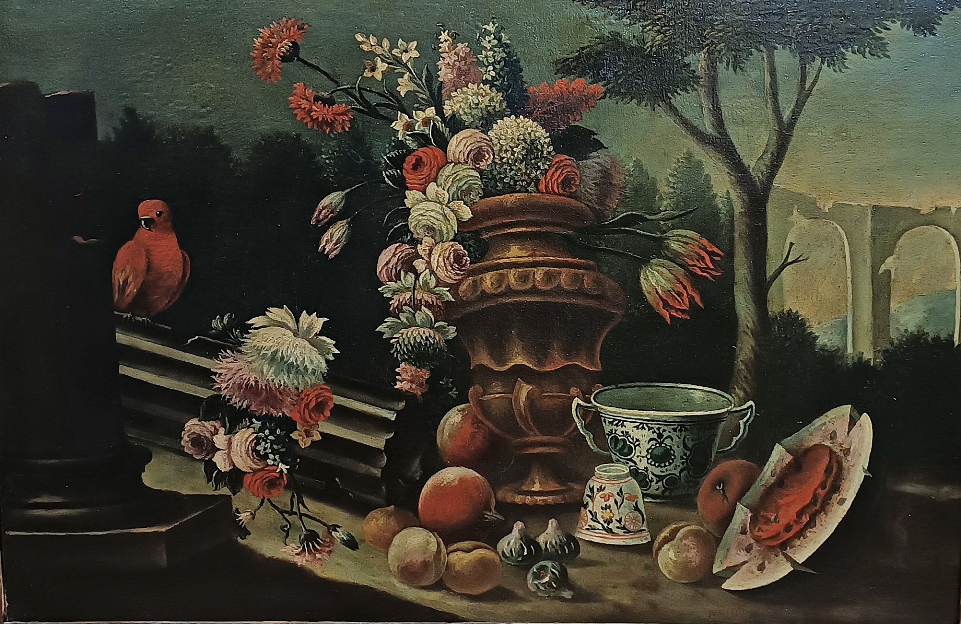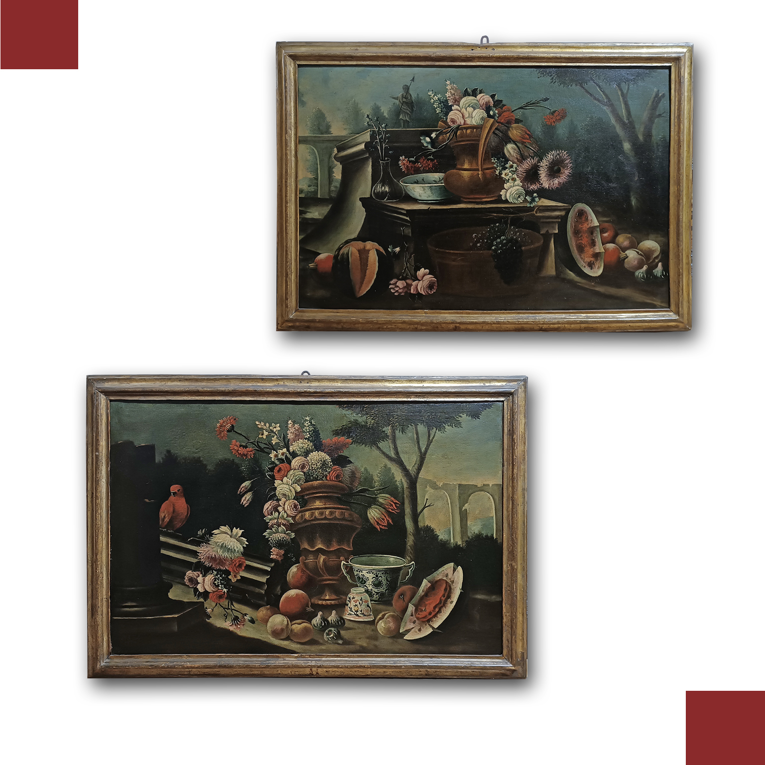 Raffinata coppia di dipinti ad olio su tela, inseriti in cornici di legno intagliato e dorato coeve. Nei dipinti sono rappresentate due nature morte, ambientate su uno sfondo paesaggistico con architetture e rovine; in primo piano si distinguono fiori, frutti, vasi di vario genere, suppellettili e animali. Si tratta di una coppia di dipinti apprezzabile per la qualità stilistica e la resa realistica, in grado di arredare con eleganza qualsiasi ambiente. Si segnalano piccoli restauri e una successiva rintelatura. Manifattura marchigiana (centro-Italia), della fine del XVII secolo.