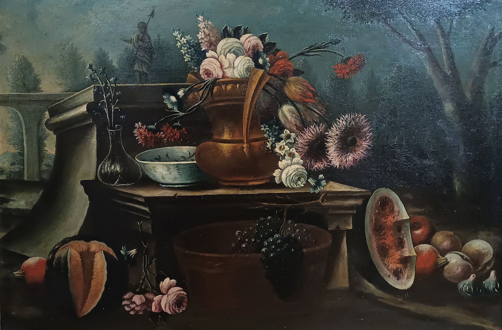 Raffinata coppia di dipinti ad olio su tela, inseriti in cornici di legno intagliato e dorato coeve. Nei dipinti sono rappresentate due nature morte, ambientate su uno sfondo paesaggistico con architetture e rovine; in primo piano si distinguono fiori, frutti, vasi di vario genere, suppellettili e animali. Si tratta di una coppia di dipinti apprezzabile per la qualità stilistica e la resa realistica, in grado di arredare con eleganza qualsiasi ambiente. Si segnalano piccoli restauri e una successiva rintelatura. Manifattura marchigiana (centro-Italia), della fine del XVII secolo.