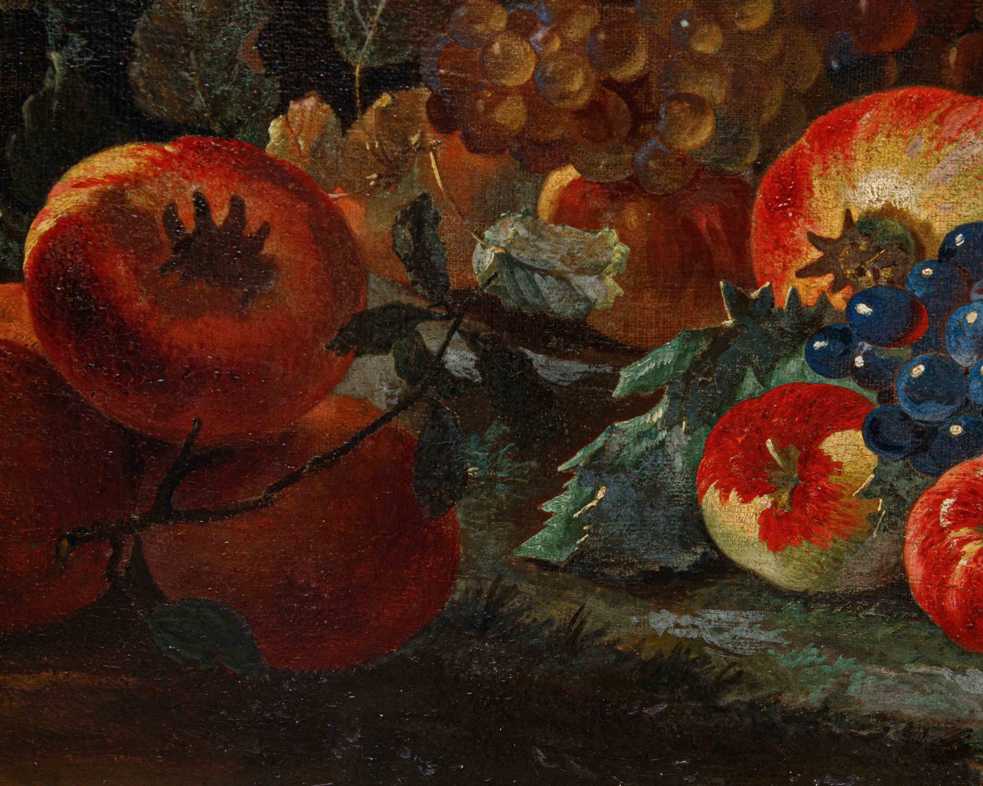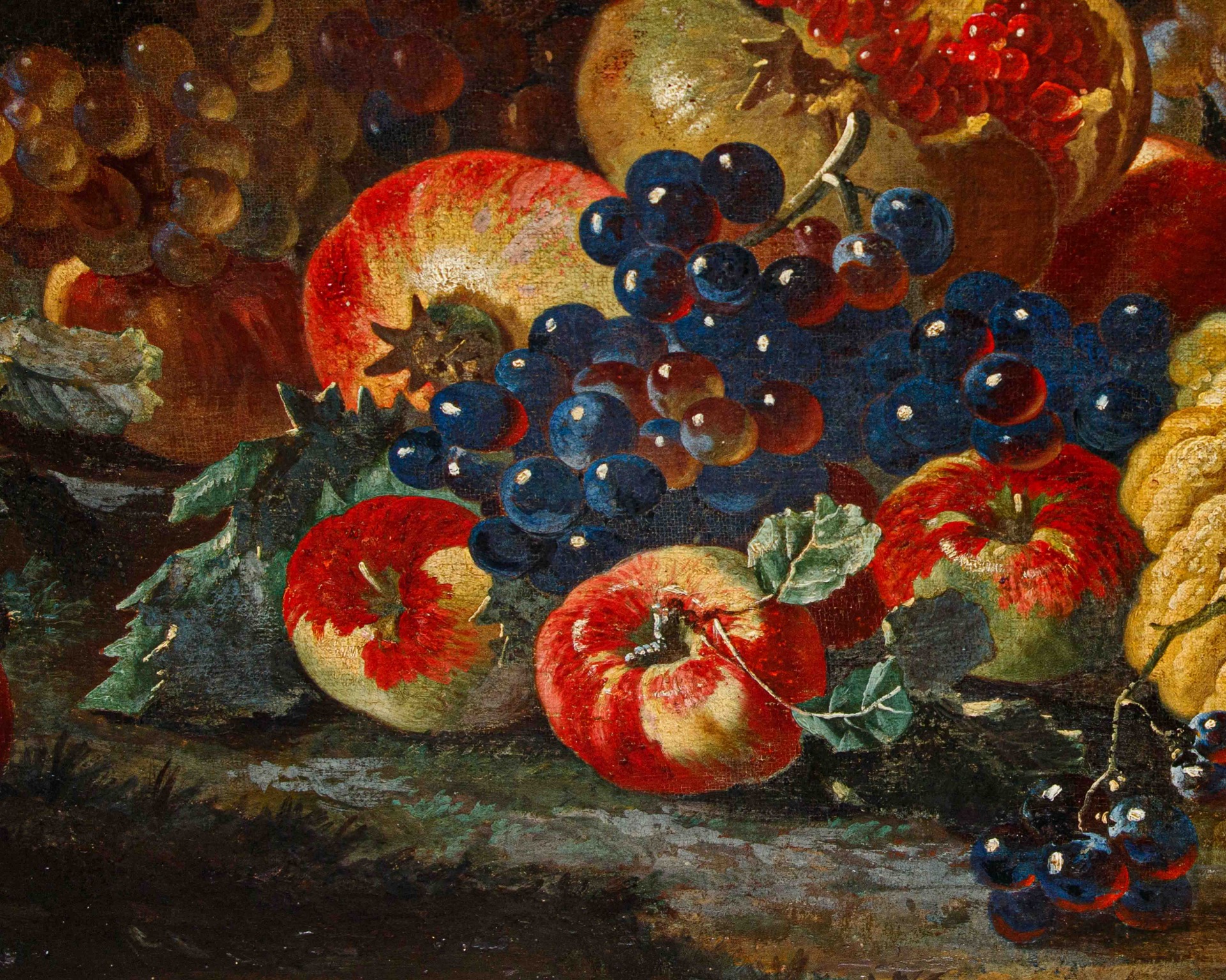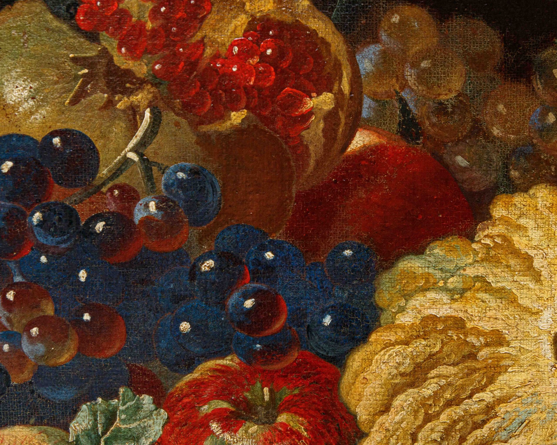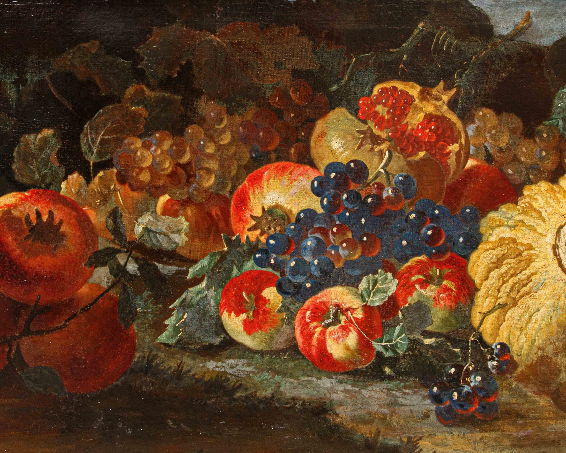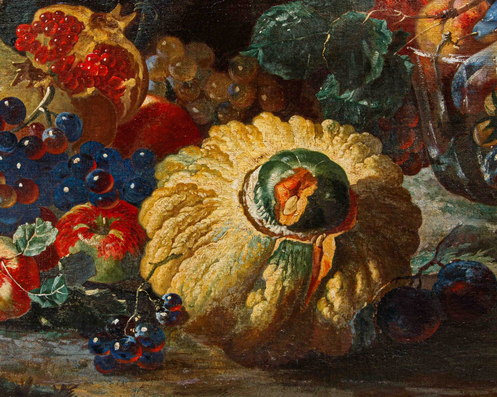 ll centro della scena, un cesto di vetro traboccante di frutta, tra cui spiccano pesche e fichi succulenti. Attorno ad esso, si distribuisce una profusione di frutti diversificati: grappoli d'uva, sia scura e vellutata che chiara e trasparente, si intrecciano con il rosso vivido delle melograne spaccate, le mele dalla buccia cerosa e le cotogne dalla superficie ruvida. Una gigantesca zucca giallo-crema, posta in primo piano, cattura lo sguardo con la sua texture complessa, fungendo da fulcro visivo della composizione.