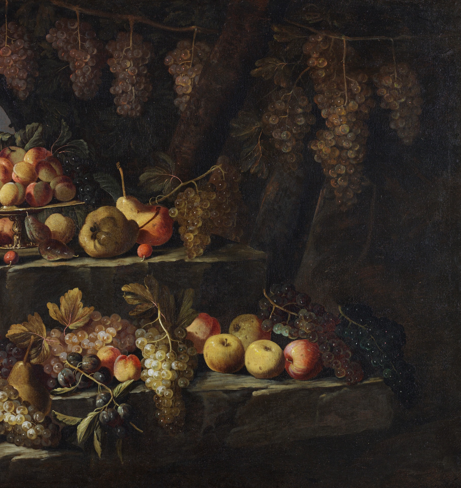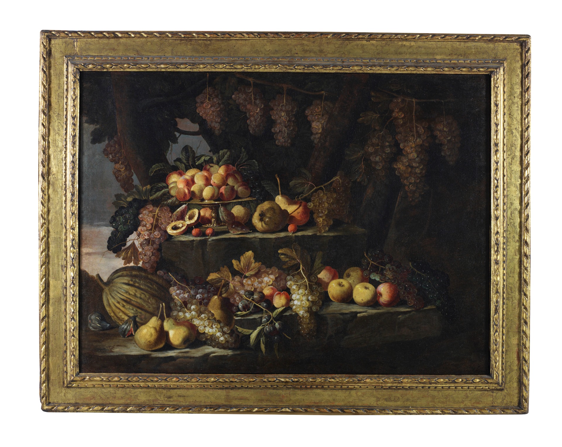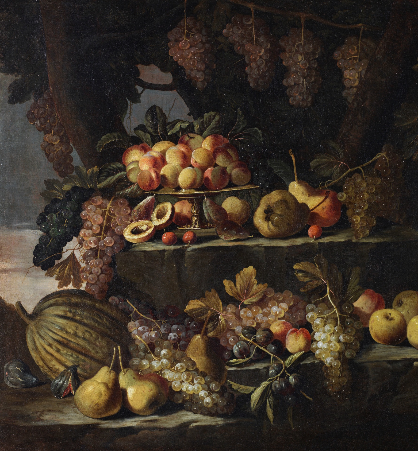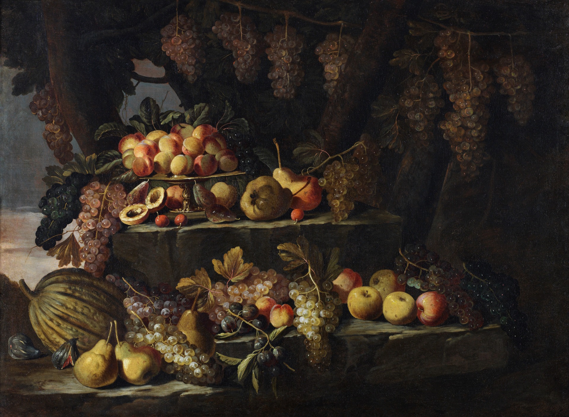 Outdoors, under a cascade of bunches of grapes and resting on three rock crags, a rich still life is represented.