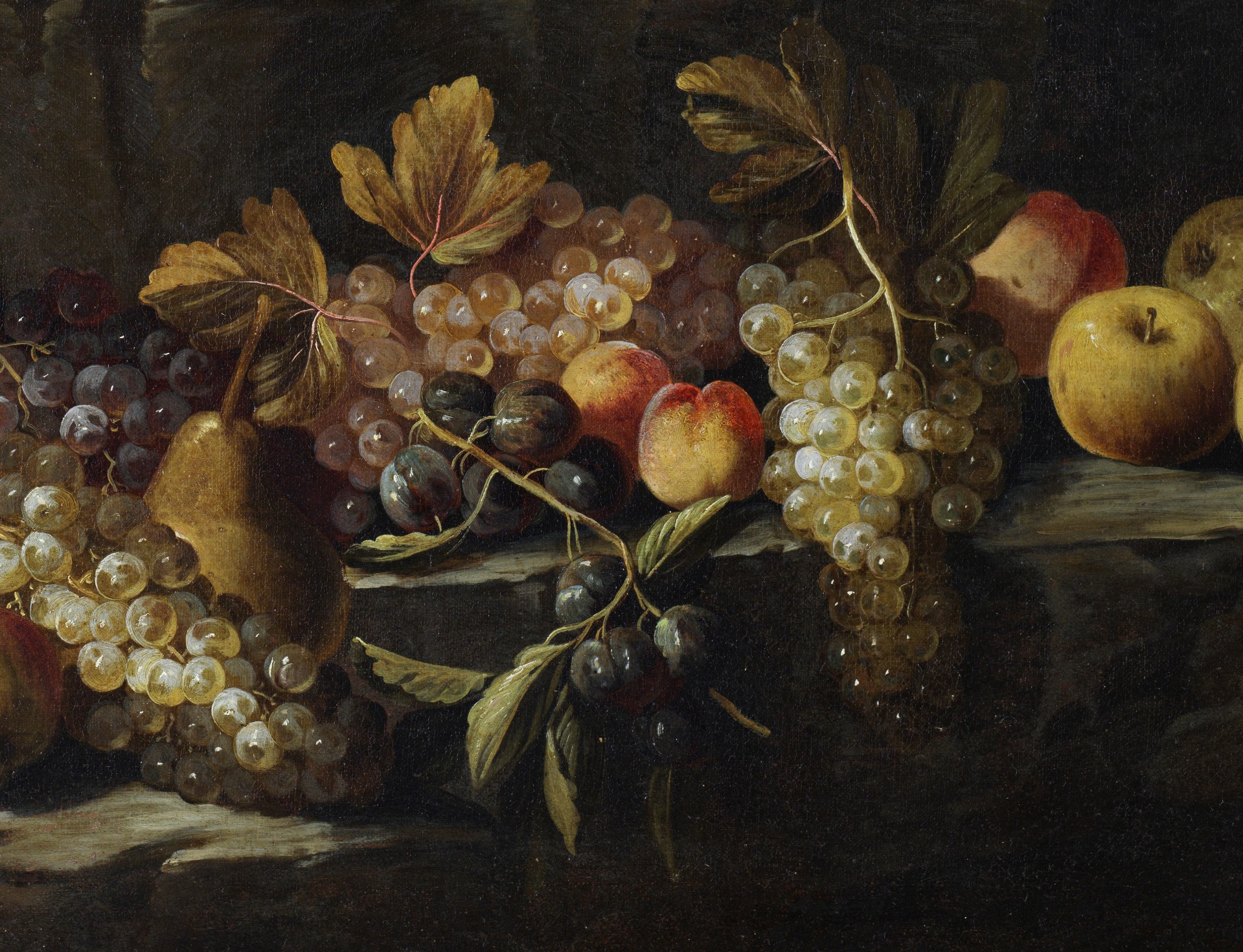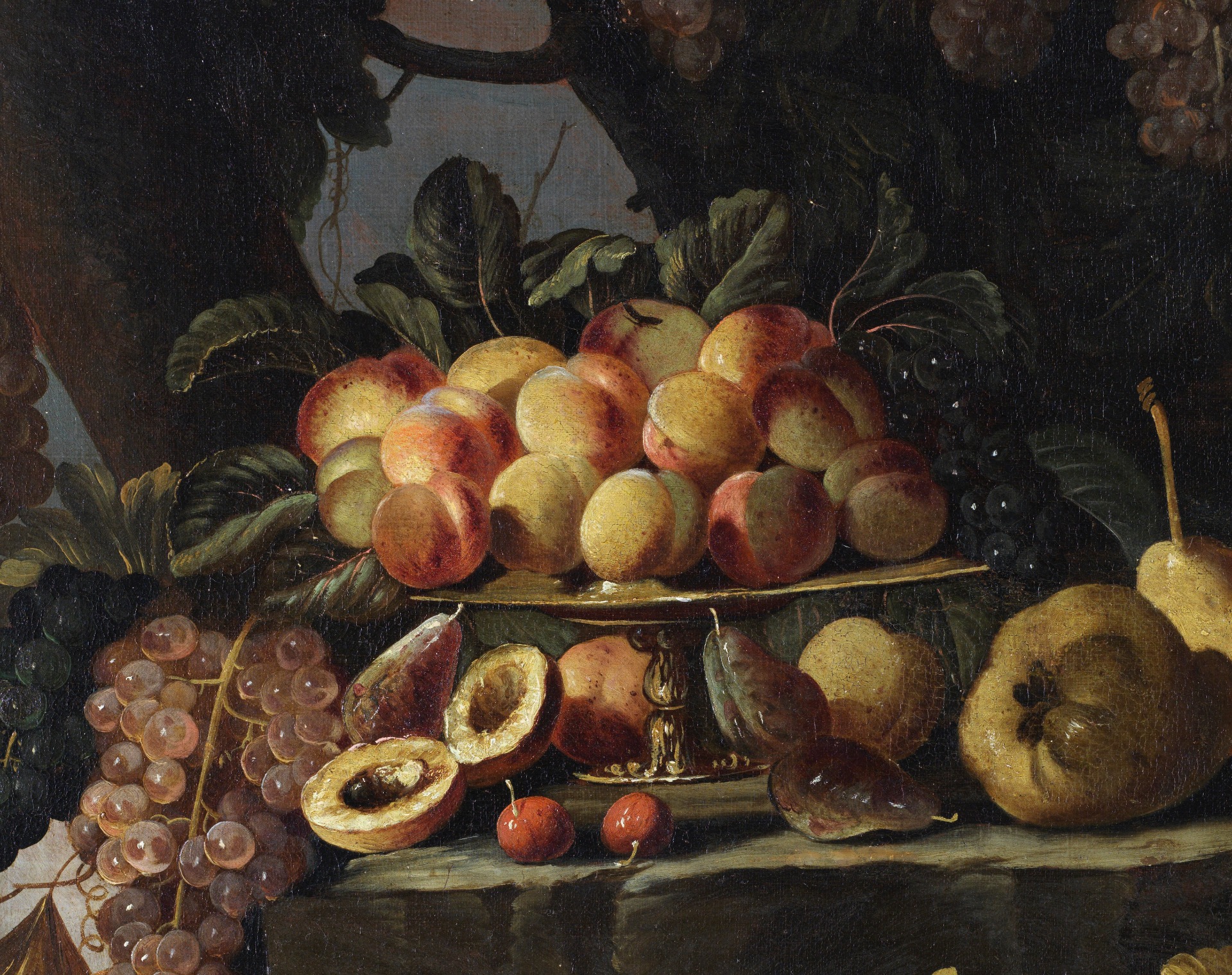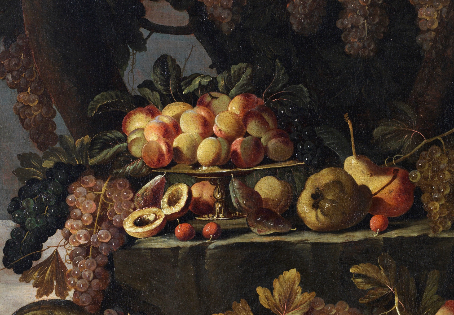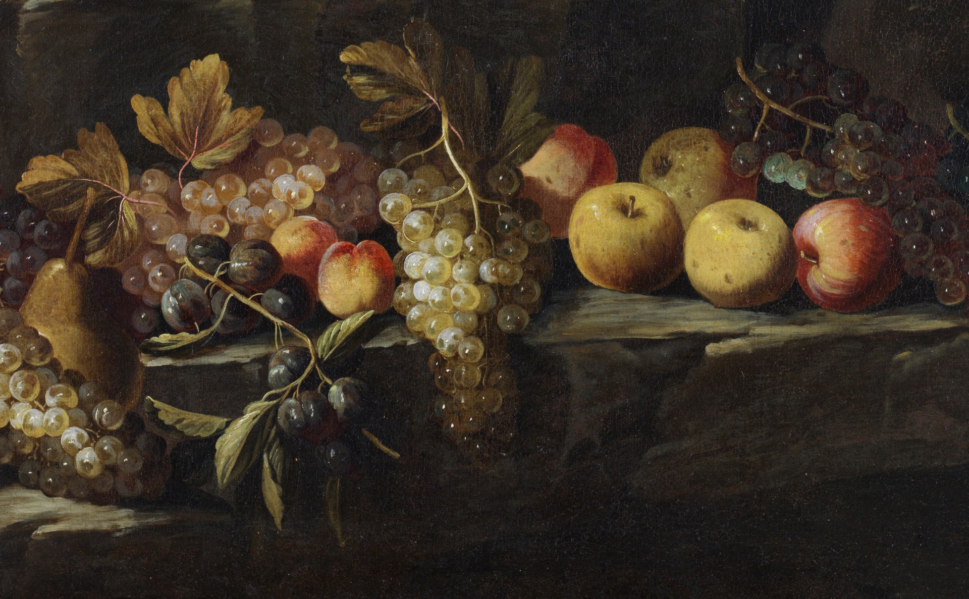 Outdoors, under a cascade of bunches of grapes and resting on three rock crags, a rich still life is represented.