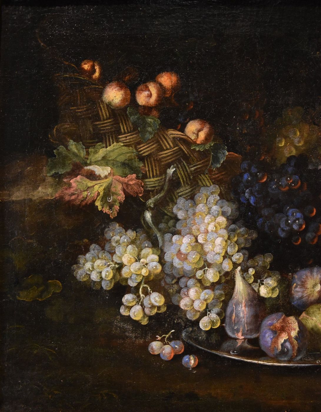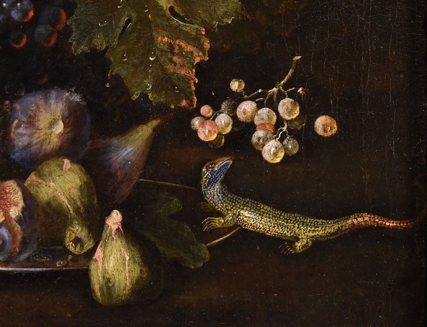 Questa magnifica natura morta (di cui è disponibile anche il relativo pendant - link -), raffigura una composizione di frutti, disposti su un piano con sfondo scuro, tra cui alcuni succosi grappoli d’uva di diverse qualità, appena colte dalle viti sulle cui foglie ci sono ancora delle gocce di rugiada, delle albicocche riposte in un cestino di vimini intrecciato e dei fichi maturi riposti su piatto d'argento che ne riflette le forme. Sulla destra è ritratta una curiosa lucertola, che si volta per controllare di non essere vista.