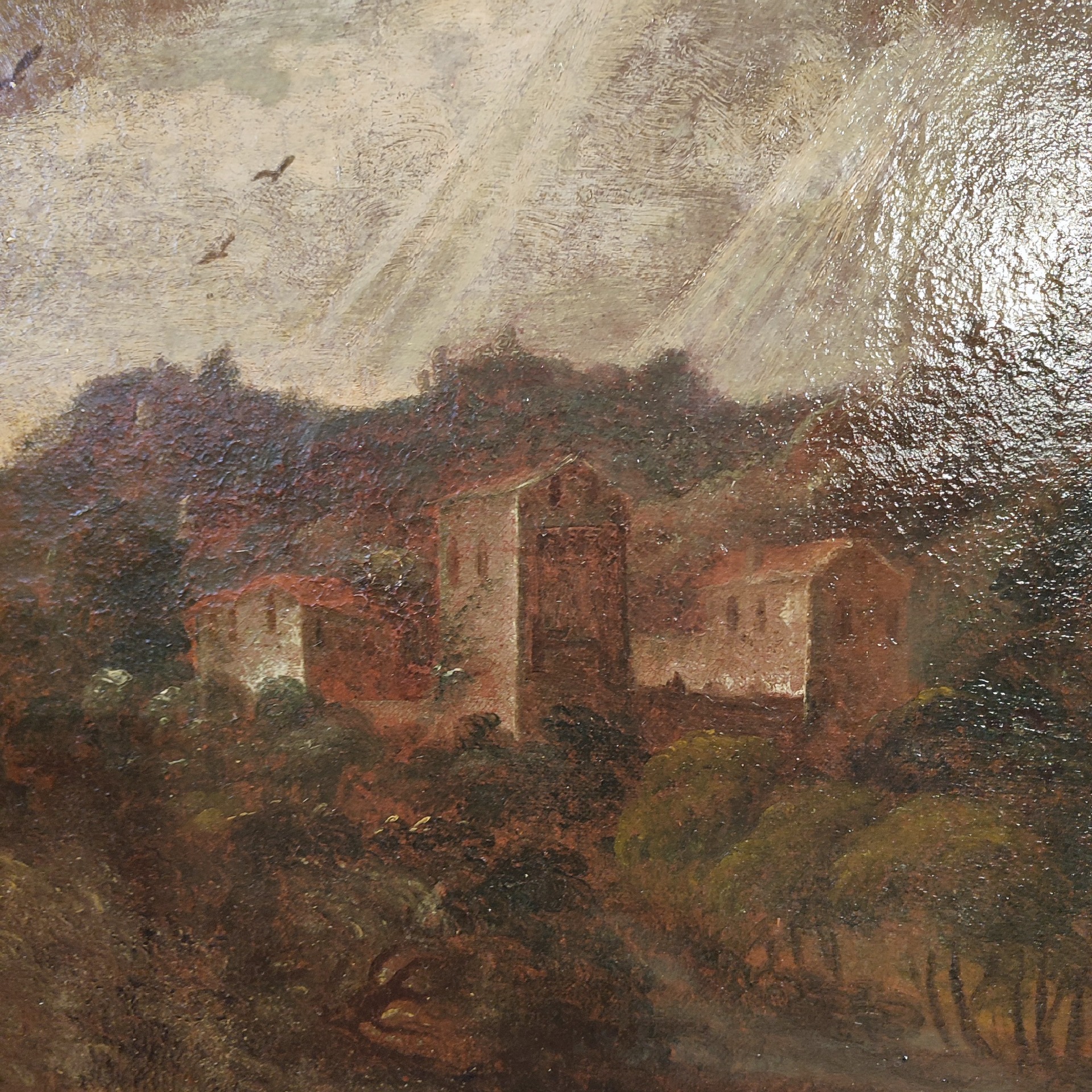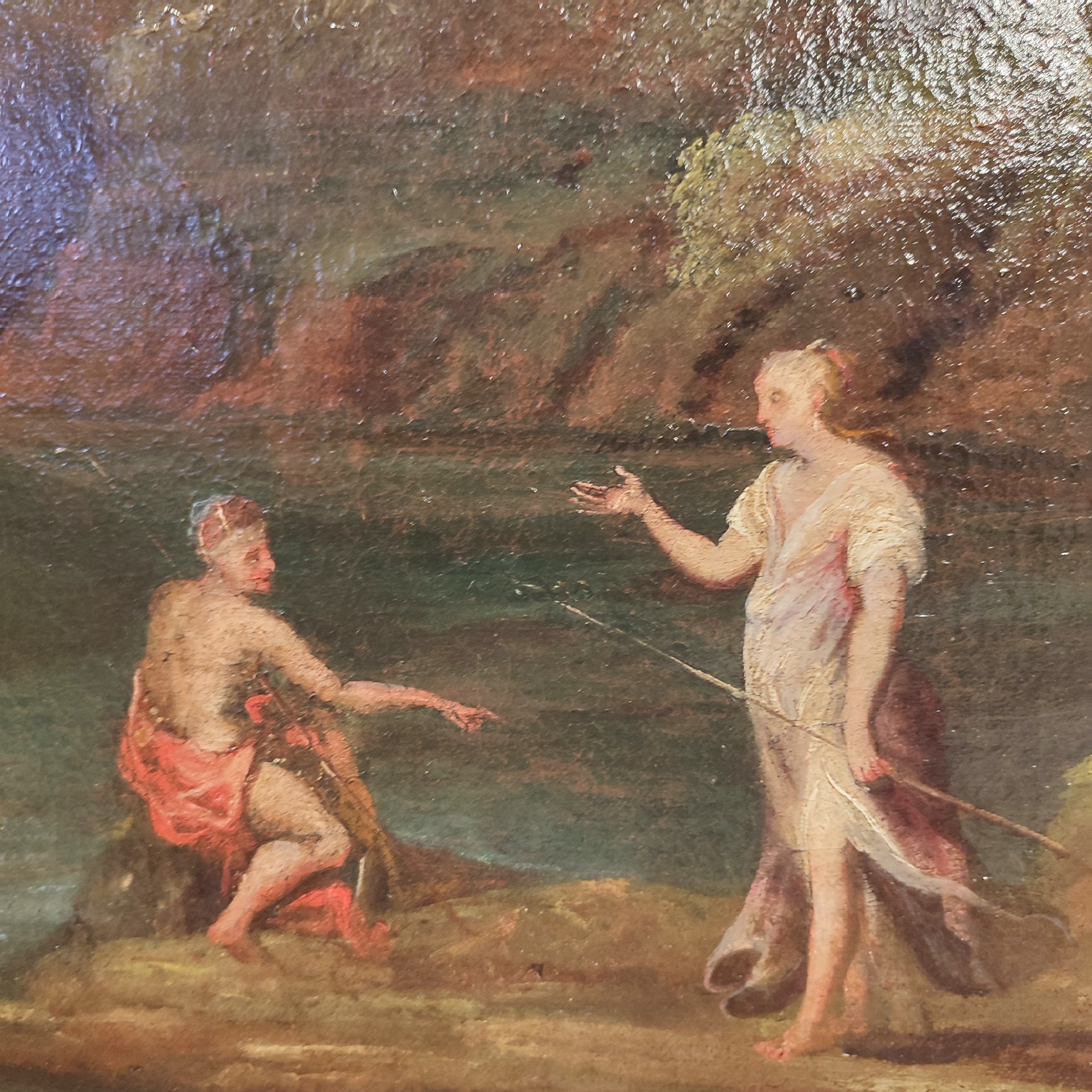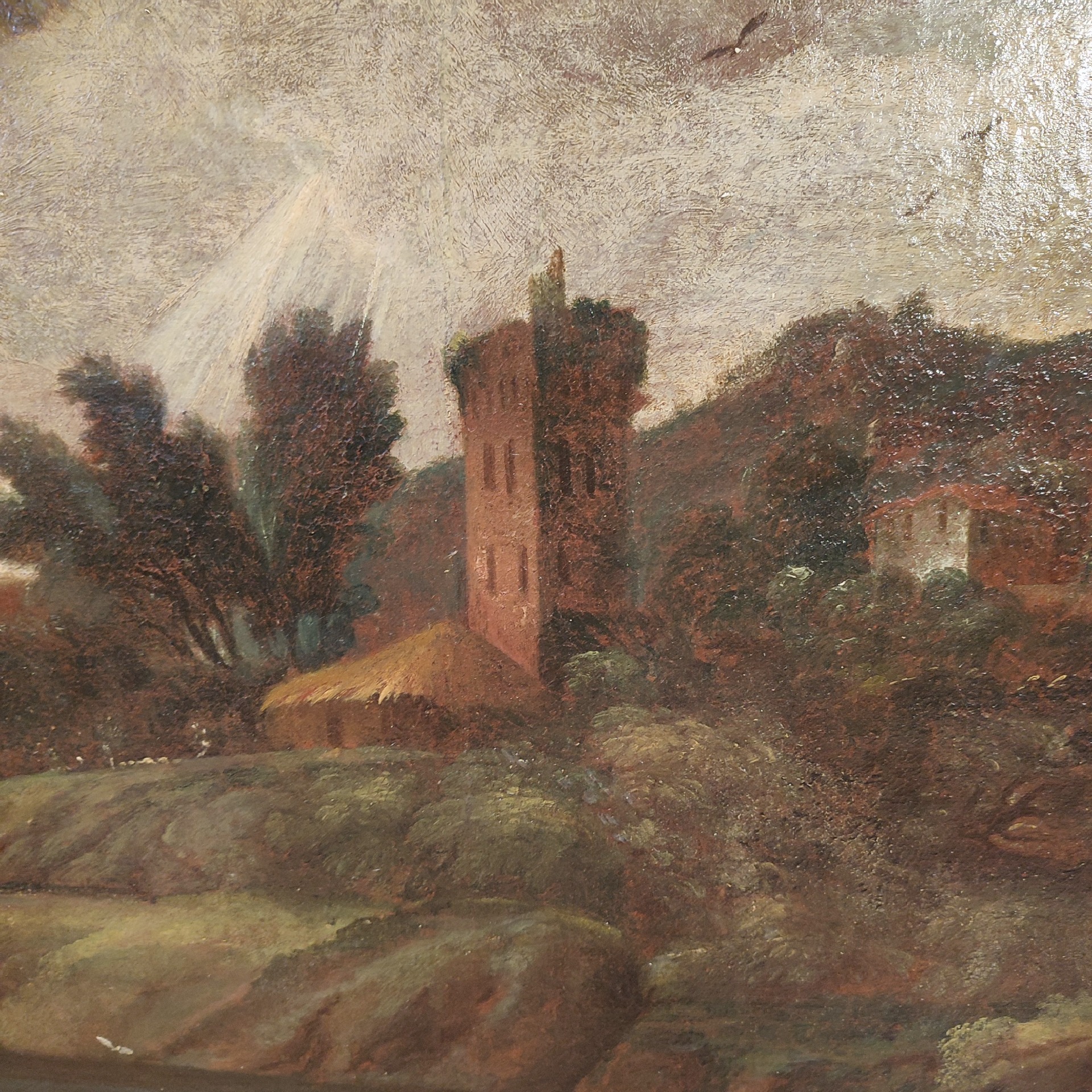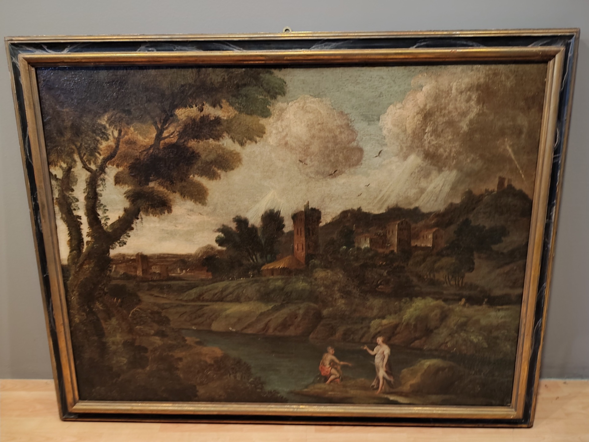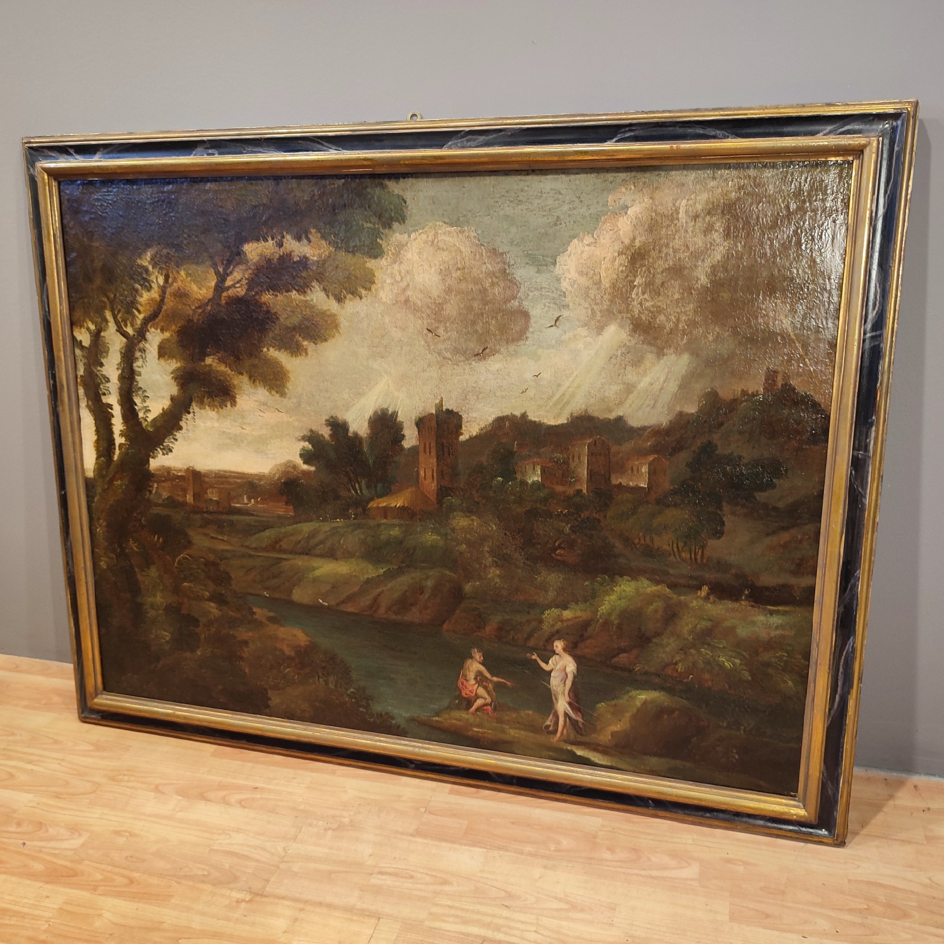 Paesaggio con figure veneto epoca 600. Prima tela ,cornice non coeva.Miss: 131x168 Siamo a vostra disposizione per foto o domande.