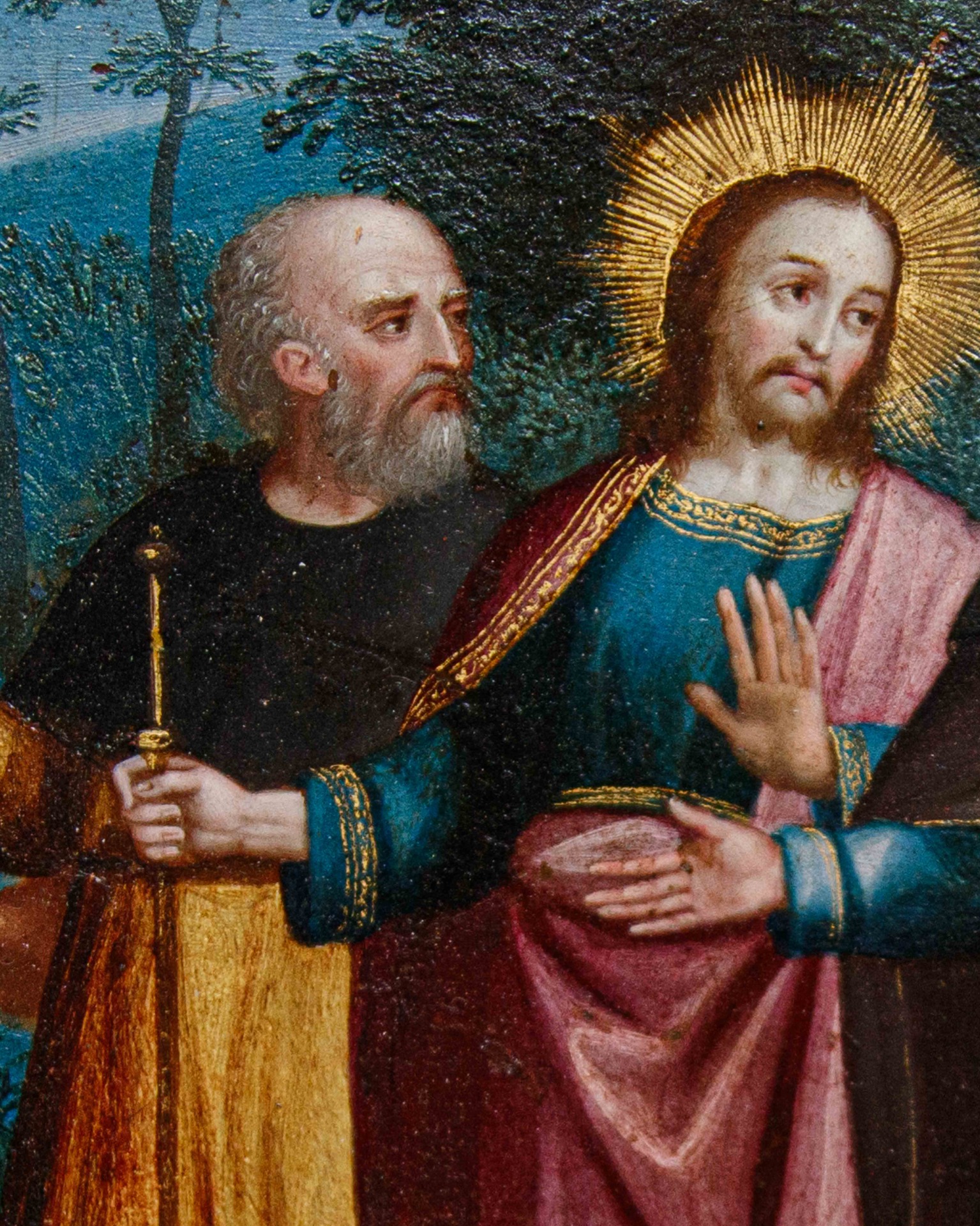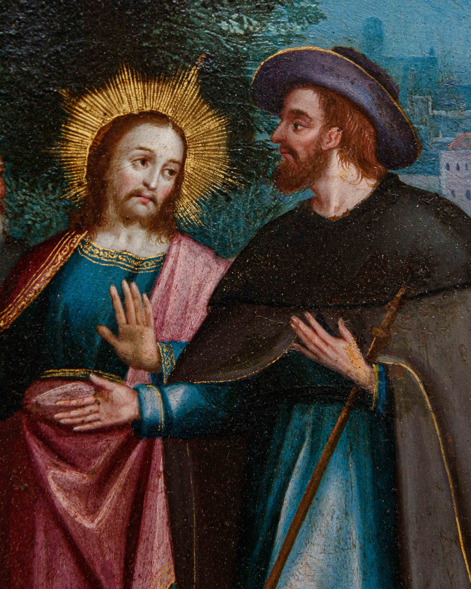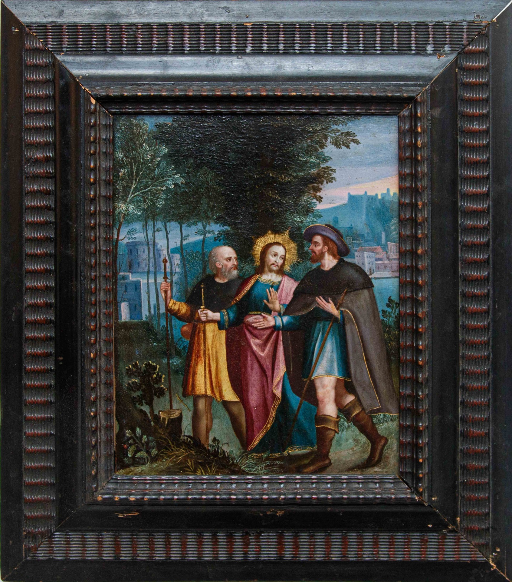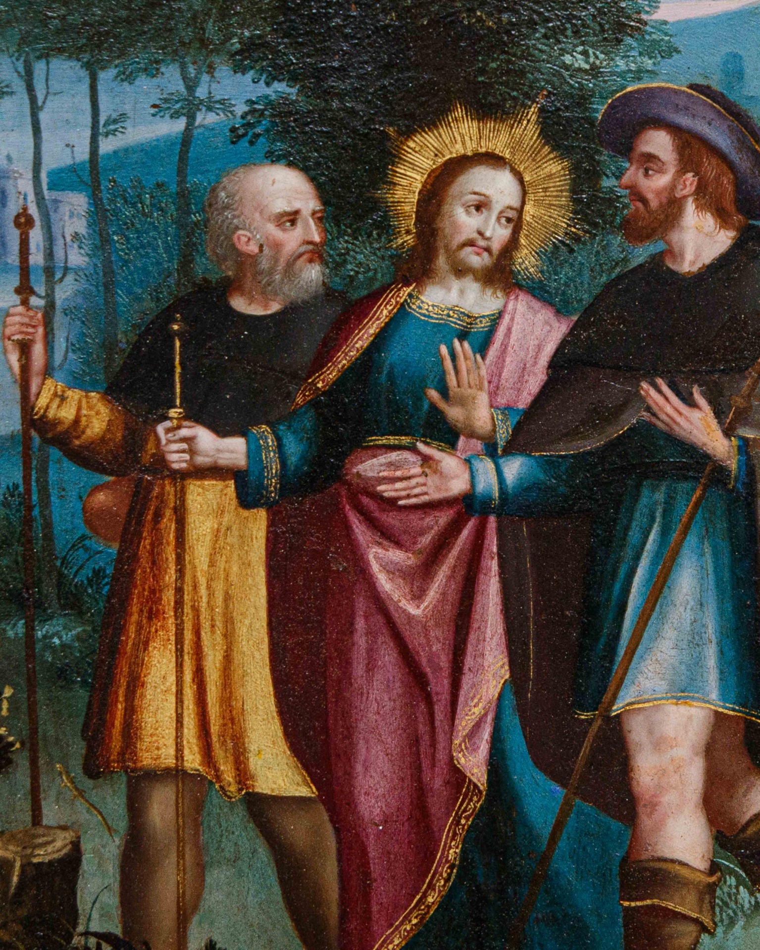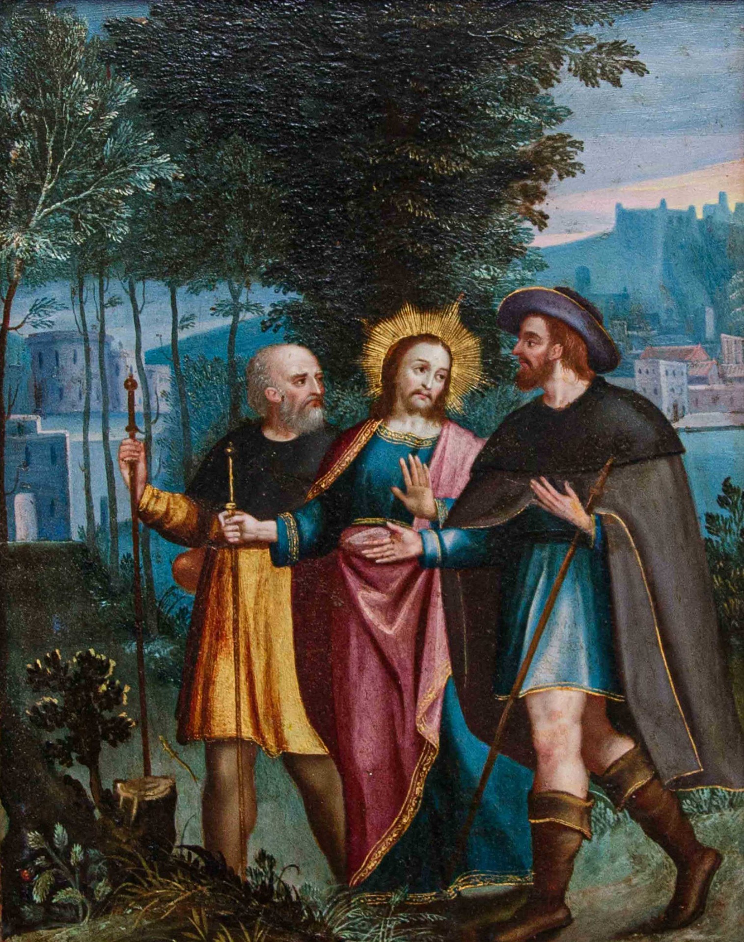 L’episodio biblico che è raffigurato su questo rame è l’apparizione di Gesù sulla via di Emmaus, avvenuta tre giorni dopo la sua morte. Lungo la strada due Suoi discepoli stavano camminando lungo per raggiungere il villaggio di Emmaus, a circa dodici chilometri da Gerusalemme. Assorti nei loro pensieri vennero raggiunti da uno sconosciuto che iniziò a discorrere con loro circa i recenti avvenimenti accaduti a Gesù il Nazareno, accennando anche alla sua presunta resurrezione. L’episodio successivo è quello della cena in Emmaus, momento in cui i due discepoli riconoscono il loro maestro mentre benedice il pane per poi scomparire improvvisamente dalla loro vista. Nel Vangelo di Luca (24, 14-35) viene raccontato questo viaggio intrapreso la sera della Resurrezione di Cristo da Cleopa e un altro dei suoi discepoli, il cui nome non viene specificato e che i teologi non sono riusciti ad identificare con assoluta certezza nei secoli successivi; nonostante ciò l’episodio ha goduto di enorme fortuna, soprattutto per valore catechetico del riconoscimento di Cristo e dell’azione divina nel quotidiano ma anche per la stretta connessione con l’episodio della cena: infatti sin dal Rinascimento entrambe le scene sono state ampiamente rappresentate tramite ambientazioni, abiti e composizioni diverse e variegate. In questo caso la tecnica della pittura su rame rende il corpus pittorico più luminoso e fluido, esaltando gli effetti chiaroscurali dei panneggi e dando maggior vivacità ai colori dello sfondo e agli elementi della vegetazione circostante. La lenticolare trattazione dei ricami dorati, dell’aureola di Cristo, del fogliame e delle architetture di fondo si bilancia perfettamente con un’impaginazione ordinata e strutturata attorno ai tre personaggi, disposti progressivamente lungo una linea diagonale che permette di osservarli nella loro singolarità come pure nell’insieme dialogante e coeso del gruppo in cammino. L’incremento della produzione del supporto metallico fra Cinque e Seicento è dovuto a diversi fattori: dal miglioramento delle tecniche di estrazione in cava all’invenzione del laminatoio (primi esempi di presse a rullo, alimentate da mulini ad acqua, compaiono nel Codice Atlantico di Leonardo) che, con la battitura meccanica, permise di ottenere, velocemente e senza fusione, lamine regolari. La lamina di rame si dimostrava ideale per la pittura ad olio poiché costituiva un supporto non assorbente, rigido, liscio e caratterizzato dalla stessa colorazione rossastra che si usava per le preparazioni dei fondi; queste caratteristiche furono apprezzate dagli artisti di tutto il continente europeo e in particolar modo da quelli fiamminghi, sia per le qualità del supporto sia per la disponibilità di questo materiale nelle Fiandre: i maggiori centri di produzione furono infatti Anversa, Amburgo e Amsterdam, tutti città legate al monopolio che di questo metallo era detenuto dalla famiglia Fugger. Questo stesso rame può essere ricondotto alla produzione fiamminga dato il descrittivismo della scena nei suoi più minuti particolari, come ad esempio i giochi di luce sul fogliame, ai toni freddi resi con una luce unificante e una spazialità più aperta nonostante le ridotte dimensioni del supporto.