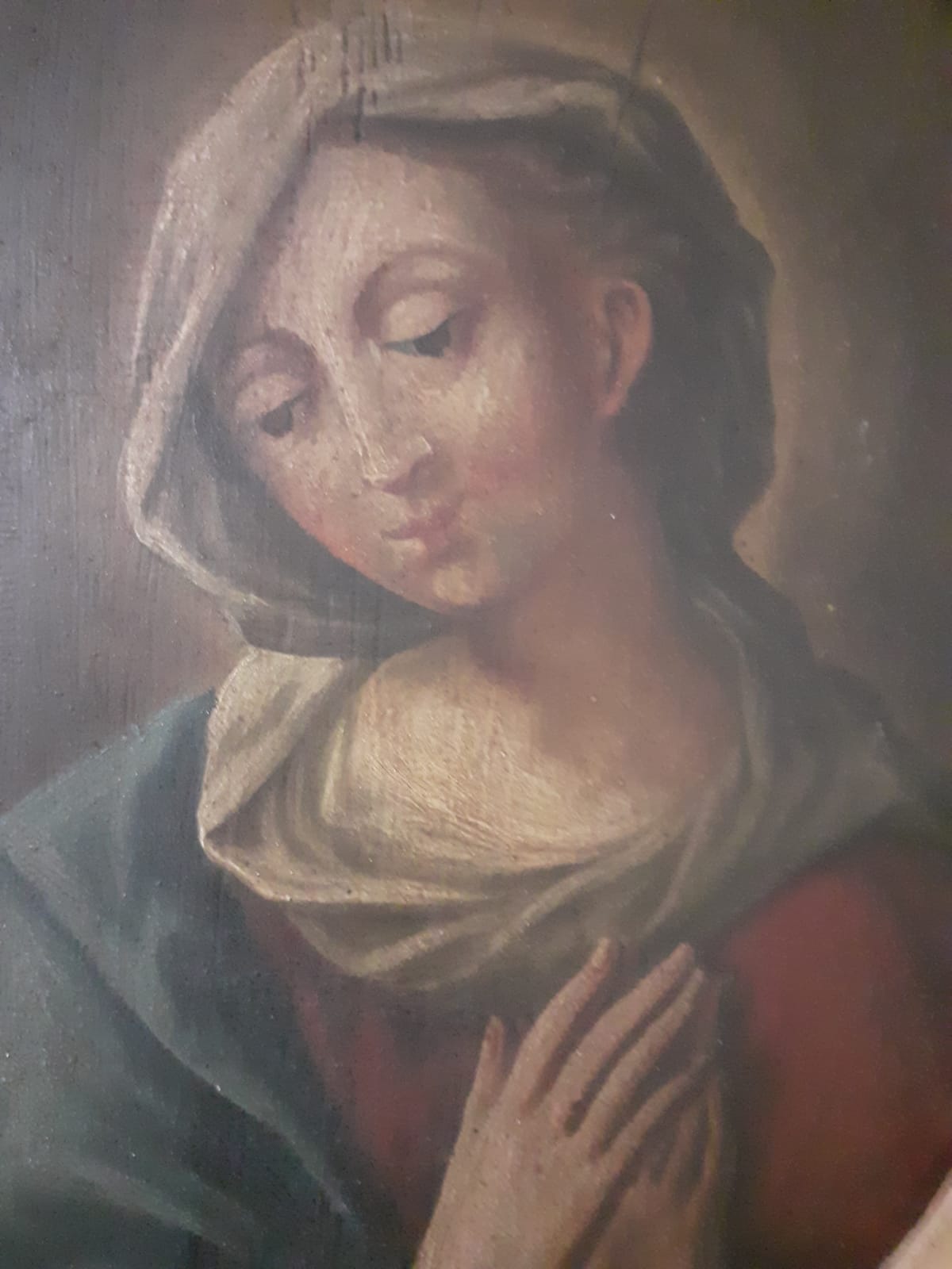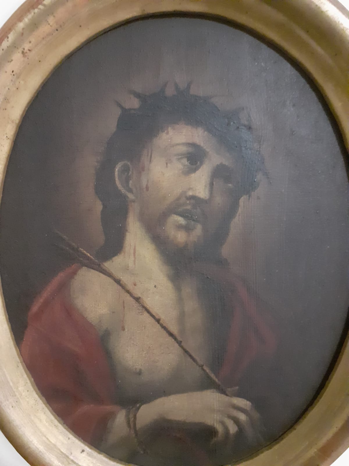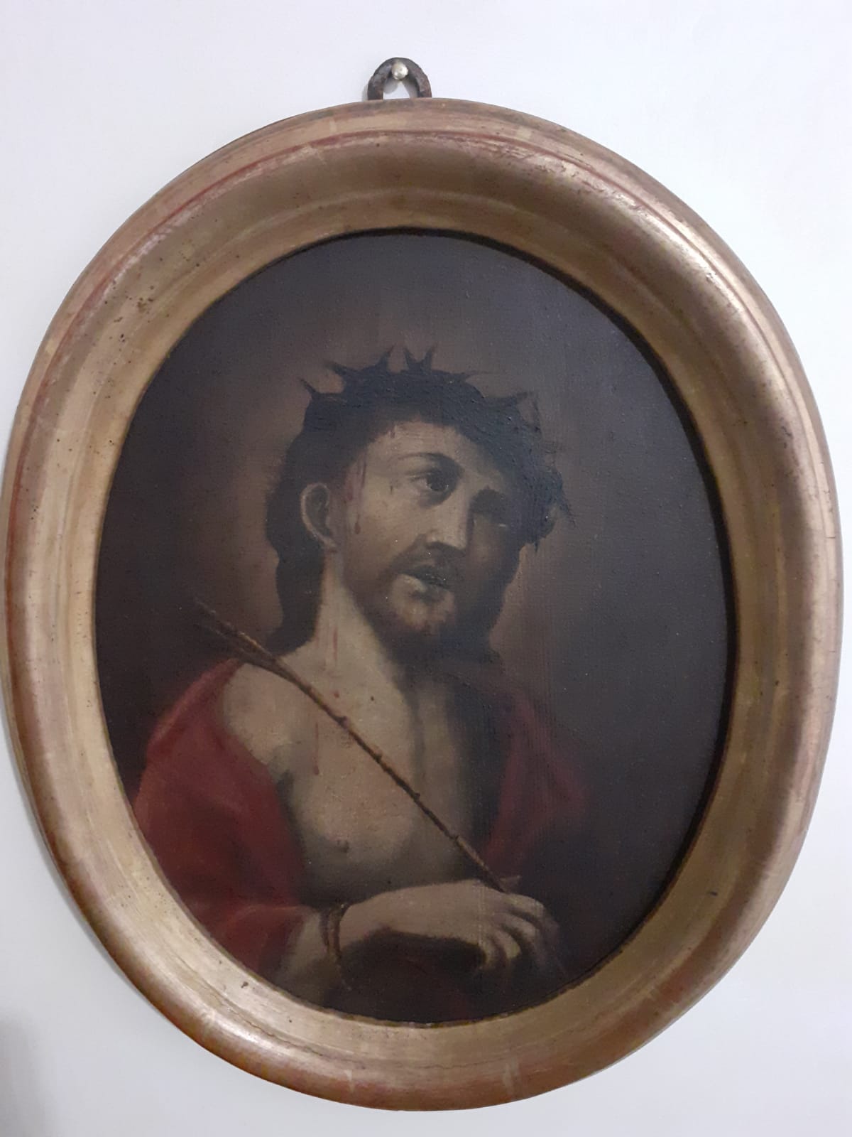 Coppia di 2 dipinti ovali con cornice a bolo dorate misura 45 cm raffigurante madonna ed ecco homo