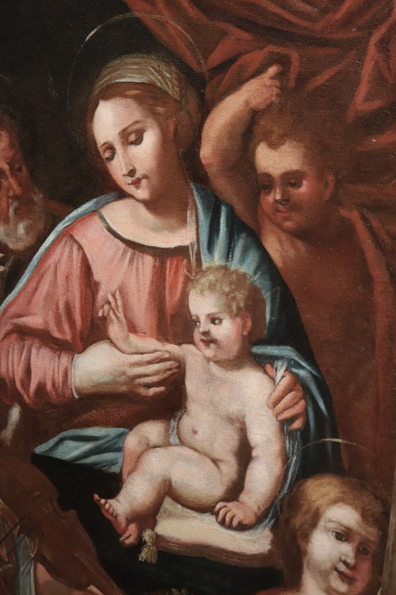 Interessante dipinto ad olio su tela raffigurante "Sacra Famiglia"