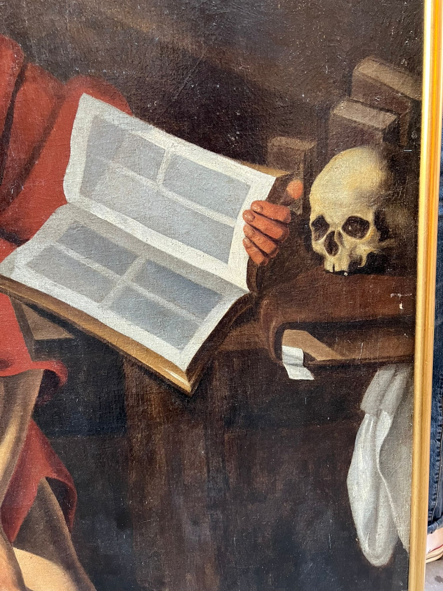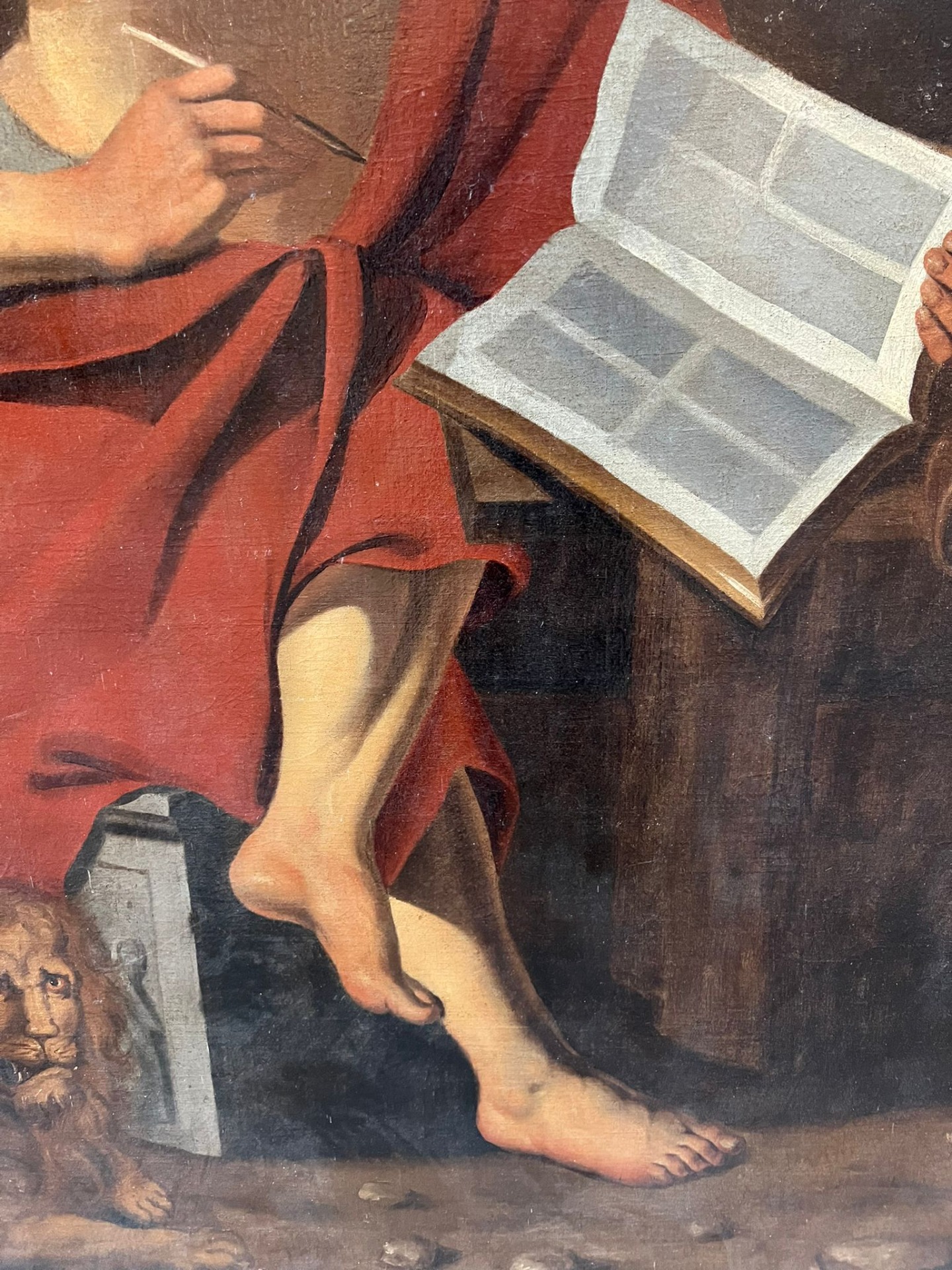 Bellissimo dipinto ad olio raffigurante San Girolamo, colto nel momento di meditazione e scrittura. Il santo è rappresentato seminudo, avvolto nel tipico mantello rosso, mentre con una mano sorregge un grande volume aperto e con l’altra tiene una penna, in un gesto che sottolinea la sua attività di traduttore e dottore della Chiesa.