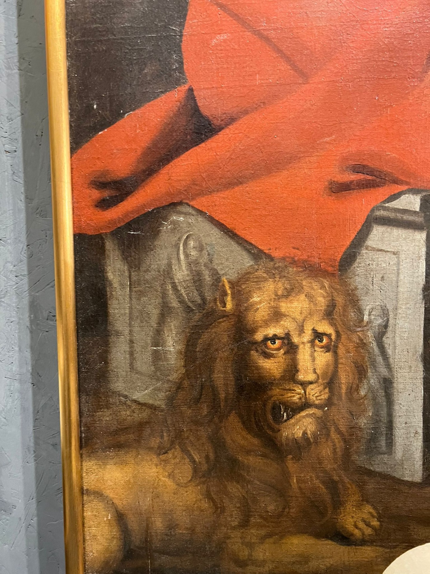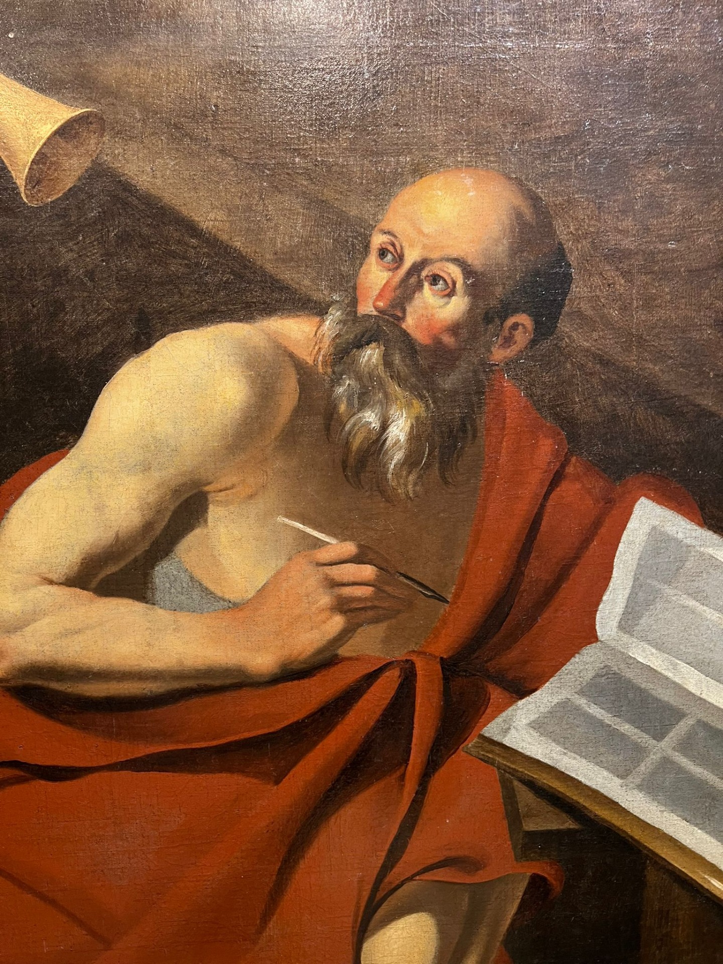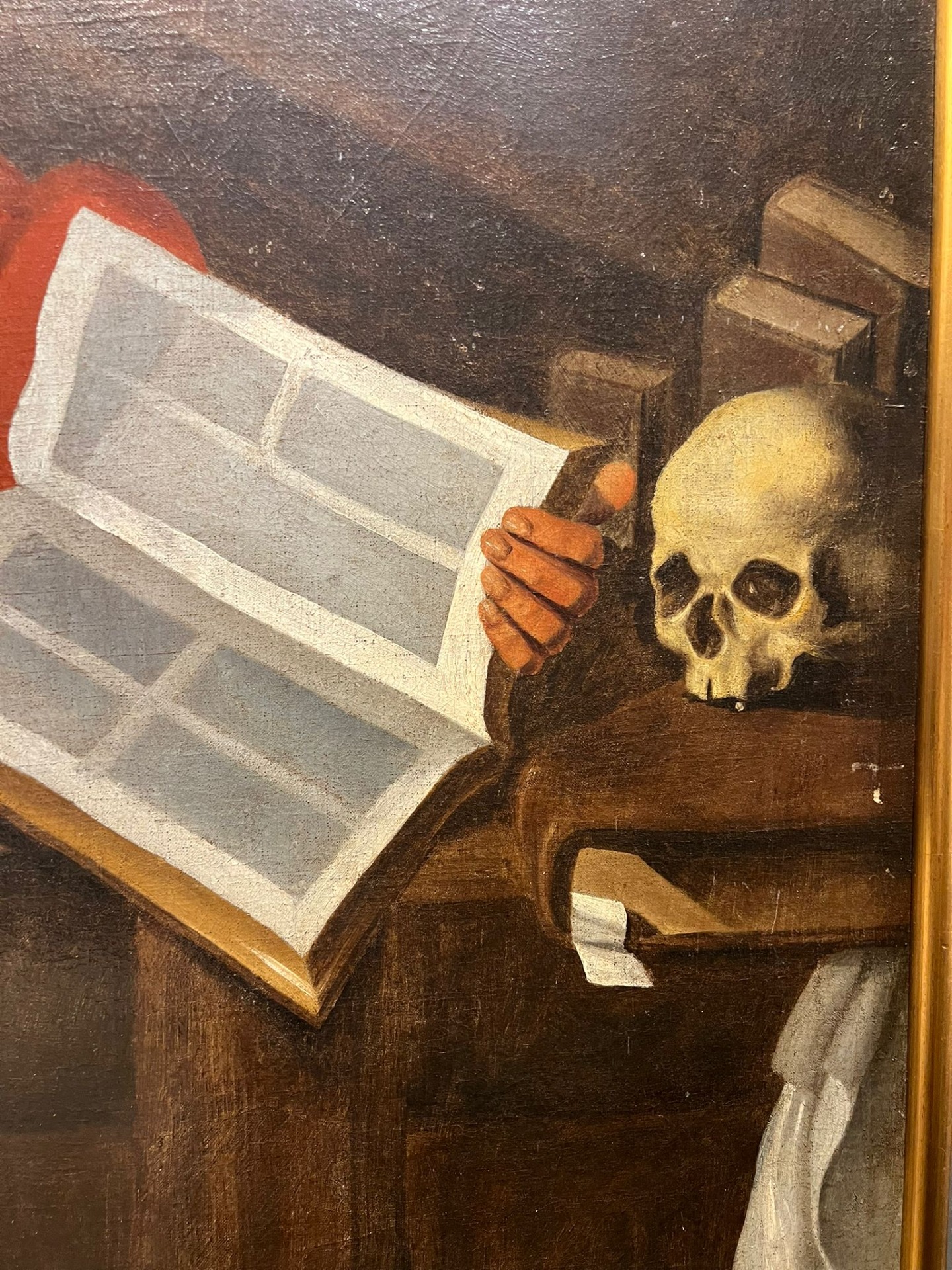 Bellissimo dipinto ad olio raffigurante San Girolamo, colto nel momento di meditazione e scrittura. Il santo è rappresentato seminudo, avvolto nel tipico mantello rosso, mentre con una mano sorregge un grande volume aperto e con l’altra tiene una penna, in un gesto che sottolinea la sua attività di traduttore e dottore della Chiesa.