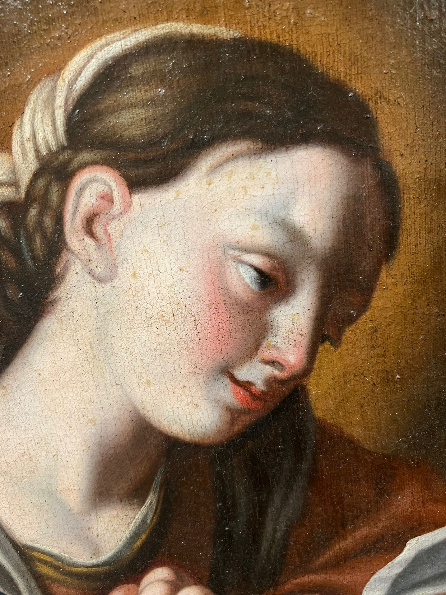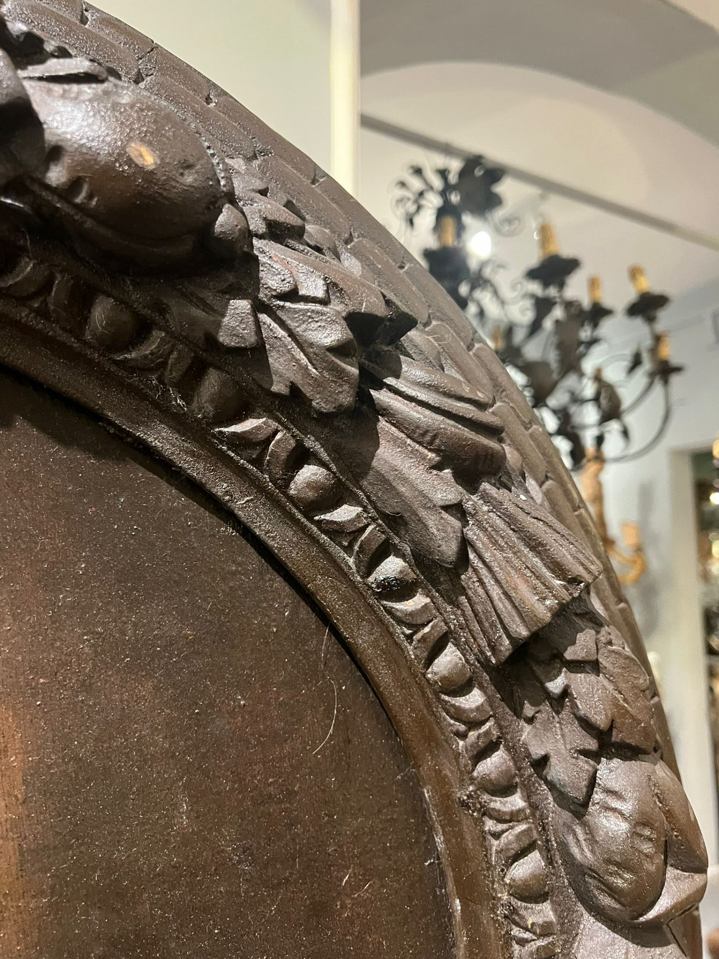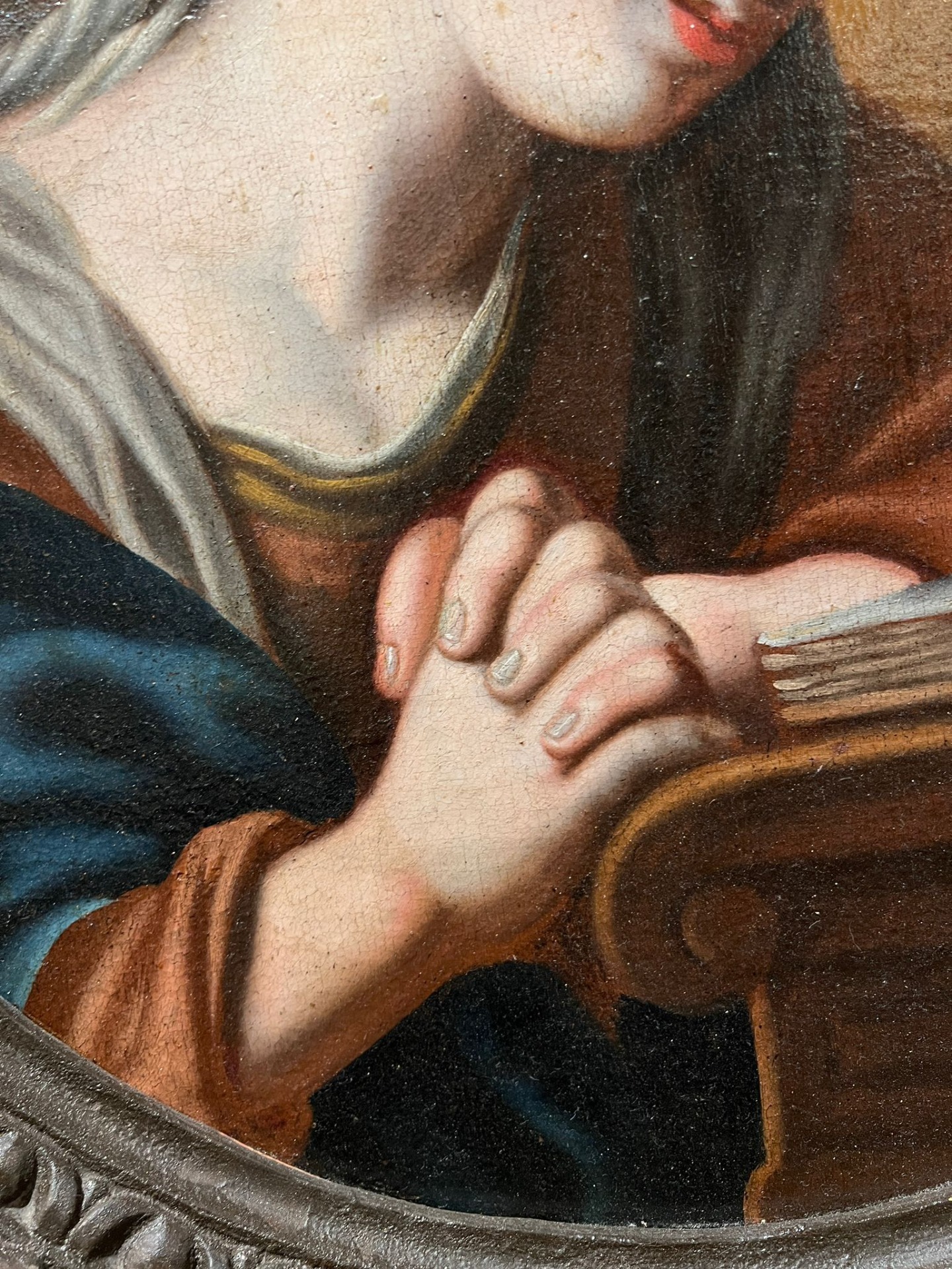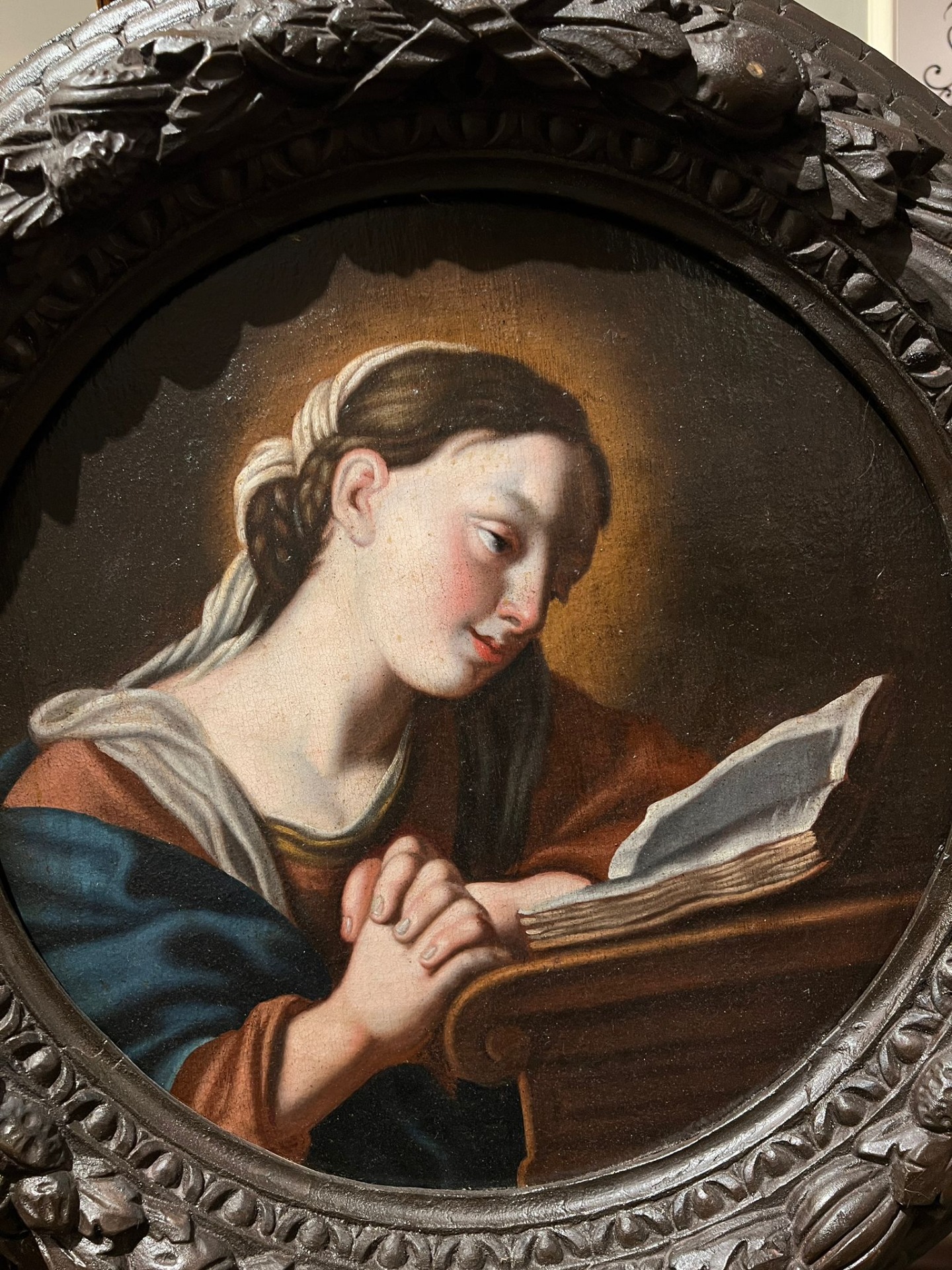 Raffinato dipinto ad olio sula raffigurante la Madonna colta in un momento di intensa meditazione e ritratta nell’atto di leggere un libro sacro, simbolo di devozione e sapienza spirituale.Cornice non coeva, del XVIII secolo, di forma circolare, in legno intagliato e scolpito con motivi naturalistici.